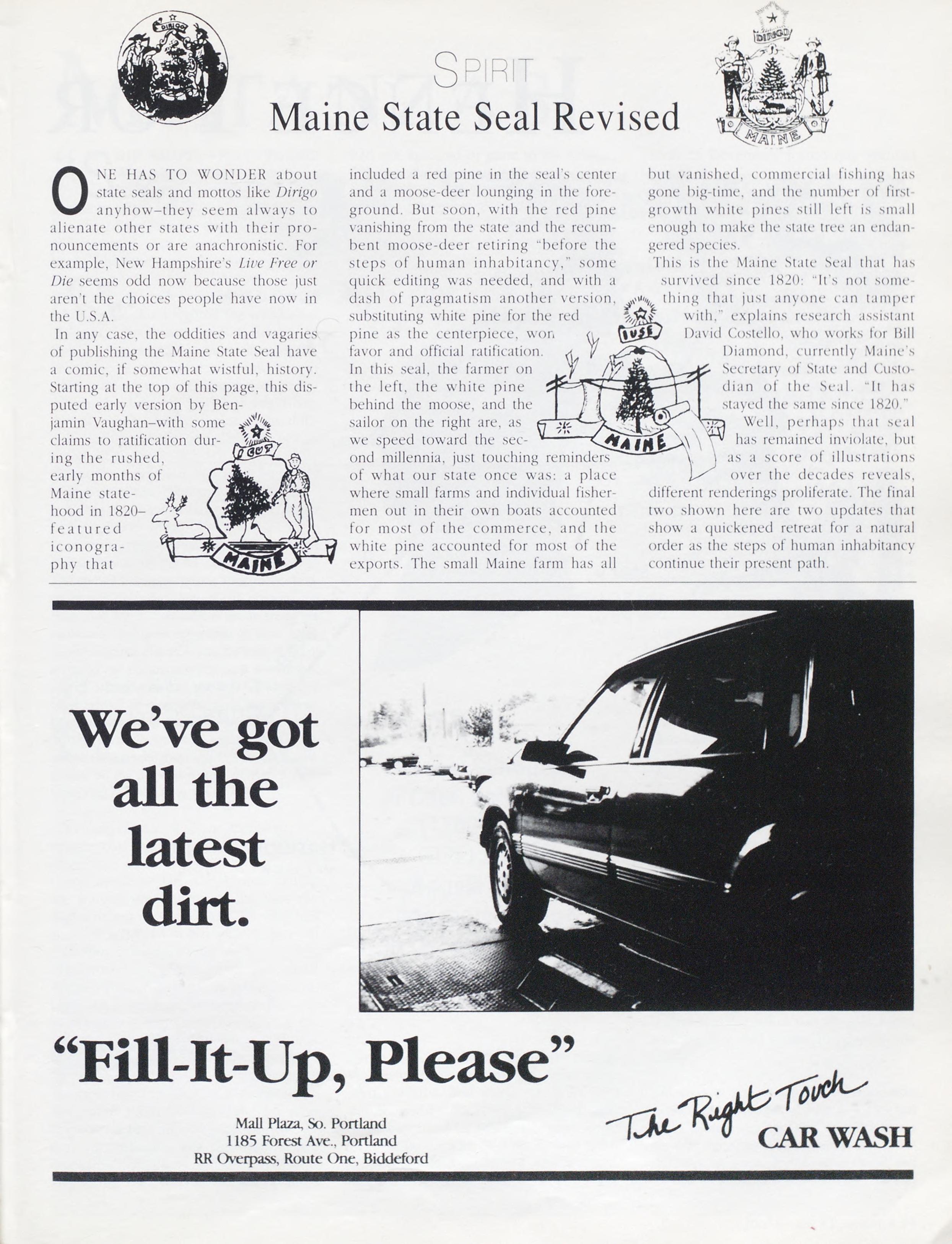 ThisistheMaineStaleSealthathas survivedsince1821):"It'snotsomethingthatjustanyonecantamper with,"explainsresearchassistant DavidCostello,whoworksforBill Diamond,currentlyMaines SecretaryolStaleandCusto¬ dianoftheSeal."Ithas stayedthesamesince1820." Well,perhapsthatseal hasremainedinviolate,but asascoreofillustrations overthedecadesreveals, differentrenderingsproliferate.Thefinal twoshownherearetwoupdatesthat showaquickenedretreatforanatural orderasthestepsofhumaninhabitancy continuetheirpresentpath.