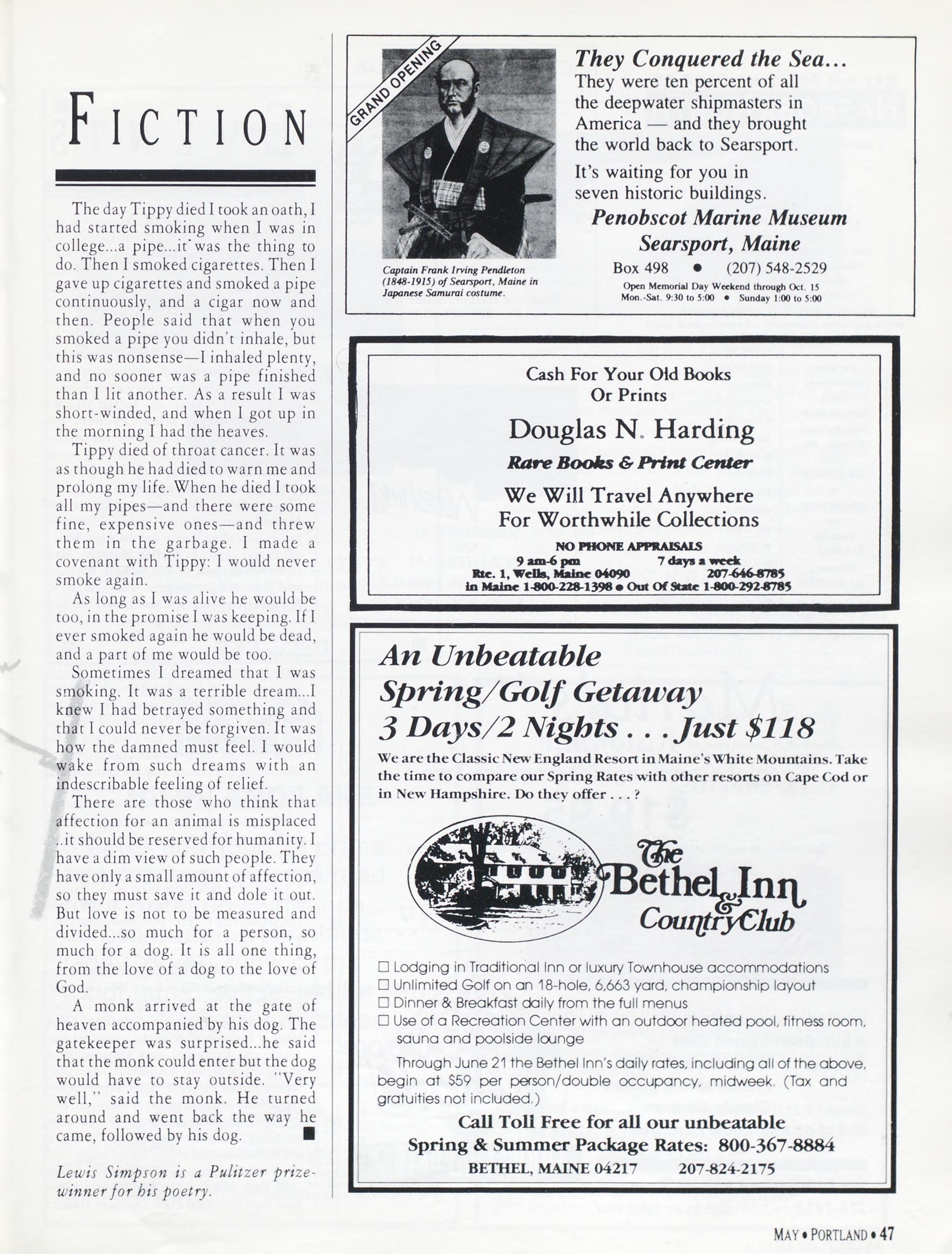 A monk arrived at the gate of heavenaccompaniedbyhisdog.The gatekeeperwassurprised...hesaid thatthemonkcouldenterbutthedog wouldhavetostayoutside."Very well,” said the monk. He turned around and went back the way he came, followed by his dog. B LewisSimpsonisaPulitzerprize¬ winnerforhispoetry.