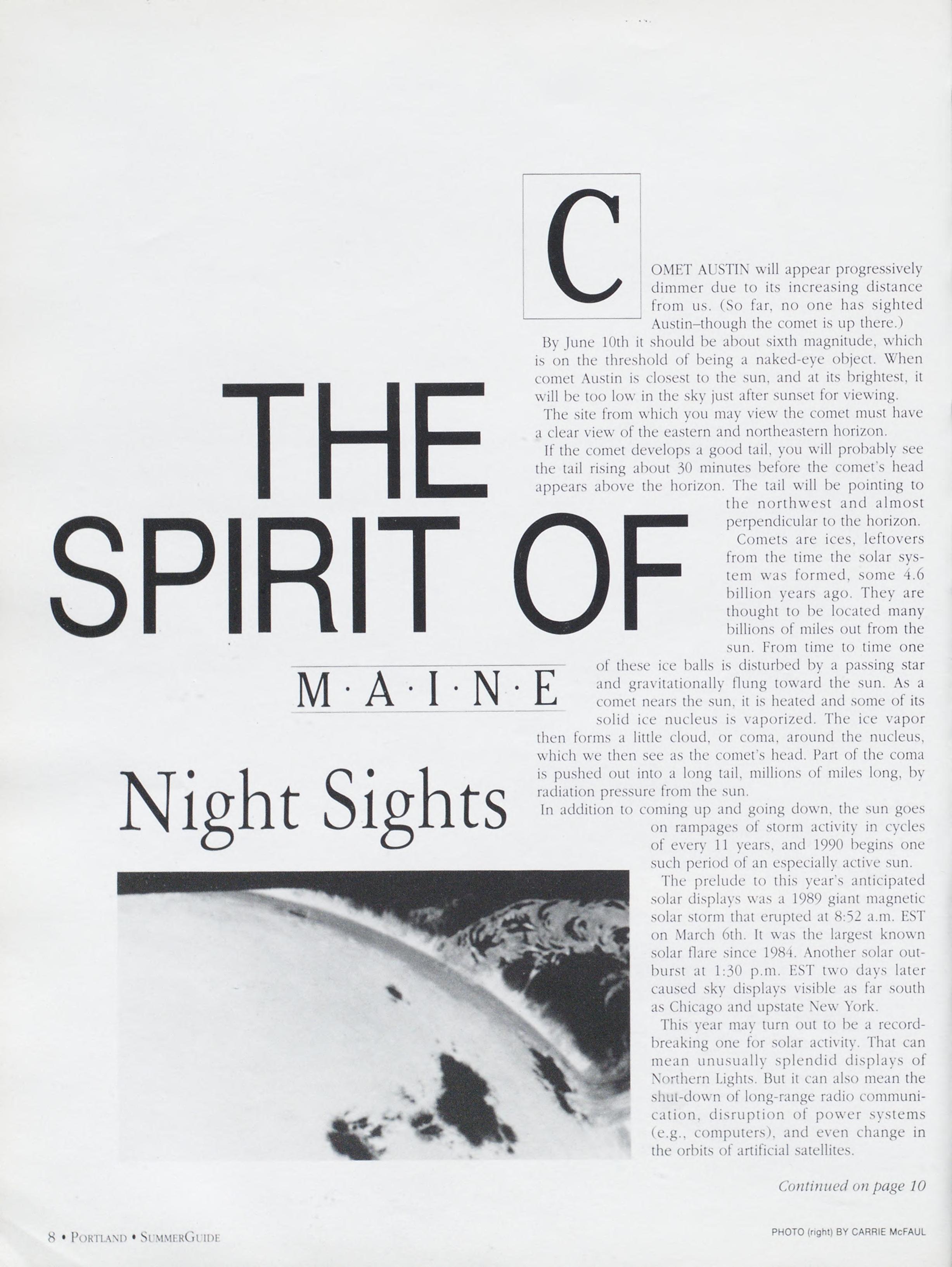 SPIRIT OF MAINE NightSights perpendiculartothehorizon. Cometsareices,leftovers fromthetimethesolarsys¬ tem was formed, some i.6 billionyearsago.Theyare thoughttobelocatedmany billionsofmilesoutfromthe sun.Fromtimetolimeone