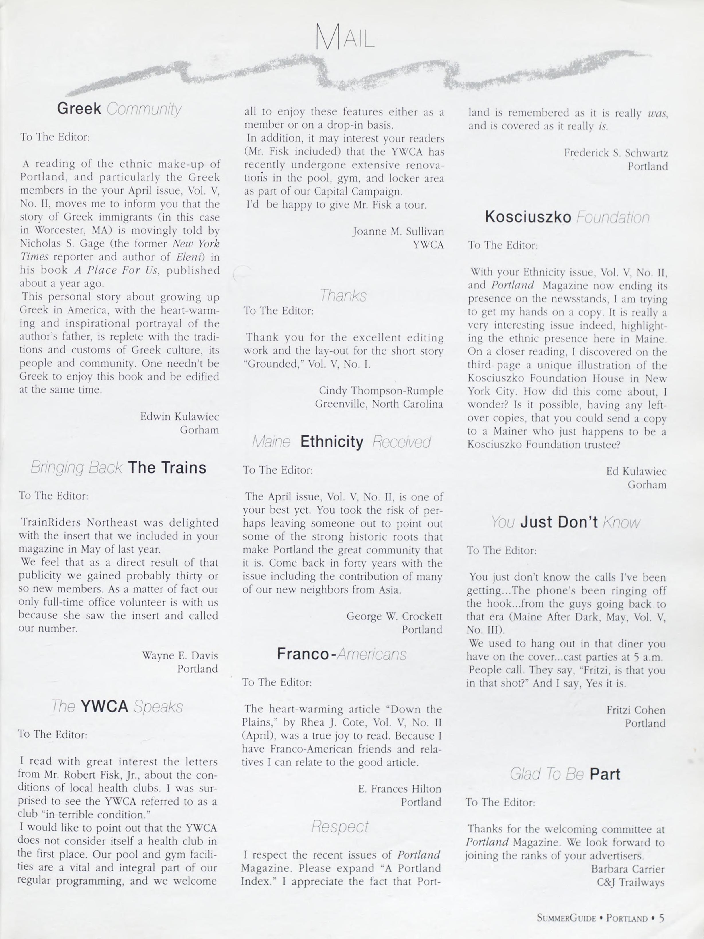 WithyourEthnicityissue,Vol.V,No.II, and PortlandMagazinenowendingits presenceonthenewsstands,Iamtrying togetmyhandsonacopy.Itisreallya veryinterestingissueindeed,highlight¬ ingtheethnicpresencehereinMaine Onacloserreading,Idiscoveredonthe thirdpageauniqueillustrationofthe KosciuszkoFoundationHouseinNew YorkCity.Howdidthiscomeabout,I wonder?Isitpossible,havinganyleft¬ overcopies,thatyoucouldsendacopy toaMainerwhojusthappenstobea KosciuszkoFoundationtrustee?