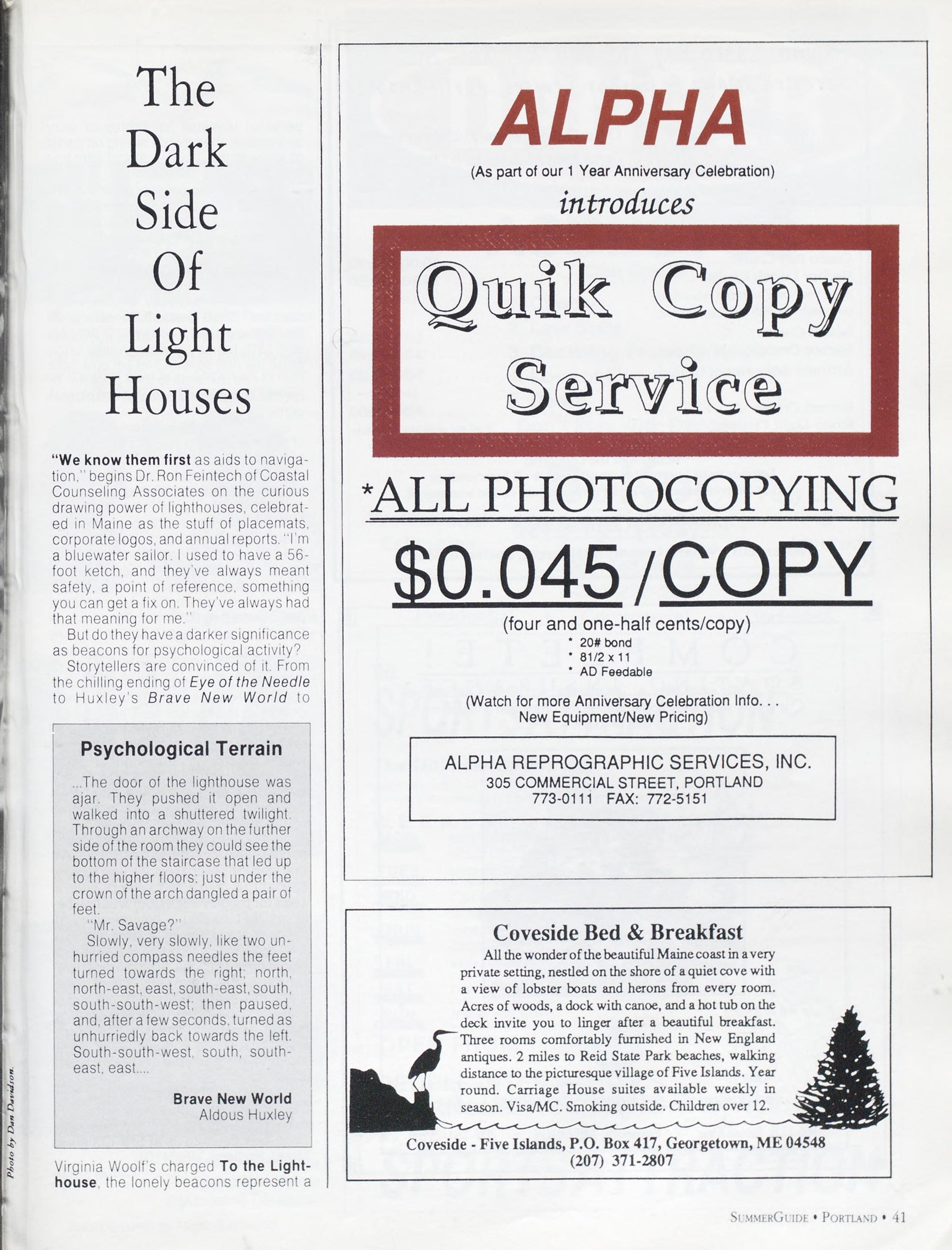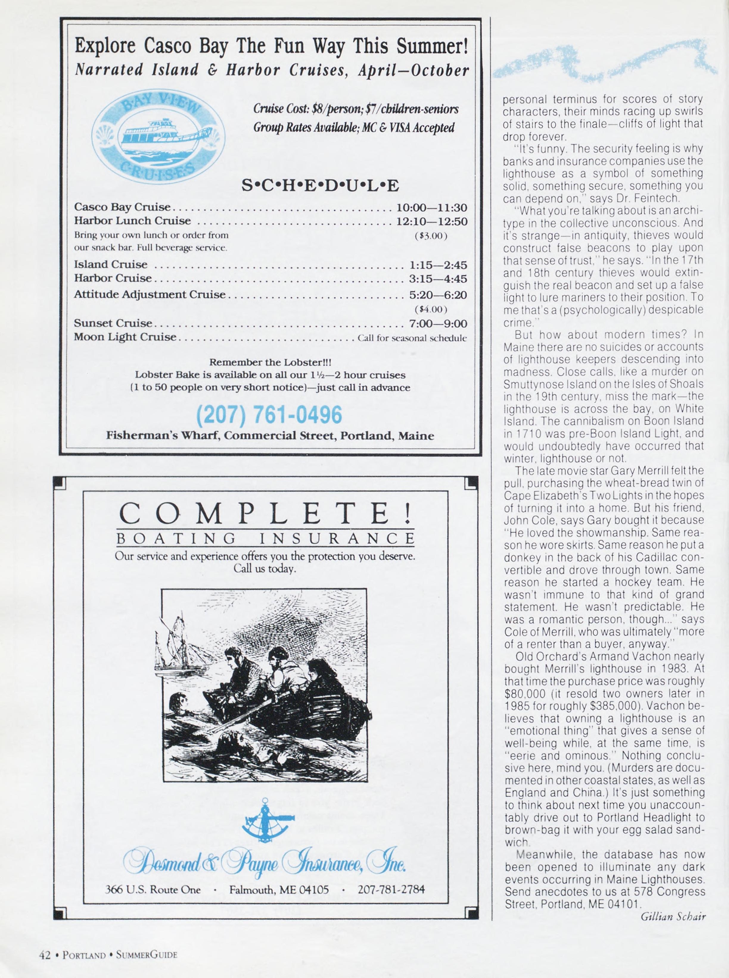 Meanwhile,thedatabasehasnow beenopenedtoilluminateanydark eventsoccurringinMaineLighthouses. Sendanecdotestousat578Congress Street.Portland,ME04101. GillianSchair
