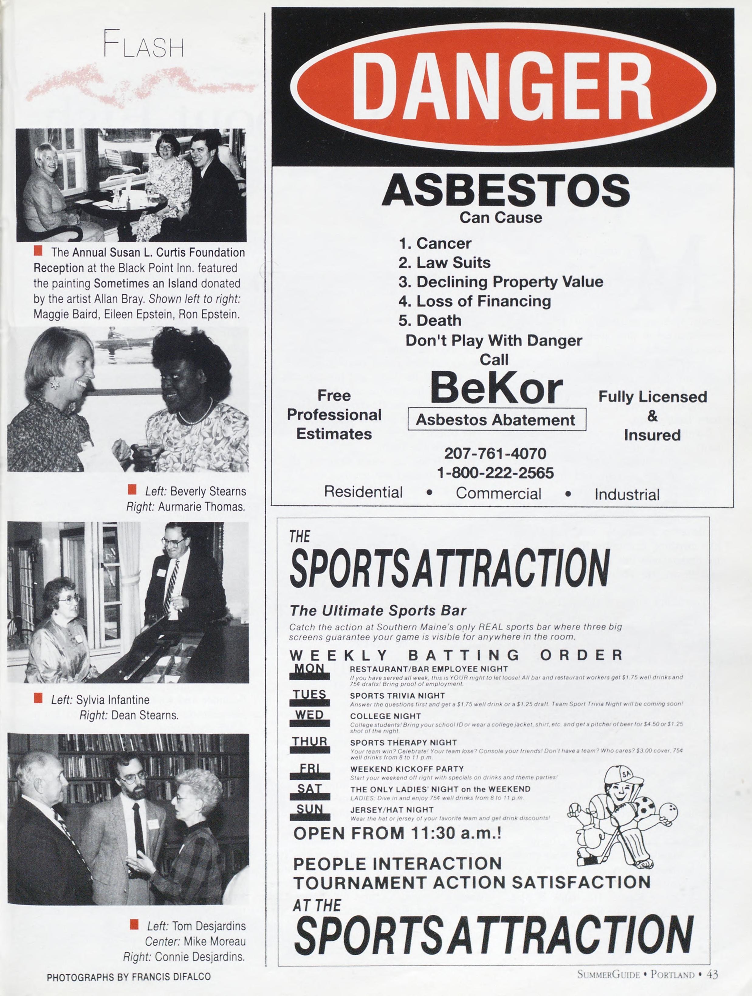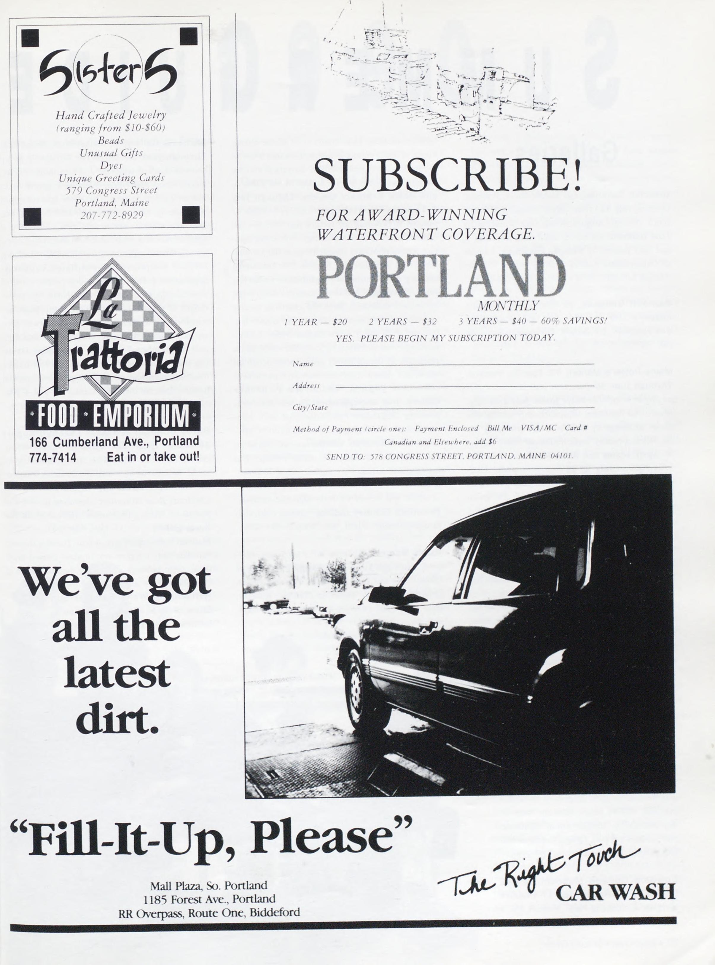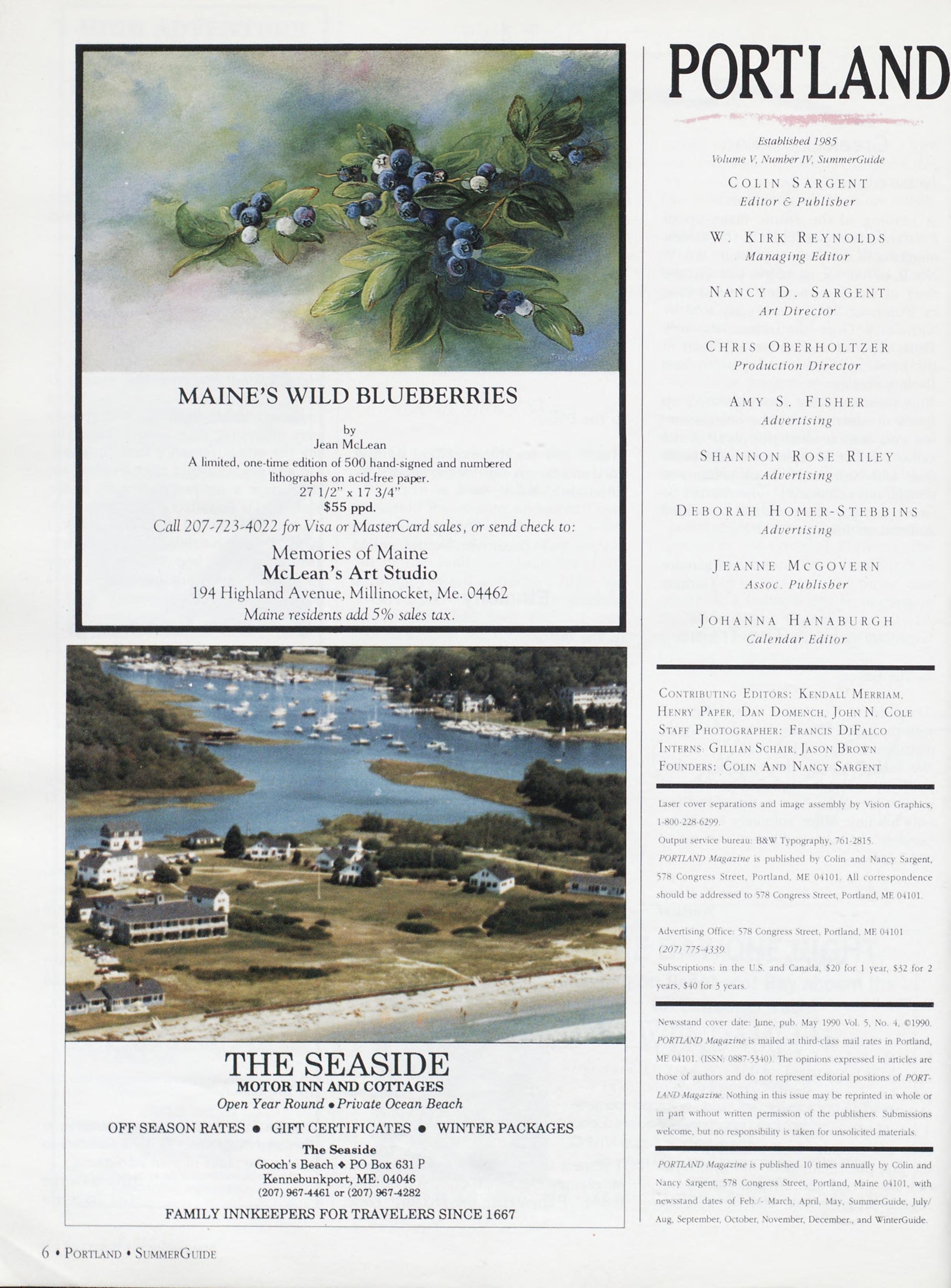Newsstandcoverdate:June,pub.May1990Vol.5,No.4.01990. PORTLAND Magazineismailedatthird-classmailratestnPortland, ME0»101(ISSN088^.5340).Theopinionsexpressedinarticlesare thoseotauthorsanddonotrepresenteditorialpositionsofPORT¬ LANDMagazini-NothinginthisissuemayIk*reprintedinwholeor inpartwithoutwrittenpermissionofthepublishersSubmissions welcome,butnoresponsibilityistakenforunsolicitedmaterials