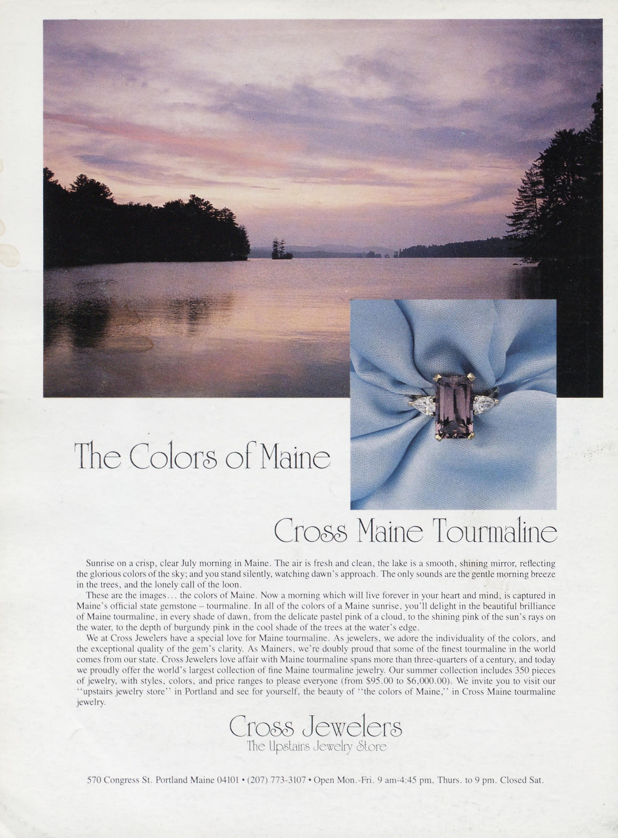 WeatCrossJewelershaveaspecialloveforMainetourmaline.Asjewelers,wcadoretheindividualityofthecolors,and theexceptionalqualityofthegem’sclarity.AsMainers,we’redoublyproudthatsomeofthefinesttourmalineintheworld comesfromourstate.CrossJewelersloveaffairwithMainetourmalinespansmorethanthree-quartersofacentury,andtoday weproudlyoffertheworld'slargestcollectionoffineMainetourmalinejewelry.Oursummercollectionincludes350pieces ofjewelry,withstyles,colors,andpricerangestopleaseeveryone(fromS95.OOtoS6.000.00).Wcinviteyoutovisitour "upstairsjewelrystore"inPortlandandseeforyourself,thebeautyof"thecolorsofMaine."inCrossMainetourmaline jewelry.