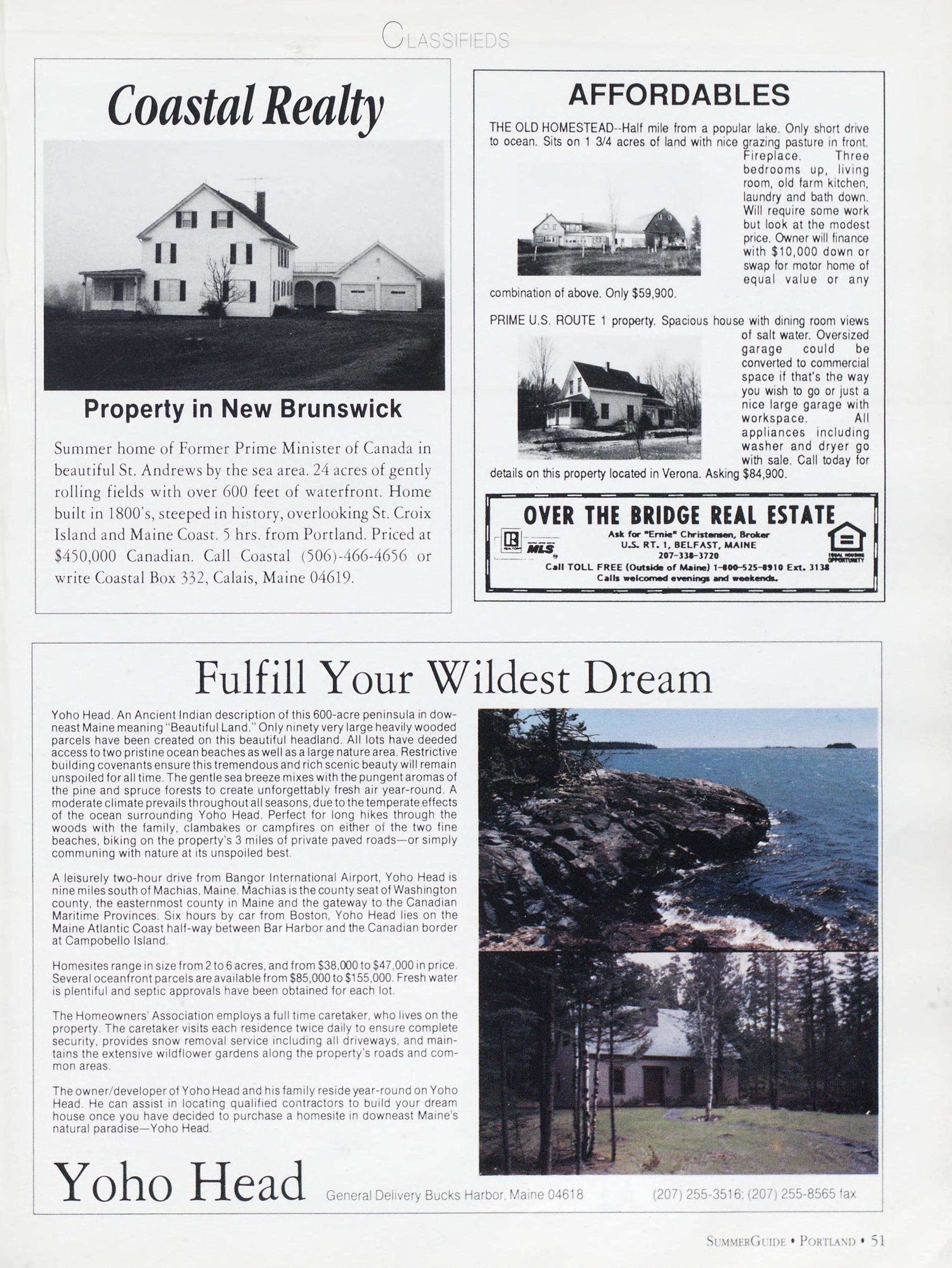 OVERTHEBRIDGEREALESTATE FulfillYourWildestDream YohoHead.AnAncientIndiandescriptionofthis600-acrepeninsulaindow¬ neastMainemeaning“BeautifulLand."Onlyninetyverylargeheavilywooded parcelshavebeencreatedonthisbeautifulheadland.Alllotshavedeeded accesstotwopristineoceanbeachesaswellasalargenaturearea.Restrictive buildingcovenantsensurethistremendousandrichscenicbeautywillremain unspoiledforalltime.Thegentleseabreezemixeswiththepungentaromasof thepineandspruceforeststocreateunforgettablyfreshairyear-round.A moderateclimateprevailsthroughoutallseasons,duetothetemperateeffects of the ocean surrounding Yoho Head. Perfect for long hikes through the woods with the family, clambakes or campfires on either of the two fine beaches,bikingontheproperty's3milesofprivatepavedroads—orsimply communingwithnatureatitsunspoiledbest.