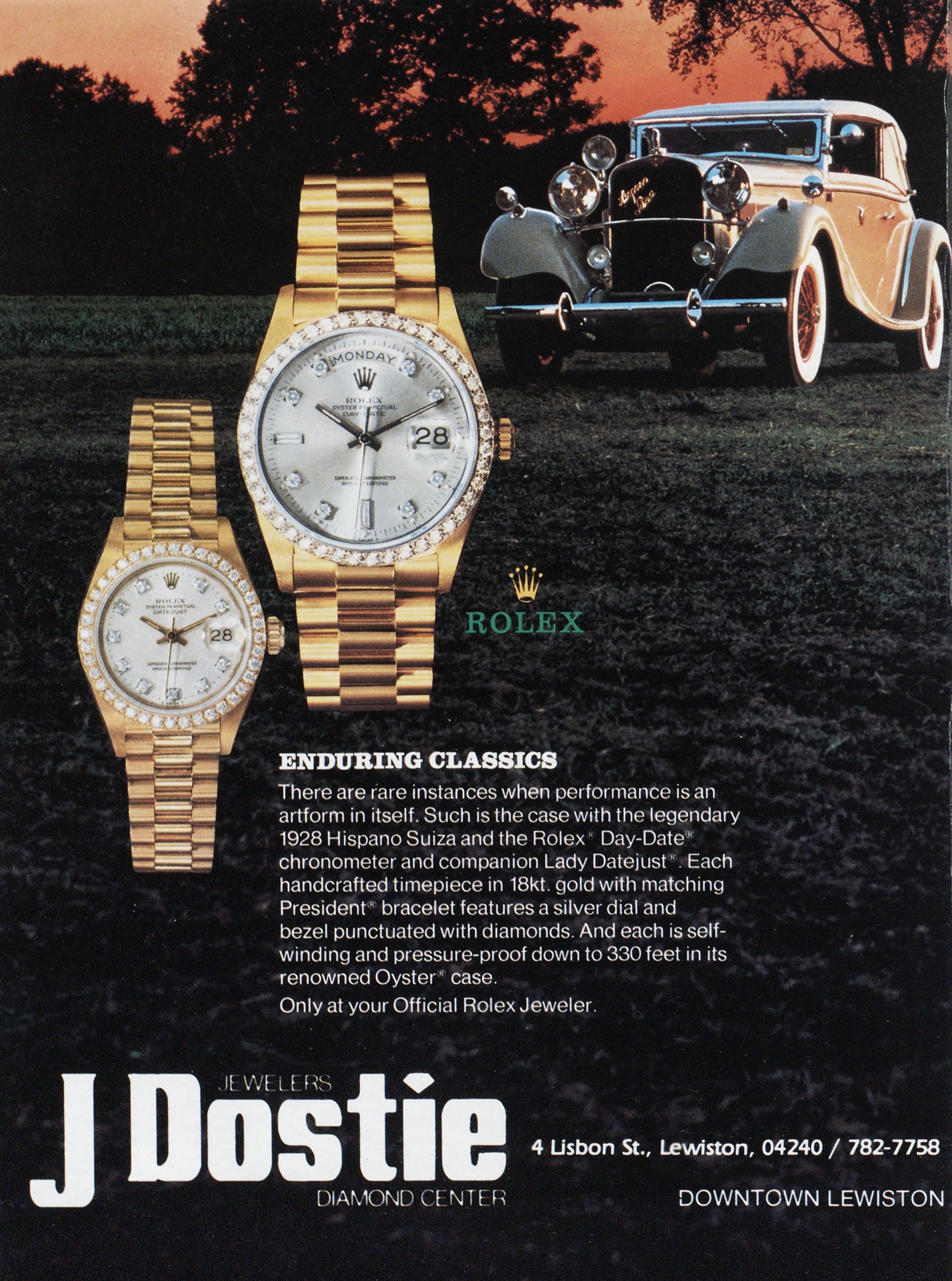 ENDURING CL ASSICS T * < * - . There are fare instances when performance is an • artform in itself. Such is the case with the legendary 1928 Hispano Suiza and the Rolex" Day-Datev chronometer and companion Lady Dateiust*. Each handcrafted timepiece in 18kt. gold with matching President*' bracelet features a silver Sial and 9bezel punctuated with diamonds. And each is self¬ winding and pressure-proof down to 330 feet in its renowned Oyster"' case.