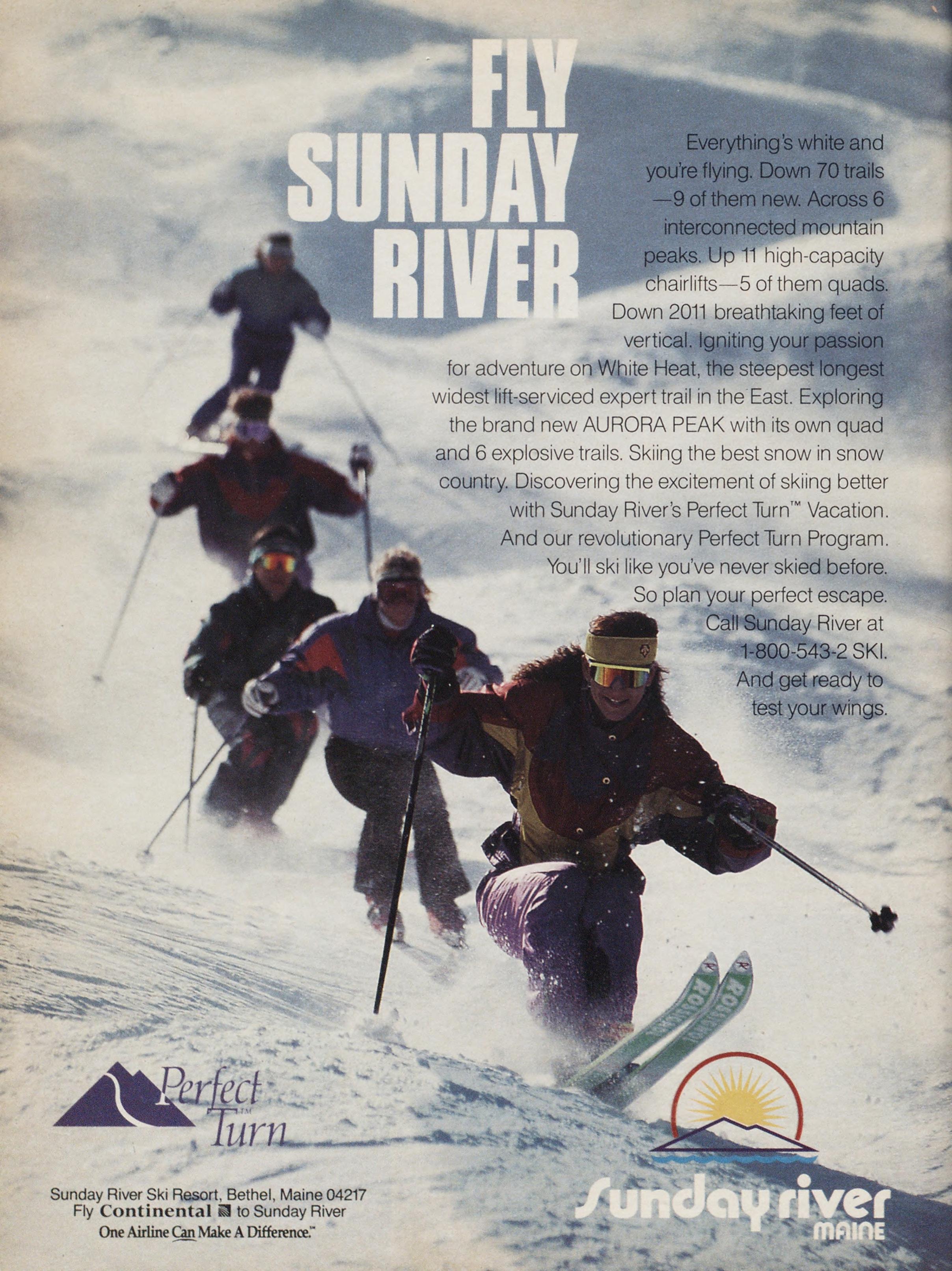 V'Everything’s white and -you’reflying.Down70trails —9 of them new. Across 6 interconnected mountain peaks. Up 11 high-capacity chairlifts—5ofthemquads. Down 2011 breathtaking feet of vertical.Ignitingyourpassion foradventureonWhiteHeat,thesteepestlongest widestlift-servicedexperttrailintheEast.Exploring the brand new AURORA PEAK with its own quad and6explosivetrails.Skiingthebestsnowinsnow country.Discoveringtheexcitementofskiingbetter withSundayRiver’sPerfectTurn™Vacation. AndourrevolutionaryPerfectTurnProgram. You’llskilikeyou’veneverskiedbefore. Soplanyourperfectescape. *\CallSundayRiverat *-^<i:800-543-2SKI. ' And gefready to testyourwings.