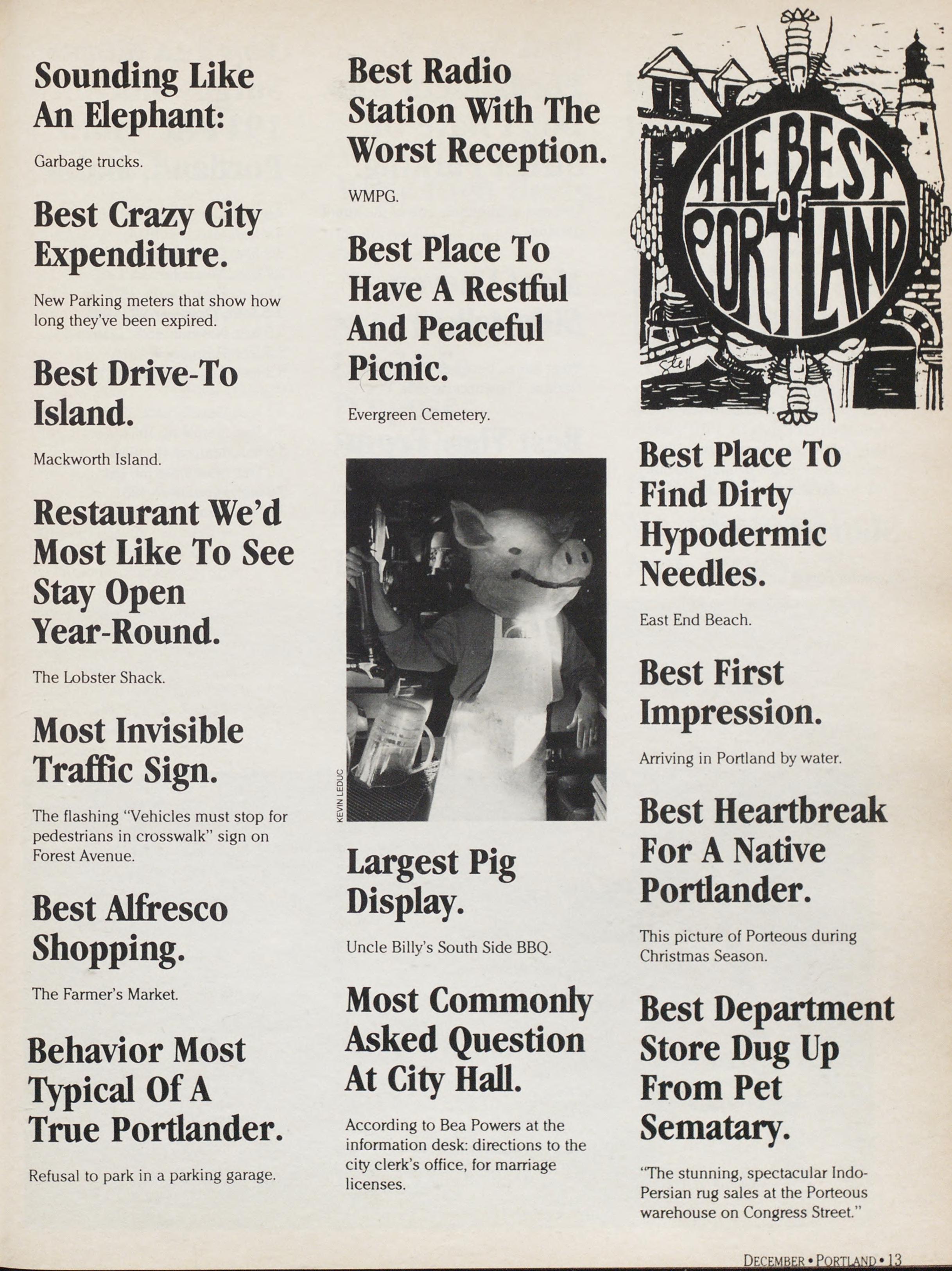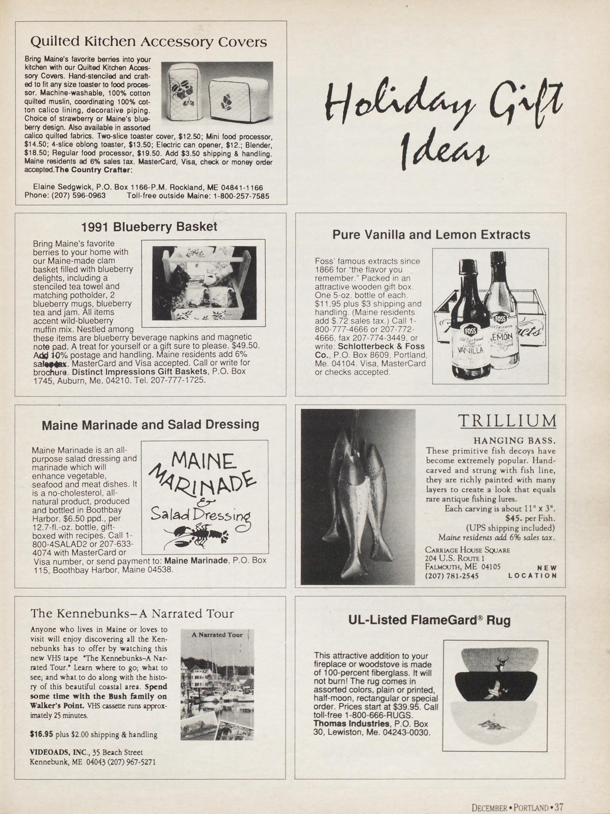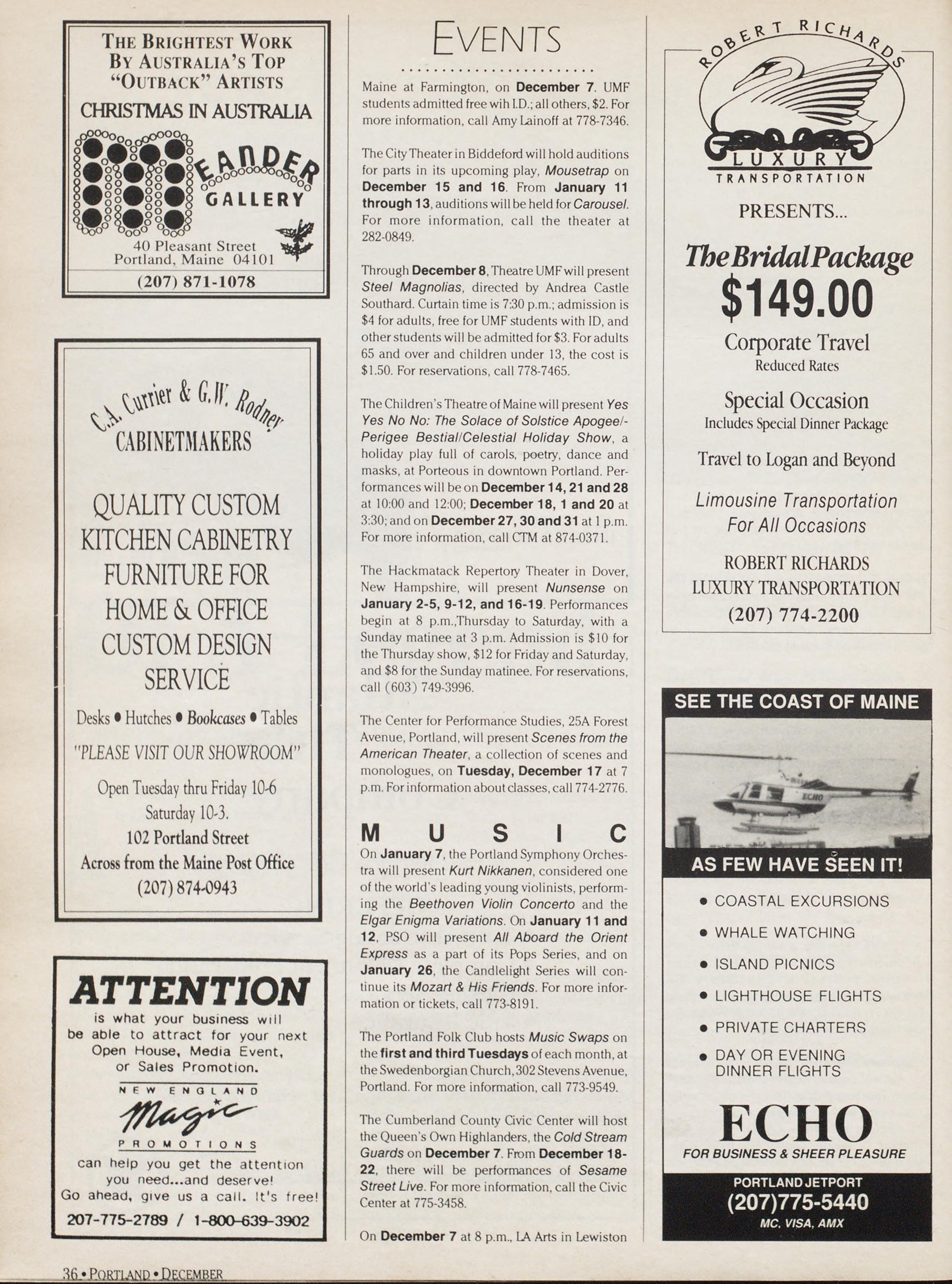 Newsstand cover date: December 1991, publ. Novem¬ ber 1991, Vol. 6, No. 9. copyright 1991. PORTLAND MonthlyMagazineismailedatthird-classmailratesinPort¬ land, ME 04101. (ISSN: 0887-5340). Opinions ex¬ pressed in articles are those of authors and do not represent editorial positions of PORTLAND Monthly Magazine. Responsible only for that portion of any advertisement which is printed incorrectly, and as compensation we will run a correction in the following issue. Nothing in this issue may be reprinted in whole orinpartwithoutwrittenpermissionfromthepublish¬ ers. Submissions welcome, but we take no responsibil¬ ityforunsolicitedmaterials.