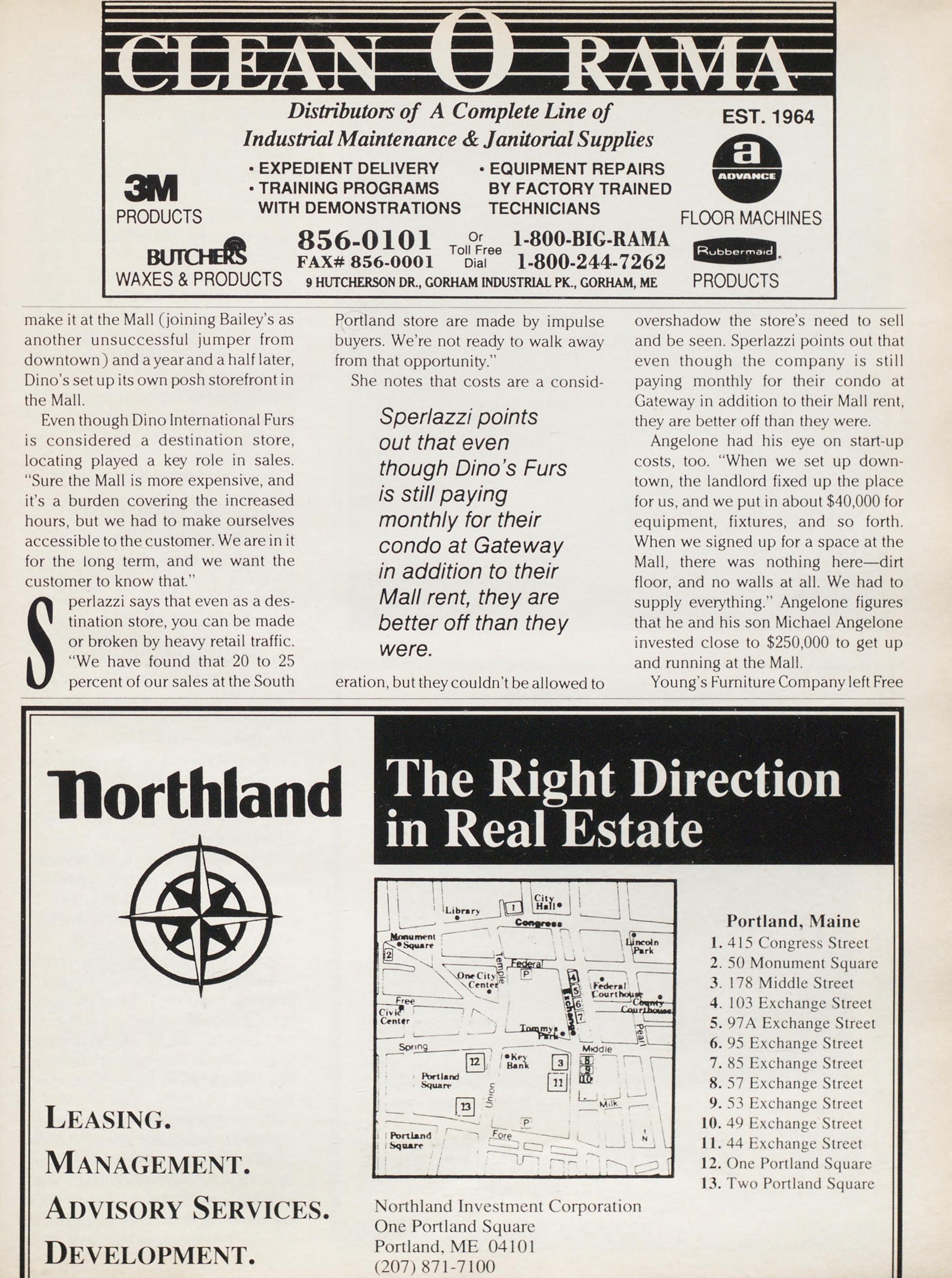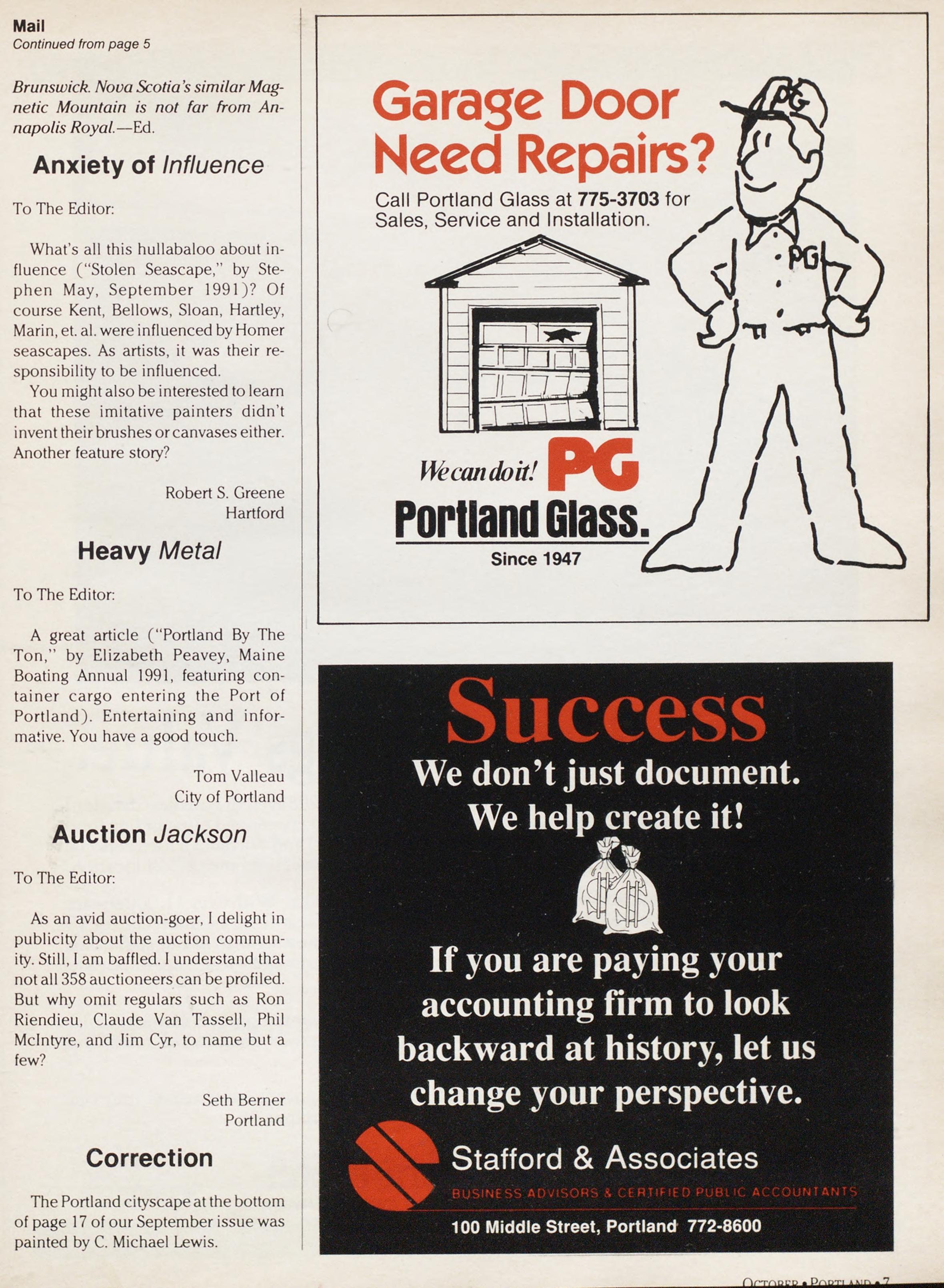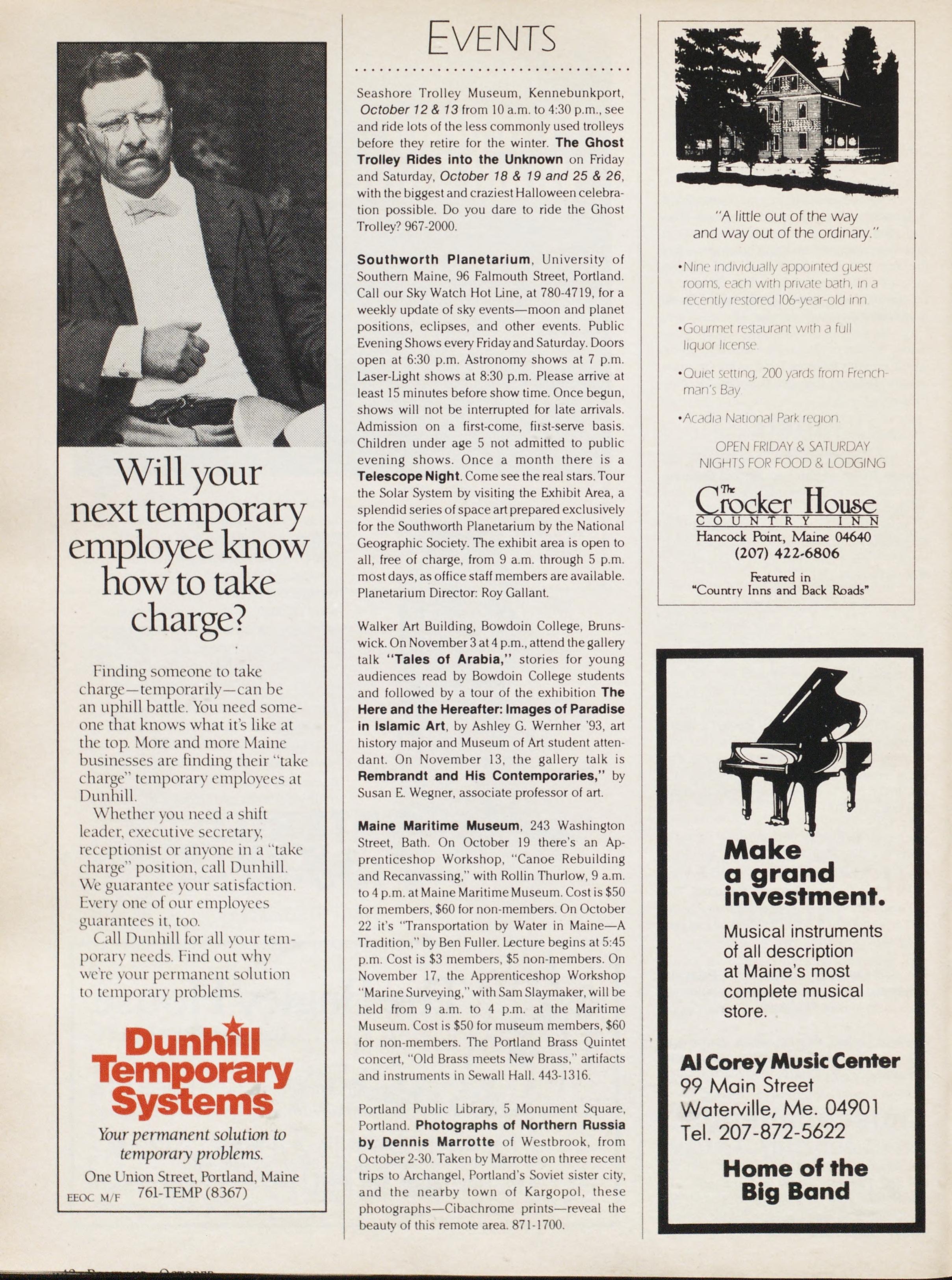Newsstand cover date: October 1991, pubL September 1991. Vol. 6. No. 7, copyright 1991. PORTLAND Monthly Magazine is mailed at third-class mail rates in Port¬ land, ME 04101. ( ISSN: 0887-5340). Opinions expressed in articles are those of authors and do not represent editorial positions of PORTLAND Monthly Magazine. Responsible only for that portion of any advertisement which is printed incorrectly, and as compensation we willrunacorrectioninthefollowingissue.Nothingin thisissuemaybereprintedinwholeorinpartwithout written permission from the publishers. Submissions welcome, but we lake no responsibility lor unsolicited materials.
