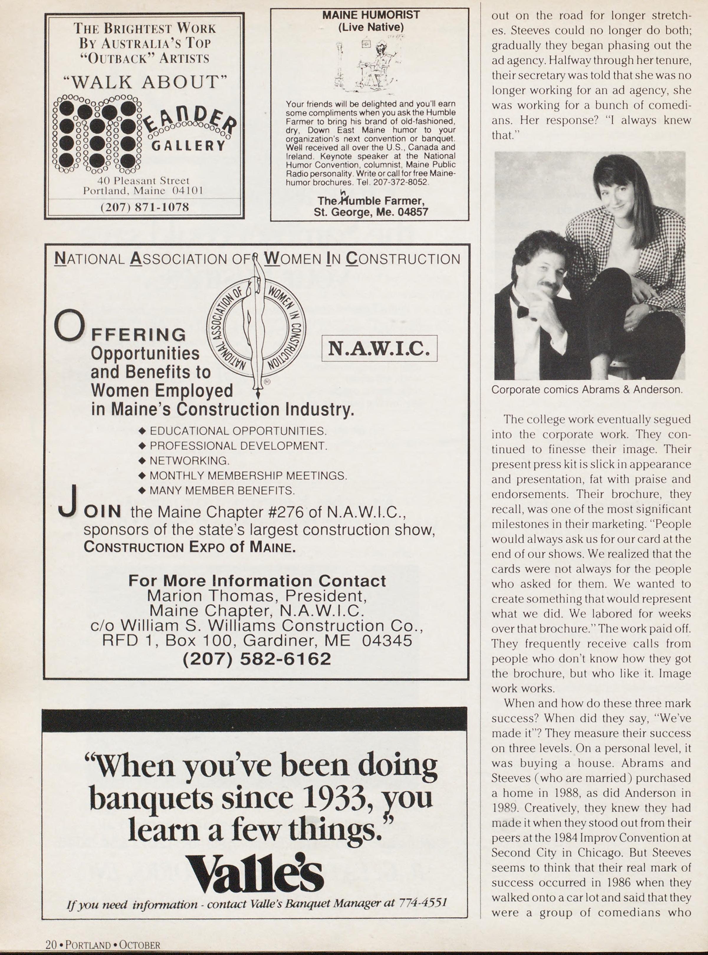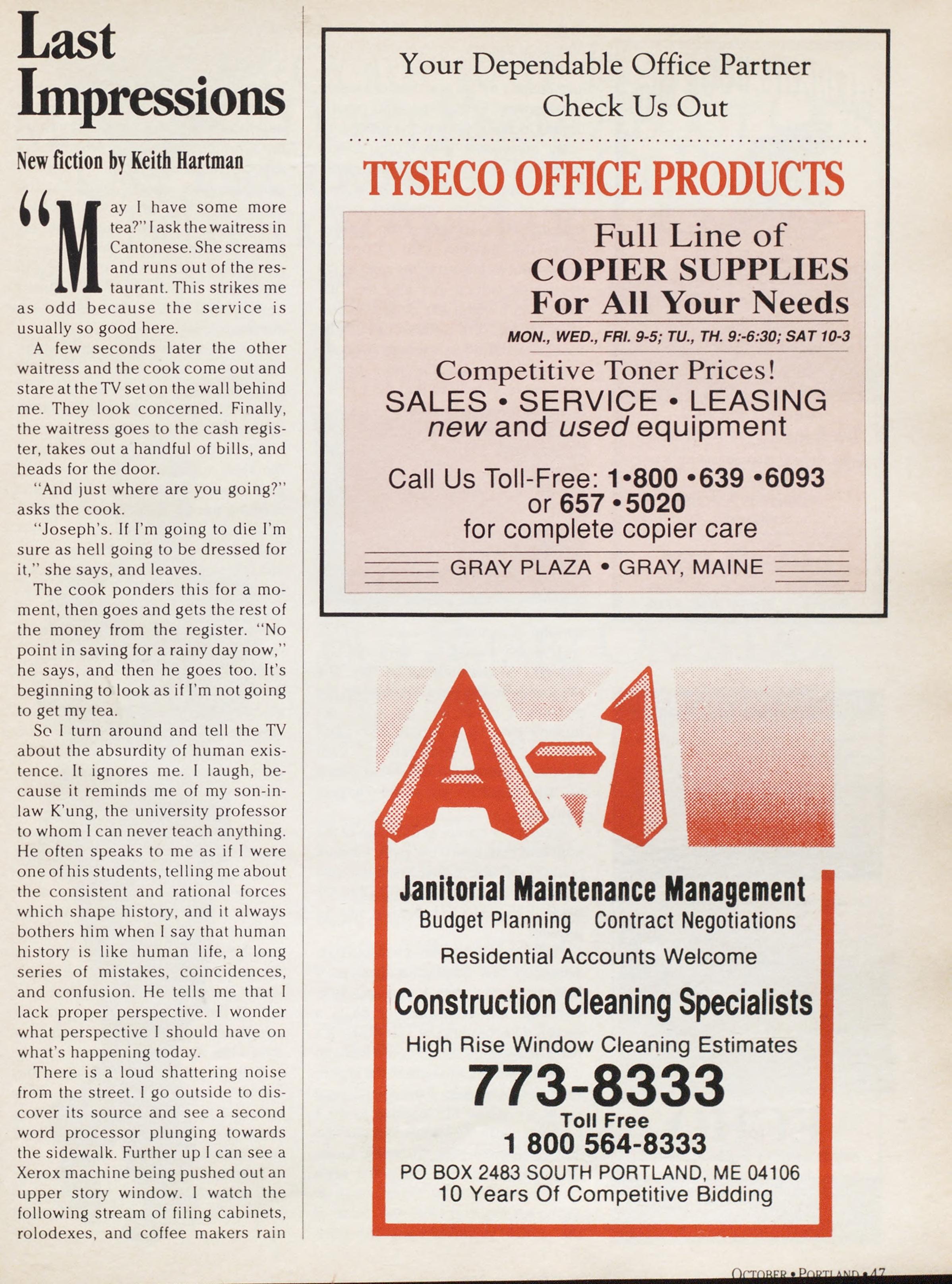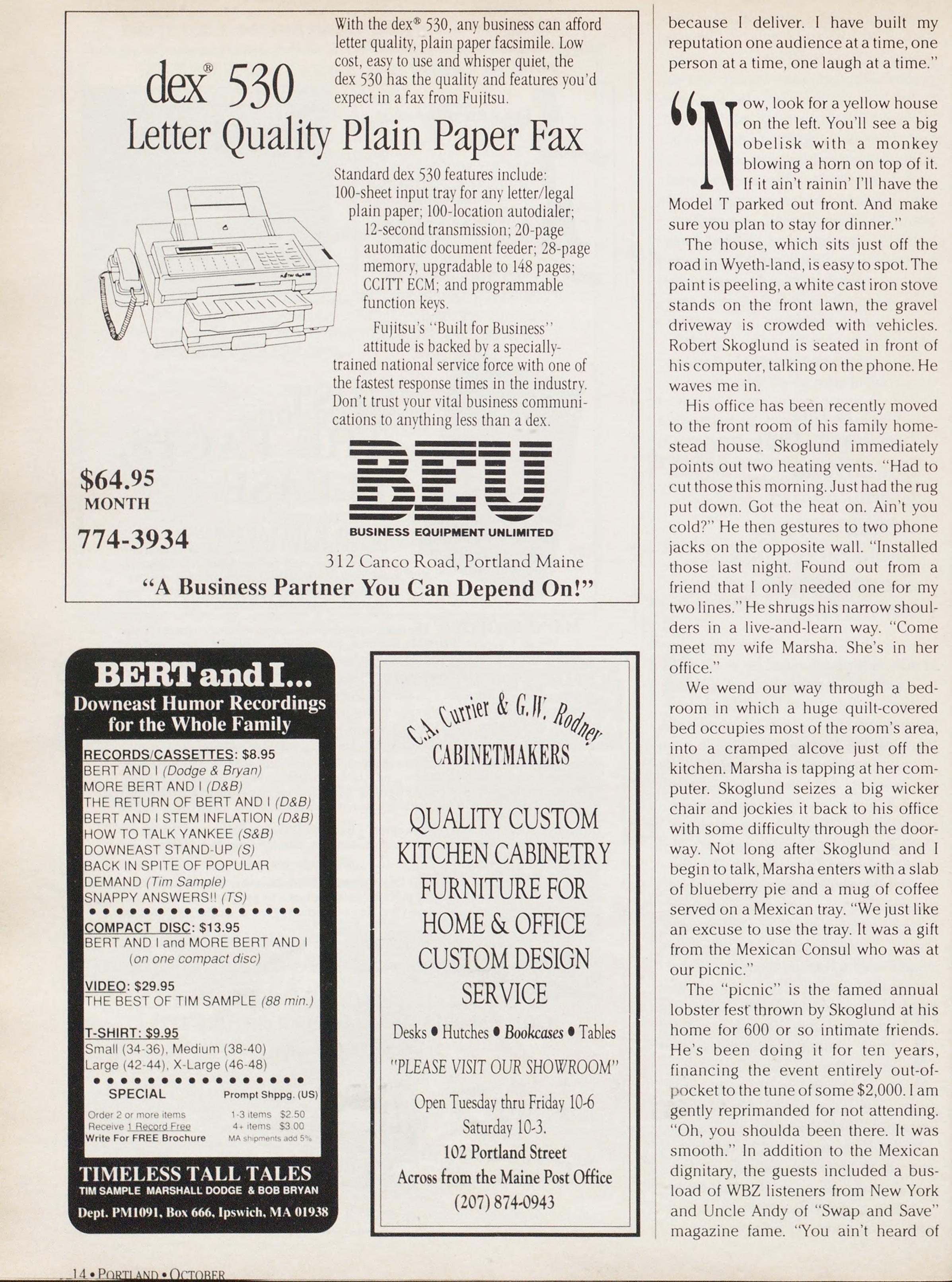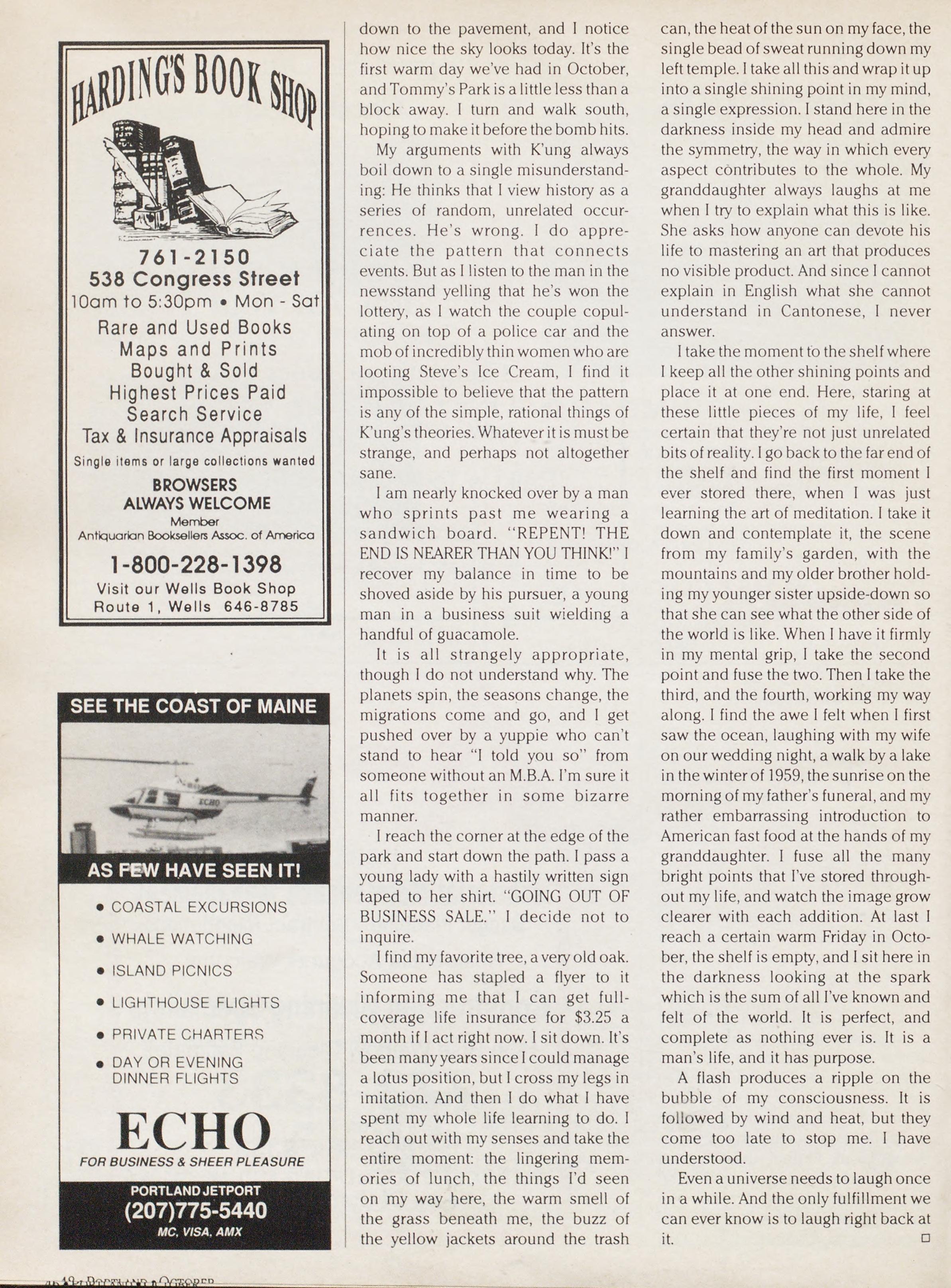 Newsstand cover date: October 1991, pubL September 1991. Vol. 6. No. 7, copyright 1991. PORTLAND Monthly Magazine is mailed at third-class mail rates in Port¬ land, ME 04101. ( ISSN: 0887-5340). Opinions expressed in articles are those of authors and do not represent editorial positions of PORTLAND Monthly Magazine. Responsible only for that portion of any advertisement which is printed incorrectly, and as compensation we willrunacorrectioninthefollowingissue.Nothingin thisissuemaybereprintedinwholeorinpartwithout written permission from the publishers. Submissions welcome, but we lake no responsibility lor unsolicited materials.
