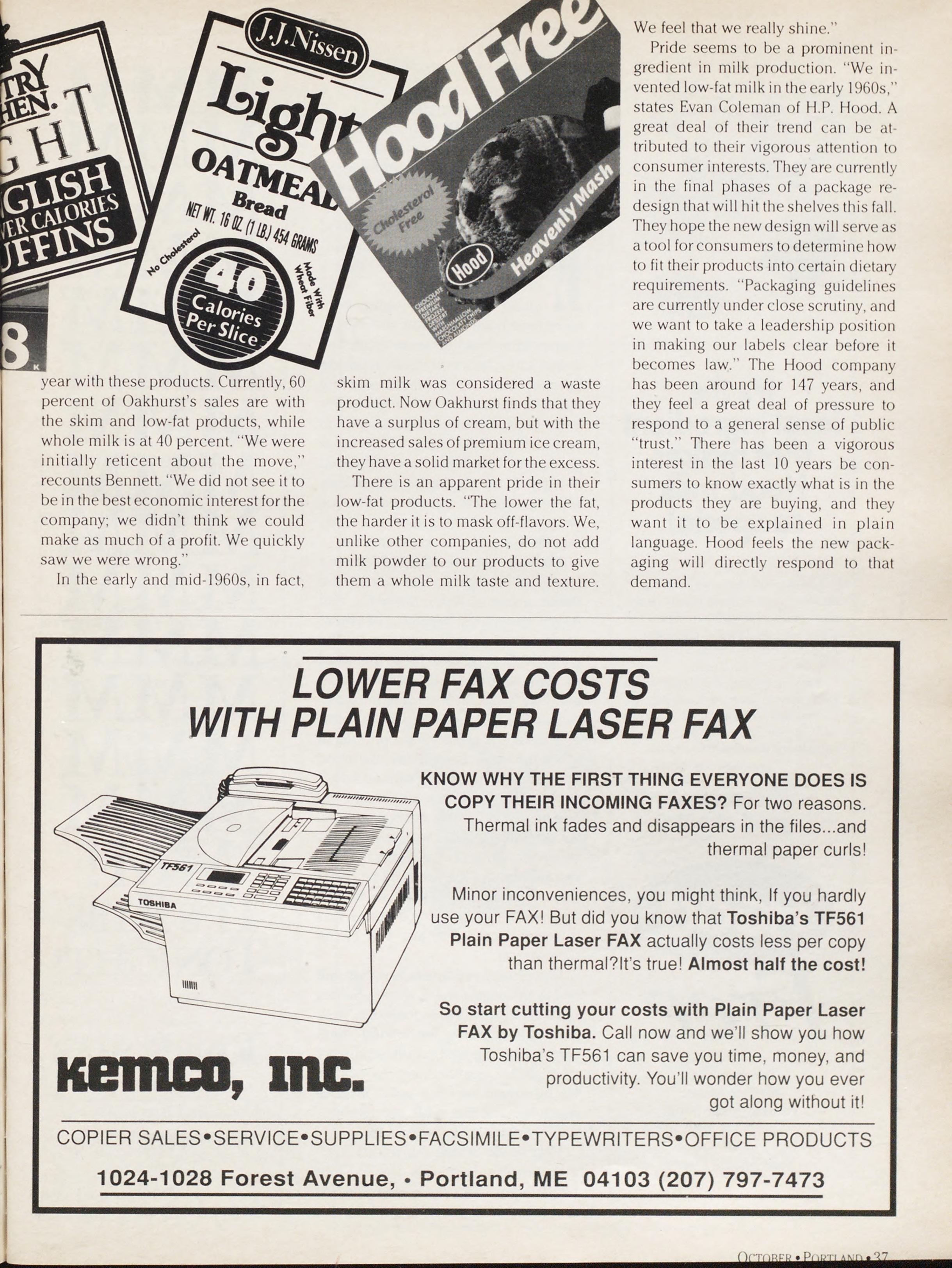 AlocalpioneerinofferingMainersa low-fatalternativetofastfoodisJim Raffle,ownerofRaff’s,EmilyK’s,and Arby’s.Hesawthebeginningofamore health-conscious consumer in the early1980s.Herespondedtothattrend in1981withthefirstfast-foodsalad bar.Fouryearslatersawtheintroduc¬ tionof100-percentwholewheatbuns and baked or grilled—as opposed to fried—chicken.Eventoday,thetrend continues.AthisSouthPortlandArby’s restaurantheoffersa94-percentfatfreemeal,whichhenoteshasbeen enormously popular with everyone— “even construction workers.” Com¬ mentingonthelow-fattrendheoffers thisobservation:“Whenwestarted out, we were considered weird and different.Nowwe’rejustpartofthe mainstream.”