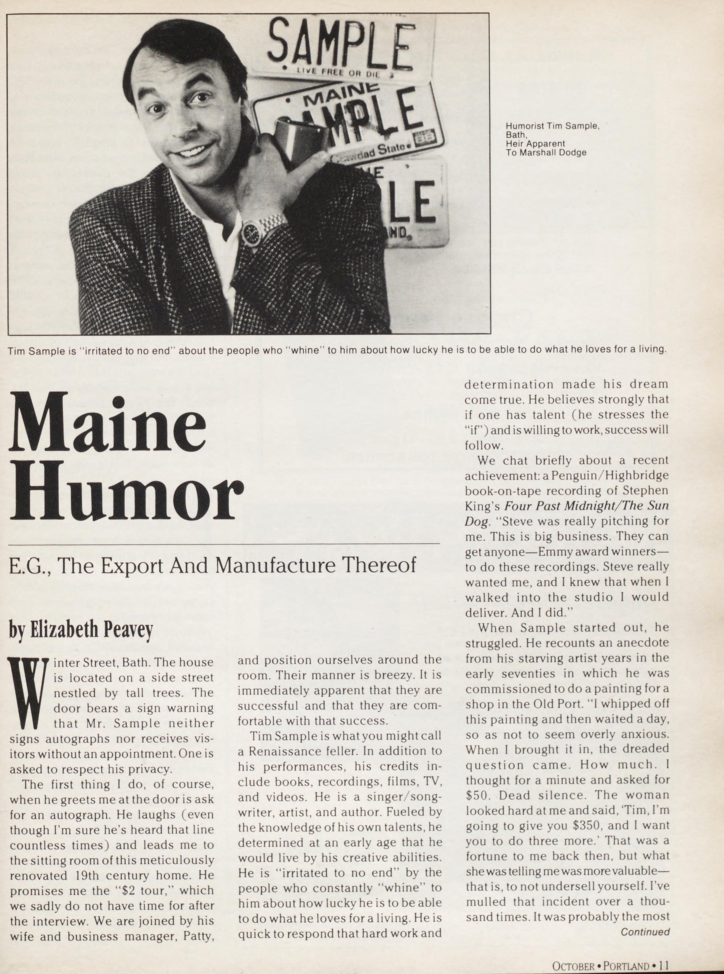 Sample’spresskitatteststothatfact. Included are an audio and a video performancecassette;twophotos;a brochurelistinghisnationalandlocal corporateafter-dinnerappearances, plusblurbsfromthelikesoftheWash¬ ington Post and Sen. William Cohen andabriefexplanationofthe“Time¬ lessHumorofTimSample”;thereis alsoabibliography,abiography,more blurbs,andafull-pageendorsement fromStephenKing.