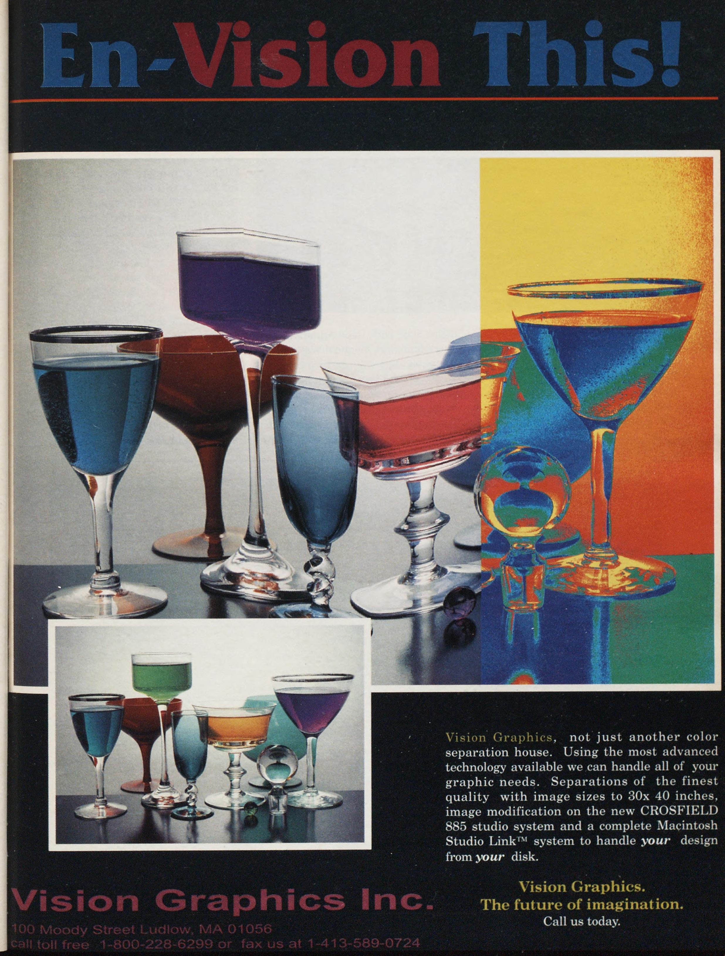 Vision Graphics, not just another color f ■A separationhouse.Usingthemostadvanced technologyavailablewecanhandleallofyour graphic needs. Separations of the finest qualitywithimagesizesto30x40inches, image modification on the new CROSFIELD 885studiosystemandacompleteMacintosh StudioLink™systemtohandleyourdesign fromyourdisk.