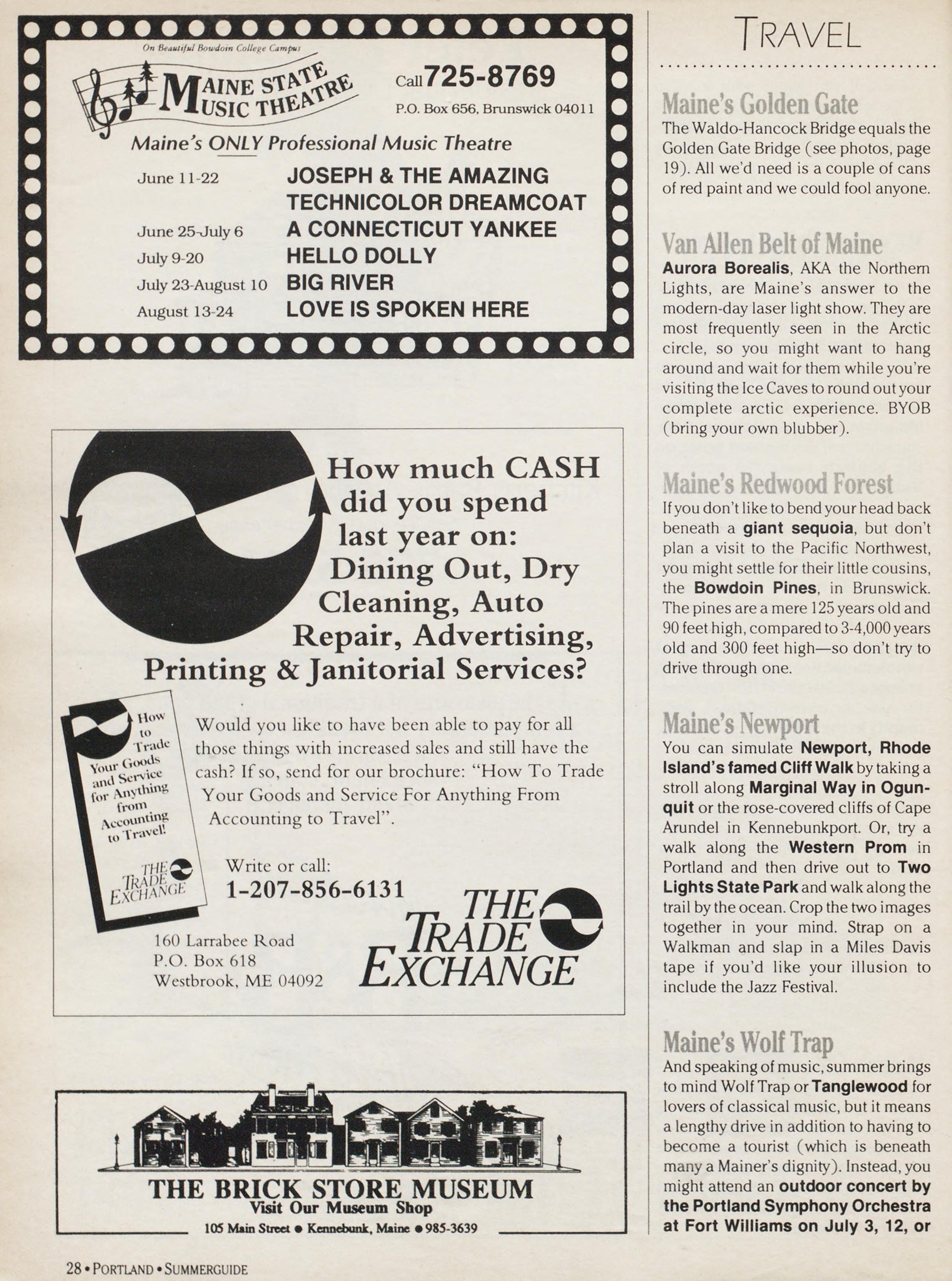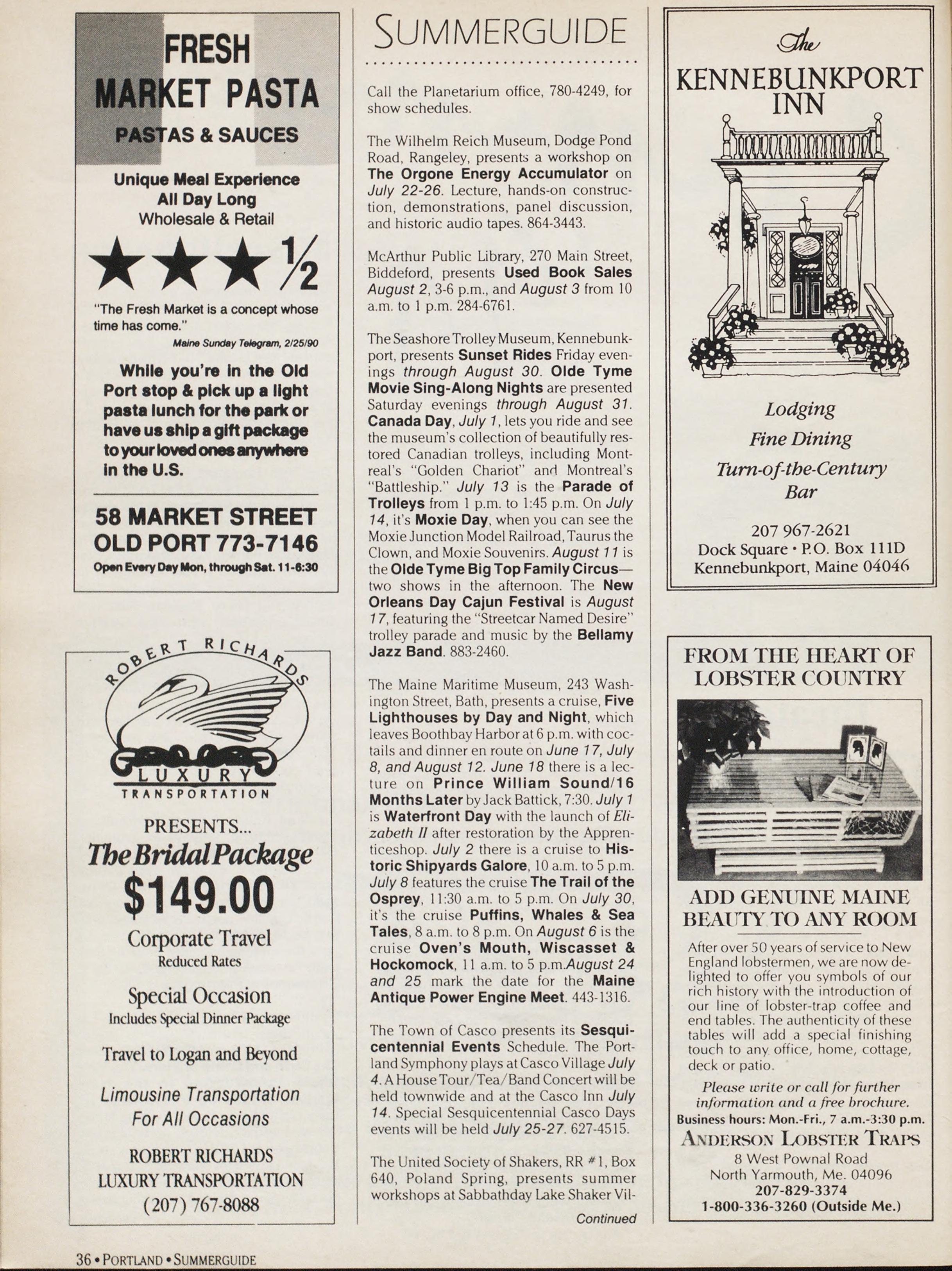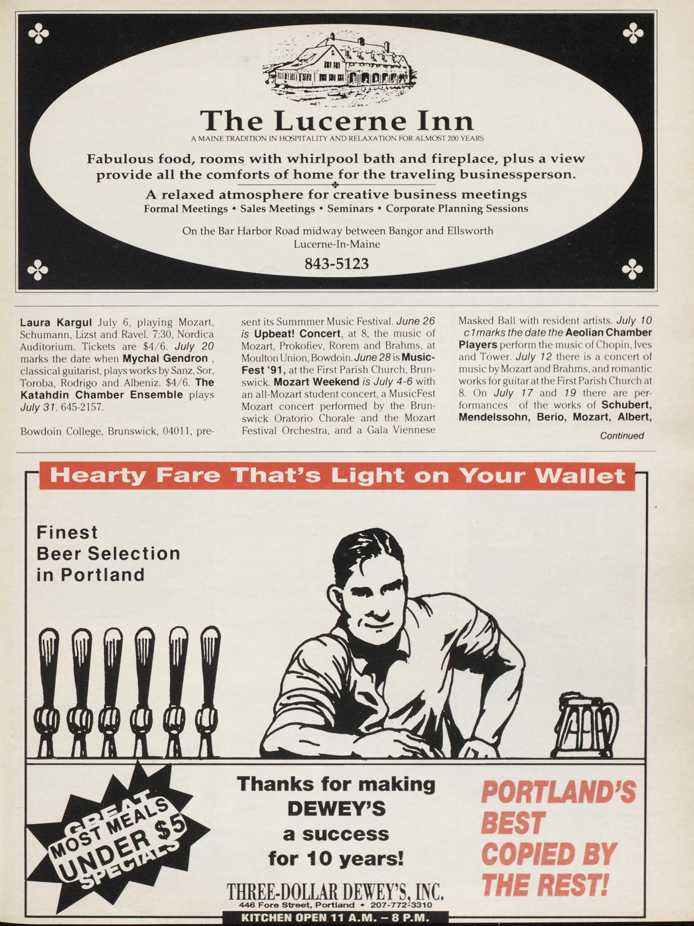 Andspeakingofmusic,summerbrings tomindWolfTrapor Tanglewood for loversofclassicalmusic,butitmeans alengthydriveinadditiontohavingto becomeatourist(whichisbeneath manyaMainer’sdignity).Instead,you mightattendan outdoor concert by the Portland Symphony Orchestra atFortWilliamsonJuly3,12,or