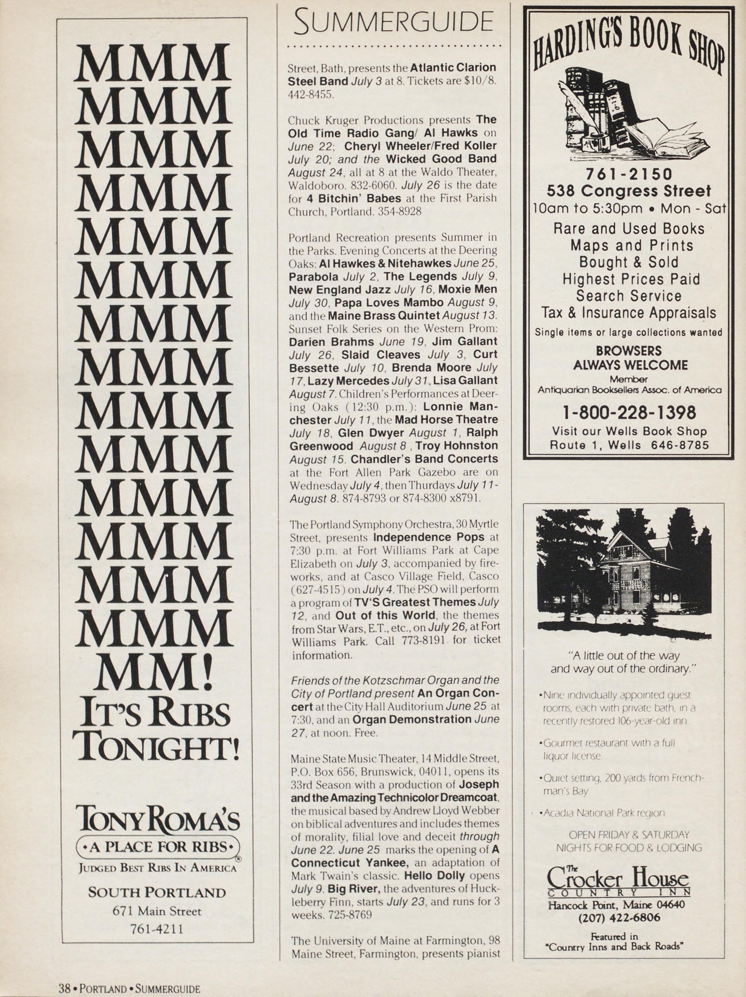 PortlandRecreationpresentsSummerin theParks.EveningConcertsattheDeering Oaks: Al Hawkes & Nitehawkes June25. Parabola July2. The Legends July9, New England Jazz July16. Moxie Men July30, Papa Loves Mambo August9. andthe Maine Brass Quintet August13. SunsetFolkSeriesontheWesternProm: Darien Brahms June 19, Jim Gallant July26, Slaid Cleaves July3, Curt Bessette July10, Brenda Moore July 17. Lazy Mercedes July31 ,LisaGallant August7.Children’sPerformancesatDeer¬ ingOaks(12:30p.m.): Lonnie Man¬ chester July77,the Mad Horse Theatre July18, Glen Dwyer August7, Ralph Greenwood August 8 , Troy Hohnston August 75 Chandler’s Band Concerts at the Fort Allen Park Gazebo are on WednesdayJuly4,thenThurdaysJu/y11August8.874-8793or874-8300x8791.
