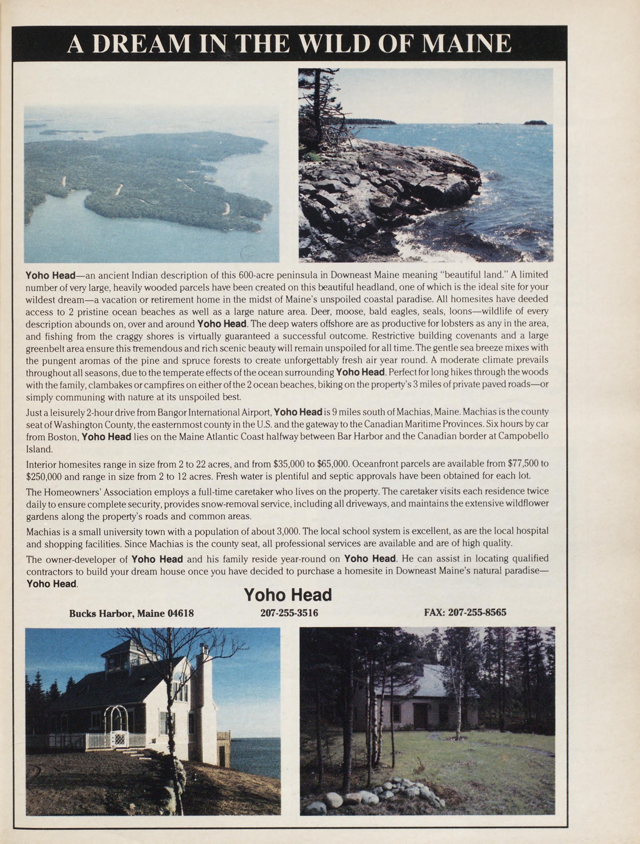 Justaleisurely2-hourdrivefromBangorInternationalAirport, Yoho Head is9milessouthofMachias,Maine.Machiasisthecounty seatofWashingtonCounty,theeasternmostcountyintheU.S.andthegatewaytotheCanadianMaritimeProvinces.Sixhoursbycar fromBoston, Yoho Head liesontheMaineAtlanticCoasthalfwaybetweenBarHarborandtheCanadianborderatCampobello Island.