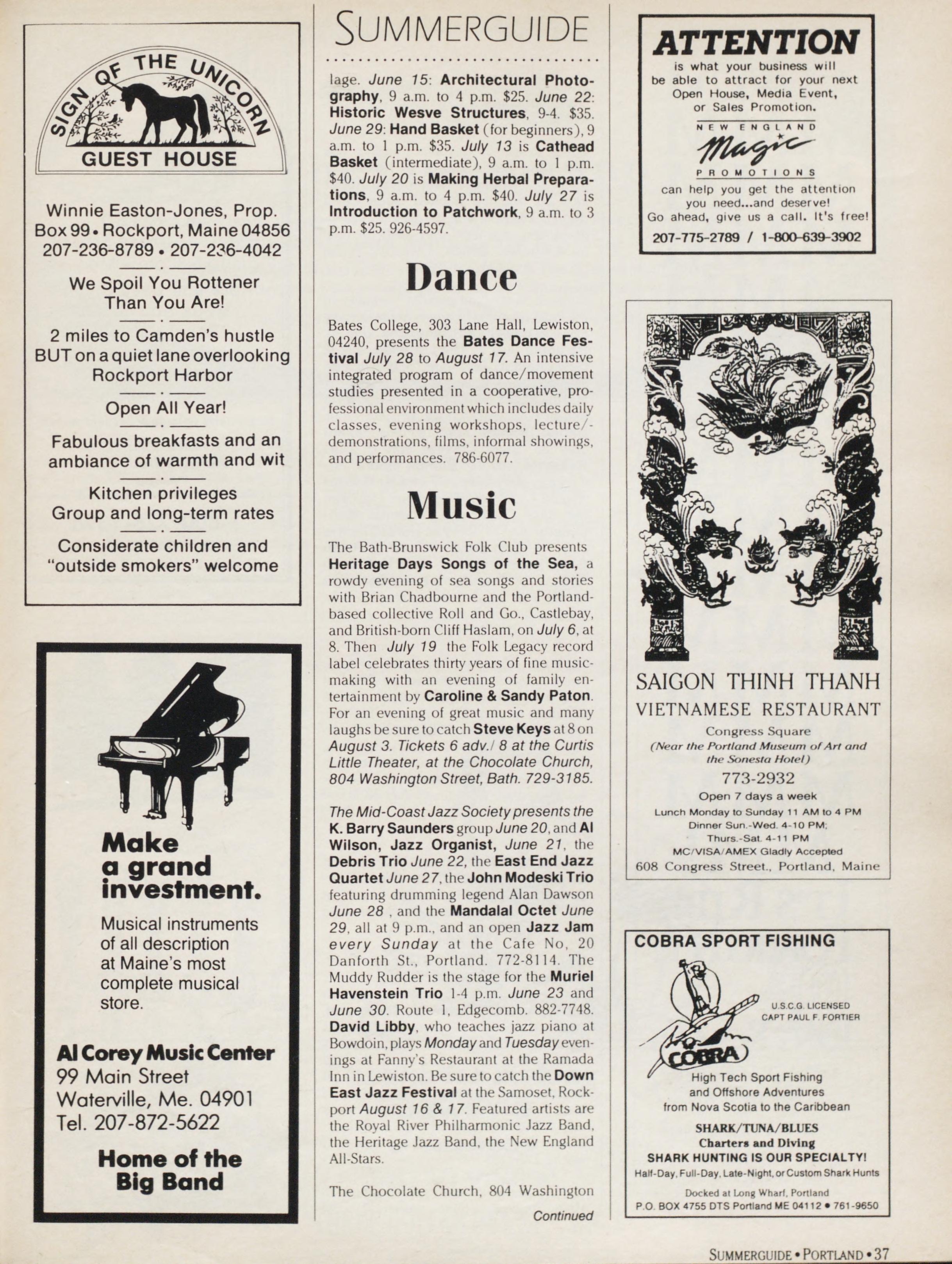 TheMid-CoastJazzSocietypresentsthe K. Barry Saunders groupJune20,and Al Wilson, Jazz Organist, June 21,the Debris Trio June22,the East End Jazz Quartet June27,the John Modeski Trio featuringdrumminglegendAlanDawson June 28,andthe Mandalal Octet June 29,allat9p.m.,andanopen Jazz Jam every Sunday at the Cafe No, 20 DanforthSt.,Portland.772-8114.The MuddyRudderisthestageforthe Muriel Havenstein Trio 1-4p.m. June 23 and June 30. Route1,Edgecomb.882-7748. David Libby, whoteachesjazzpianoat Bowdoin,playsMondayandTuesdayeven¬ ingsatFanny’sRestaurantattheRamada InninLewiston.Besuretocatchthe Down East Jazz Festival attheSamoset,Rock¬ portAugust16&17.Featuredartistsare theRoyalRiverPhilharmonicJazzBand, theHeritageJazzBand,theNewEngland All-Stars.