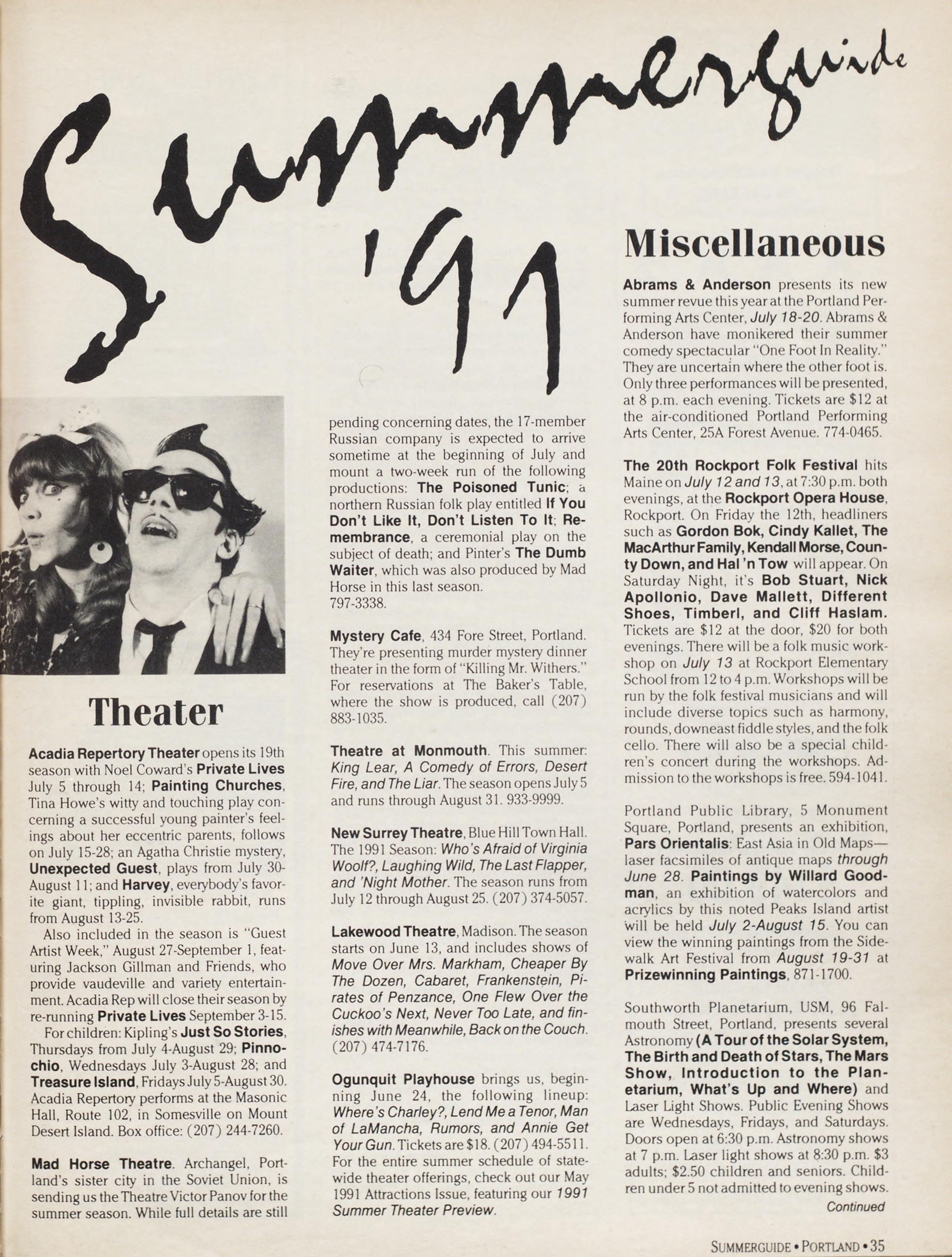 New Surrey Theatre, BlueHillTownHall. The1991Season:Who’sAfraidofVirginia Woolf?,LaughingWild,TheLastFlapper, and'NightMother.Theseasonrunsfrom July12throughAugust25.(207)374-5057.