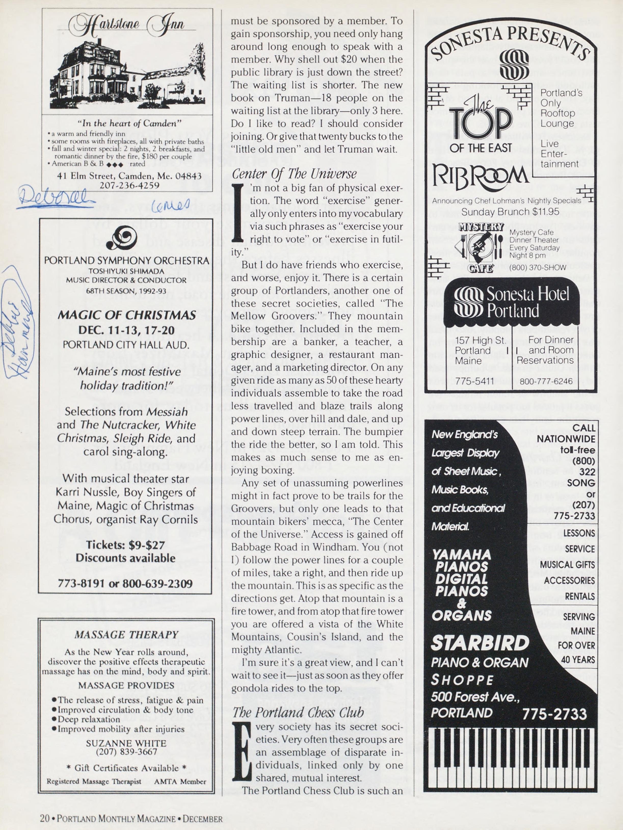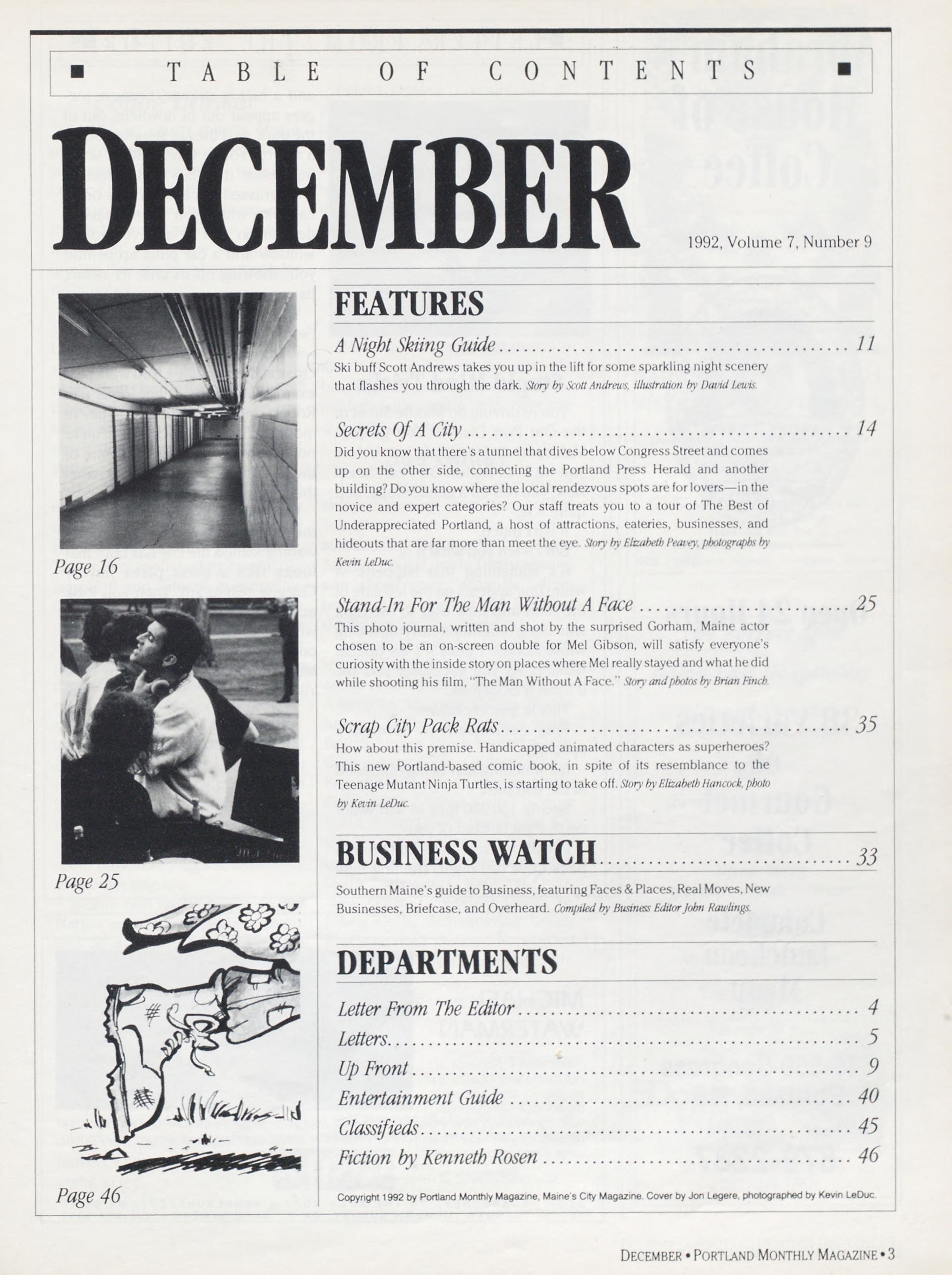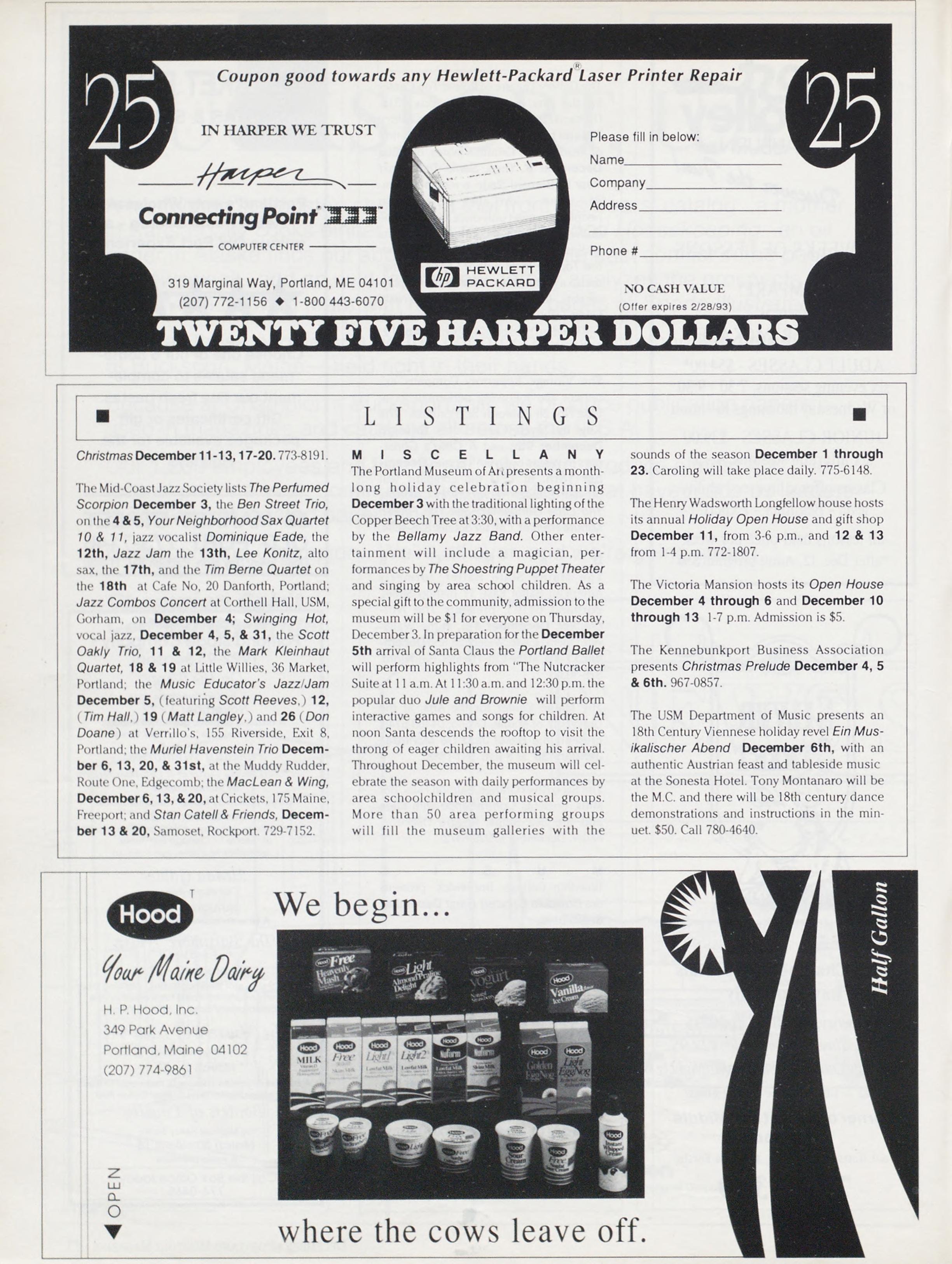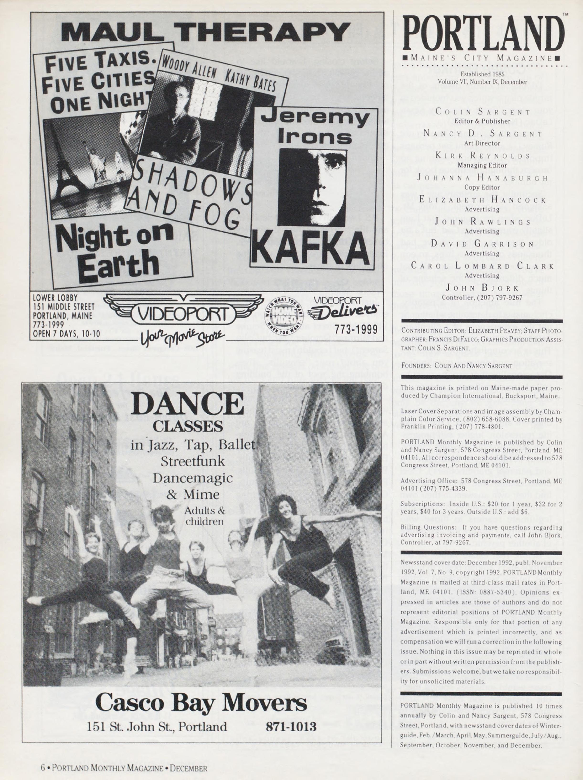 Newsstand cover date: December 1992, pu bl. November 1992. Vol. 7, No. 9. copyright 1992. PORTLAND Monthly Magazine is mailed at third-class mail rates in Port¬ land, ME 04101. (ISSN: 0887-5340). Opinions ex¬ pressed in articles are those of authors and do not represent editorial positions of PORTLAND Monthly Magazine. Responsible only for that portion of any advertisement which is printed incorrectly, and as compensation we will run a correction in the following issue. Nothing in this issue may be reprinted in whole or in part without written permission from the publish¬ ers Submissions welcome, but we take no responsibil¬ ity for unsolicited materials