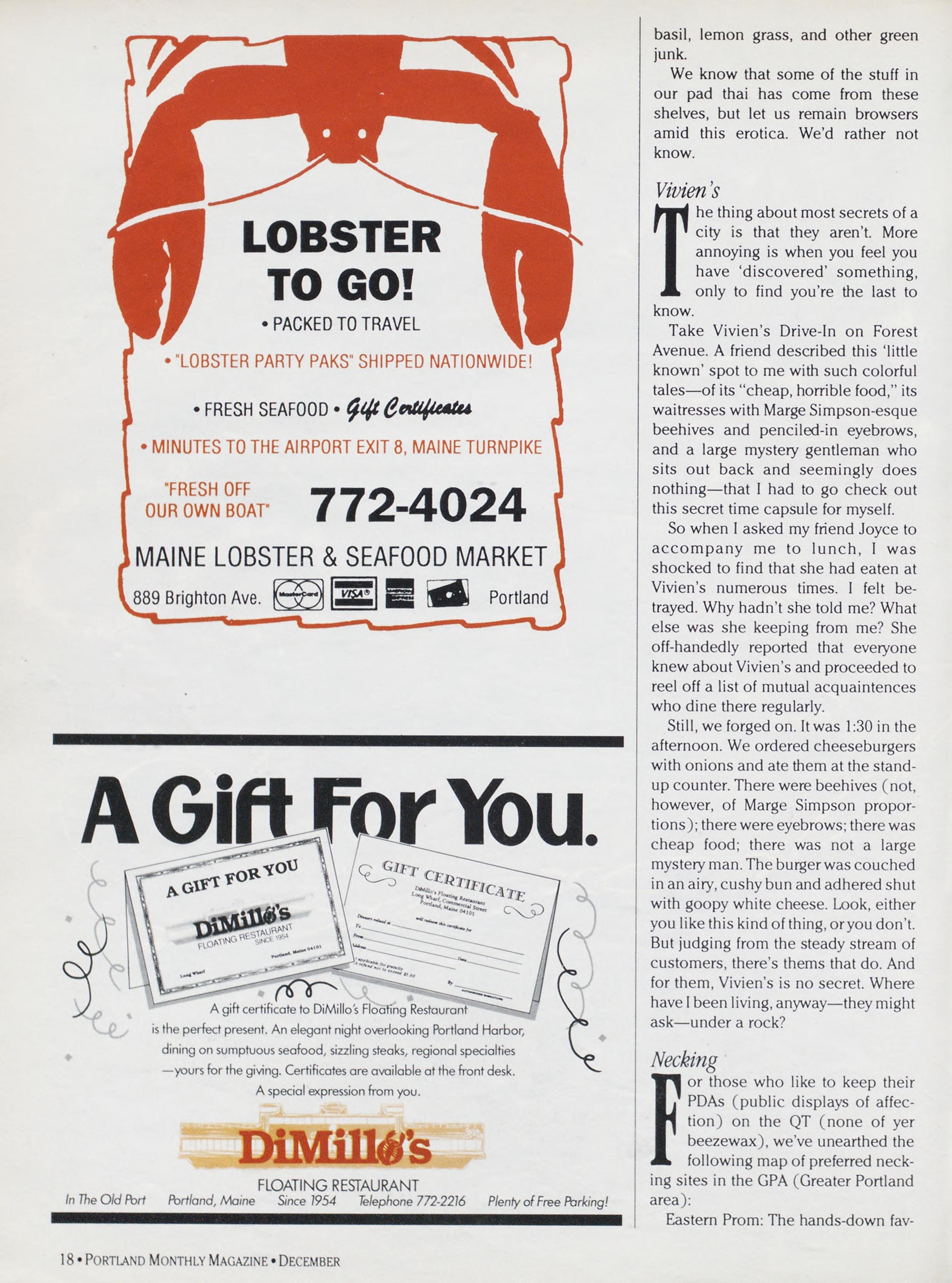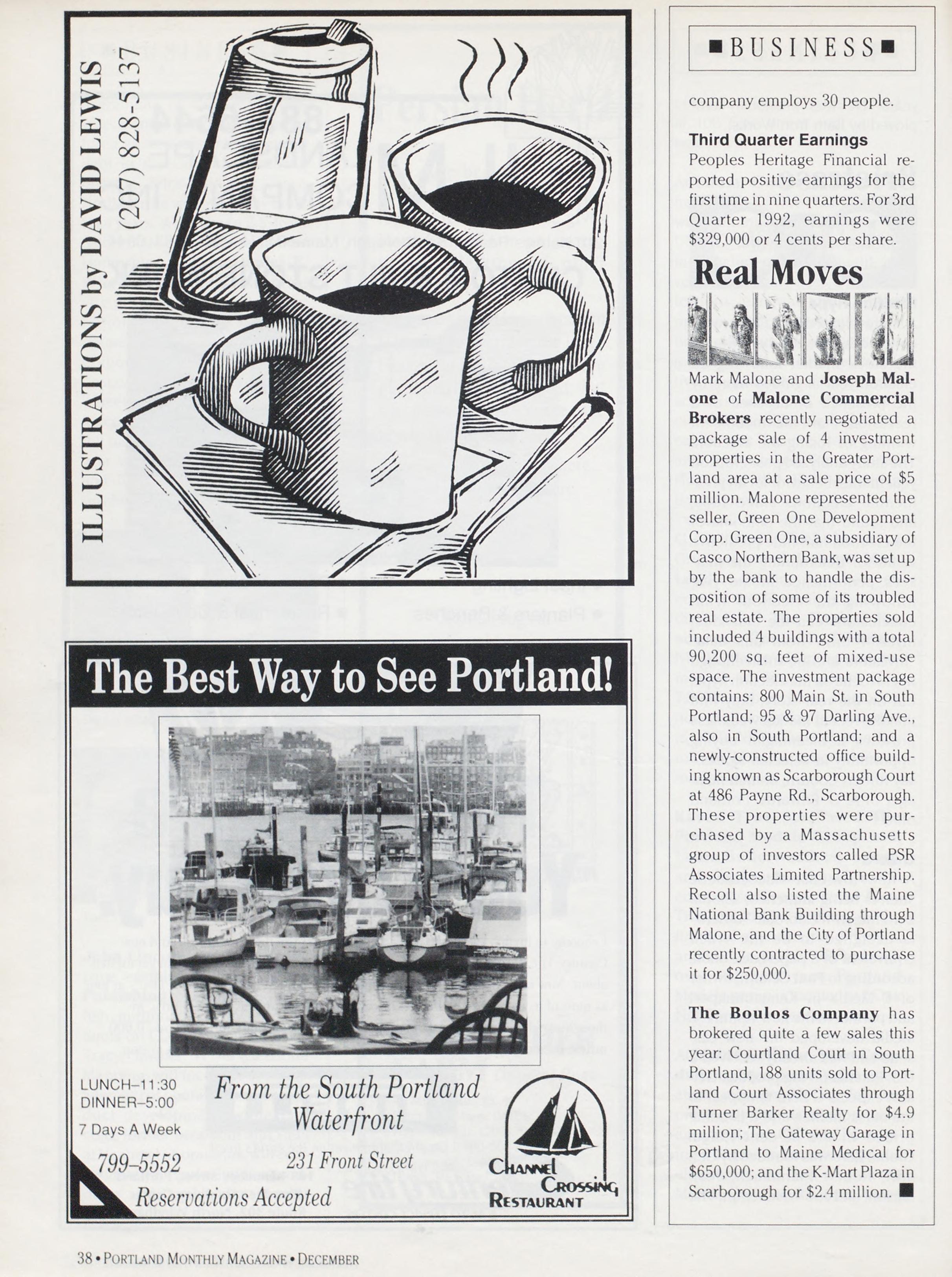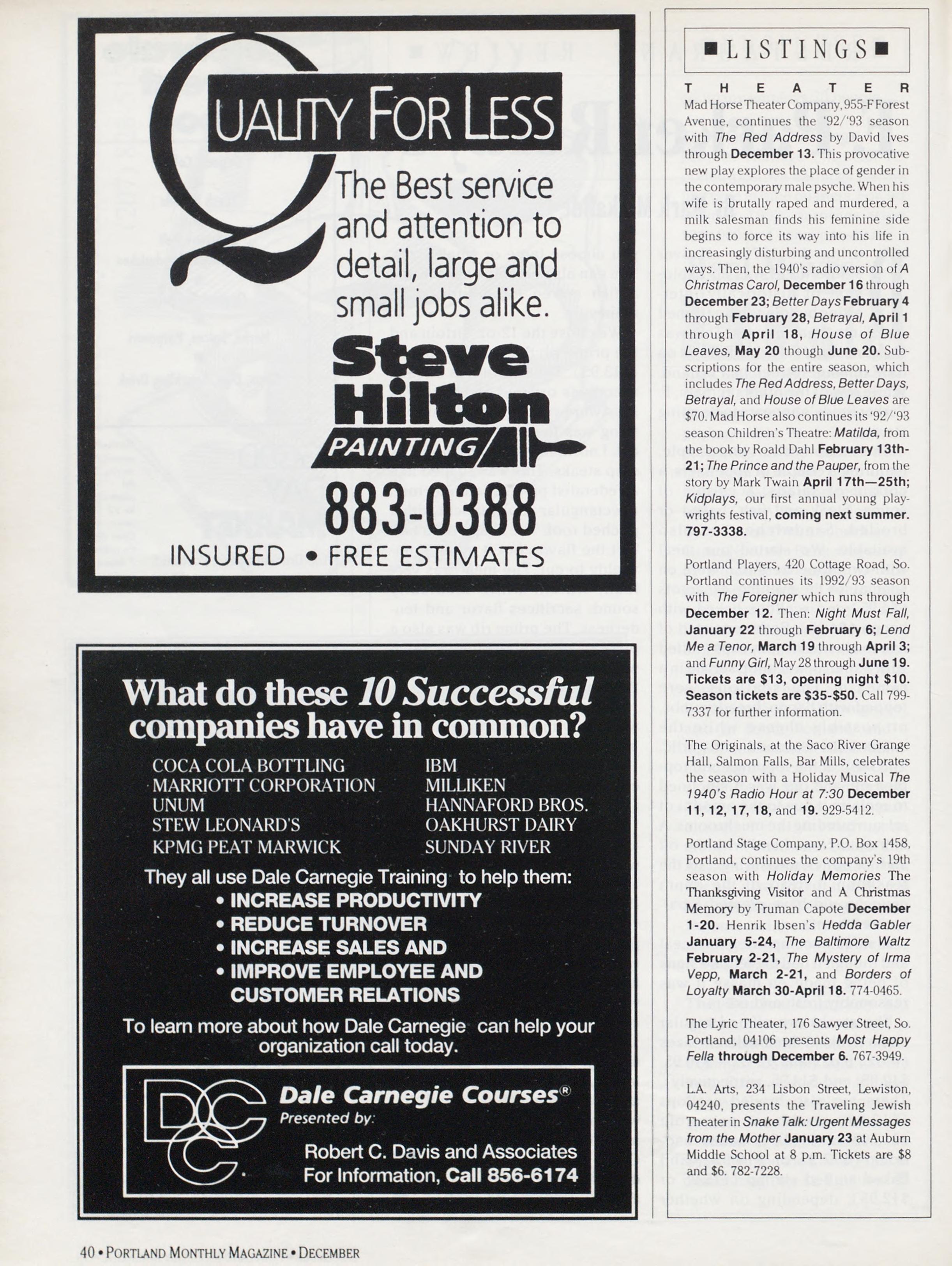 Newsstand cover date: December 1992, pu bl. November 1992. Vol. 7, No. 9. copyright 1992. PORTLAND Monthly Magazine is mailed at third-class mail rates in Port¬ land, ME 04101. (ISSN: 0887-5340). Opinions ex¬ pressed in articles are those of authors and do not represent editorial positions of PORTLAND Monthly Magazine. Responsible only for that portion of any advertisement which is printed incorrectly, and as compensation we will run a correction in the following issue. Nothing in this issue may be reprinted in whole or in part without written permission from the publish¬ ers Submissions welcome, but we take no responsibil¬ ity for unsolicited materials