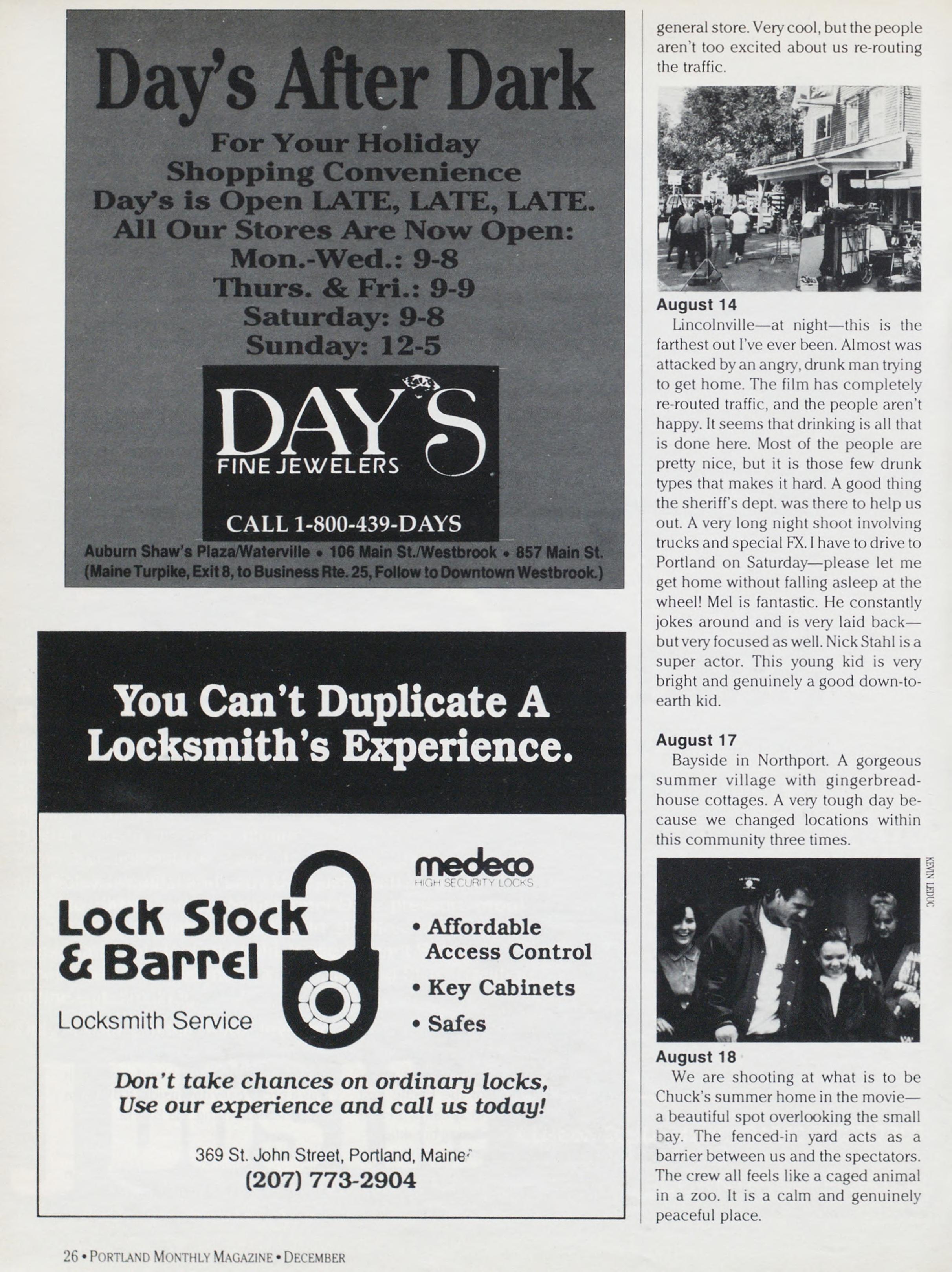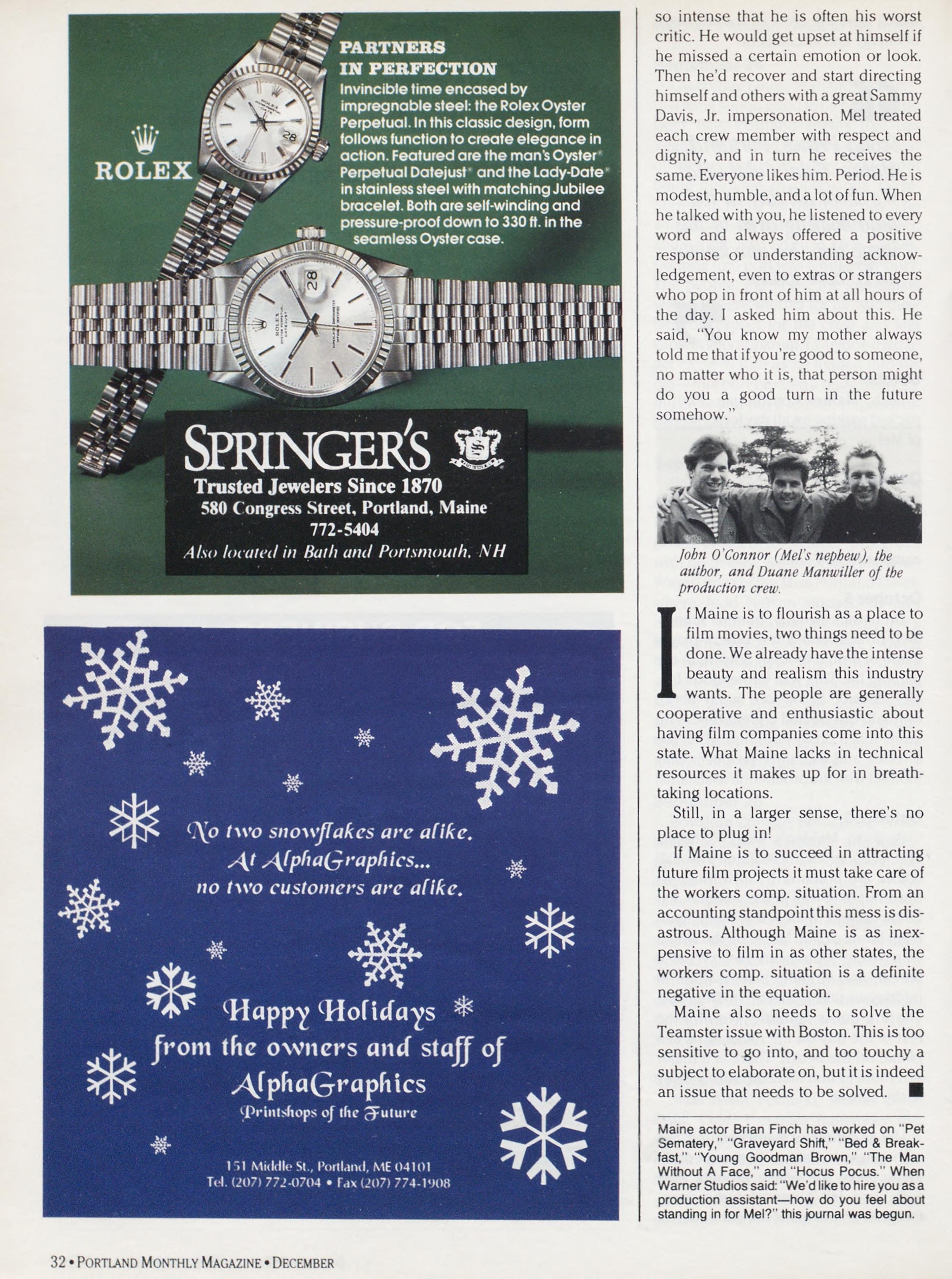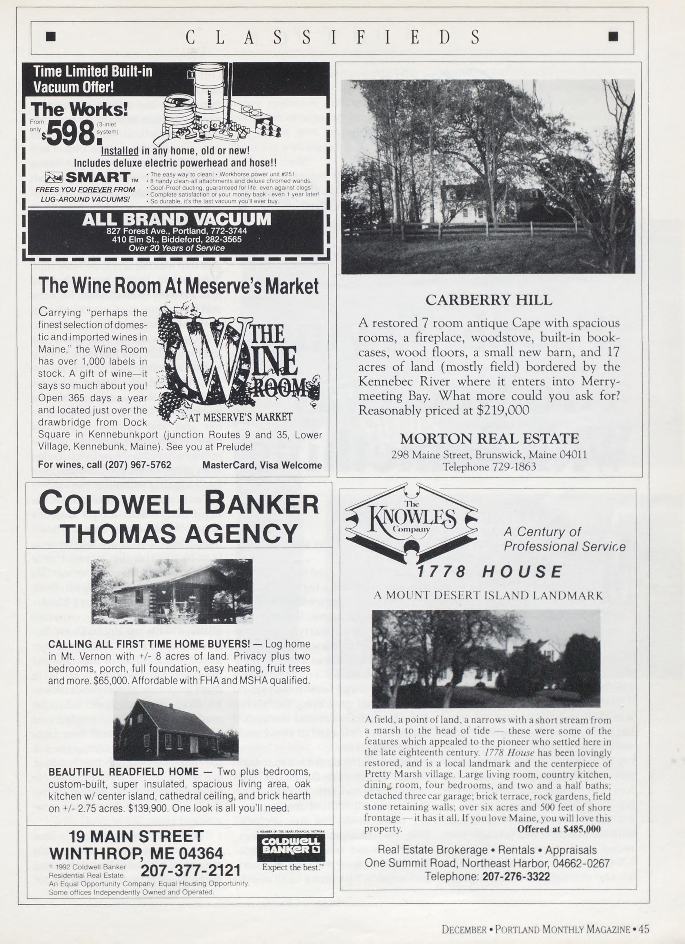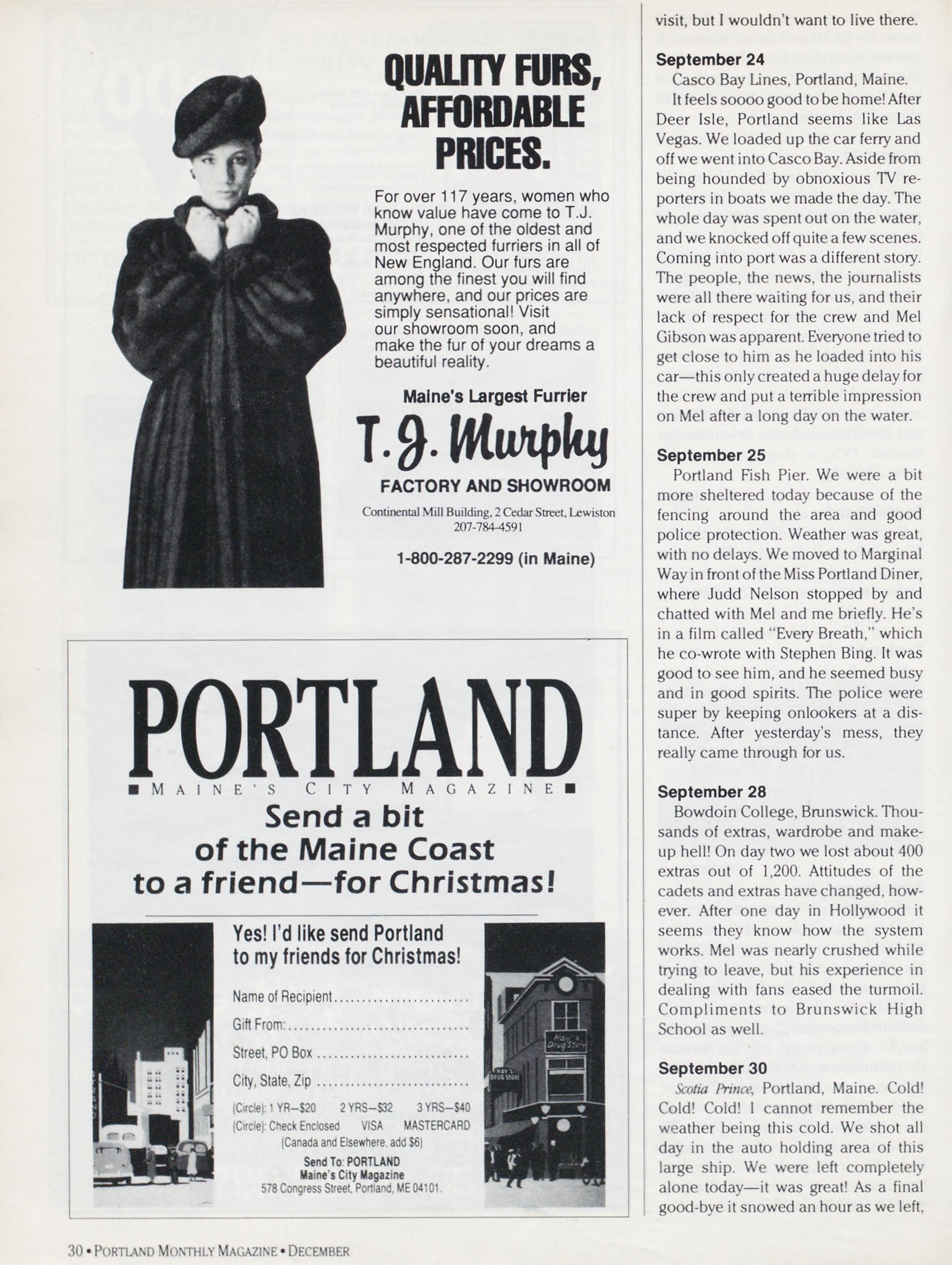 Newsstand cover date: December 1992, pu bl. November 1992. Vol. 7, No. 9. copyright 1992. PORTLAND Monthly Magazine is mailed at third-class mail rates in Port¬ land, ME 04101. (ISSN: 0887-5340). Opinions ex¬ pressed in articles are those of authors and do not represent editorial positions of PORTLAND Monthly Magazine. Responsible only for that portion of any advertisement which is printed incorrectly, and as compensation we will run a correction in the following issue. Nothing in this issue may be reprinted in whole or in part without written permission from the publish¬ ers Submissions welcome, but we take no responsibil¬ ity for unsolicited materials