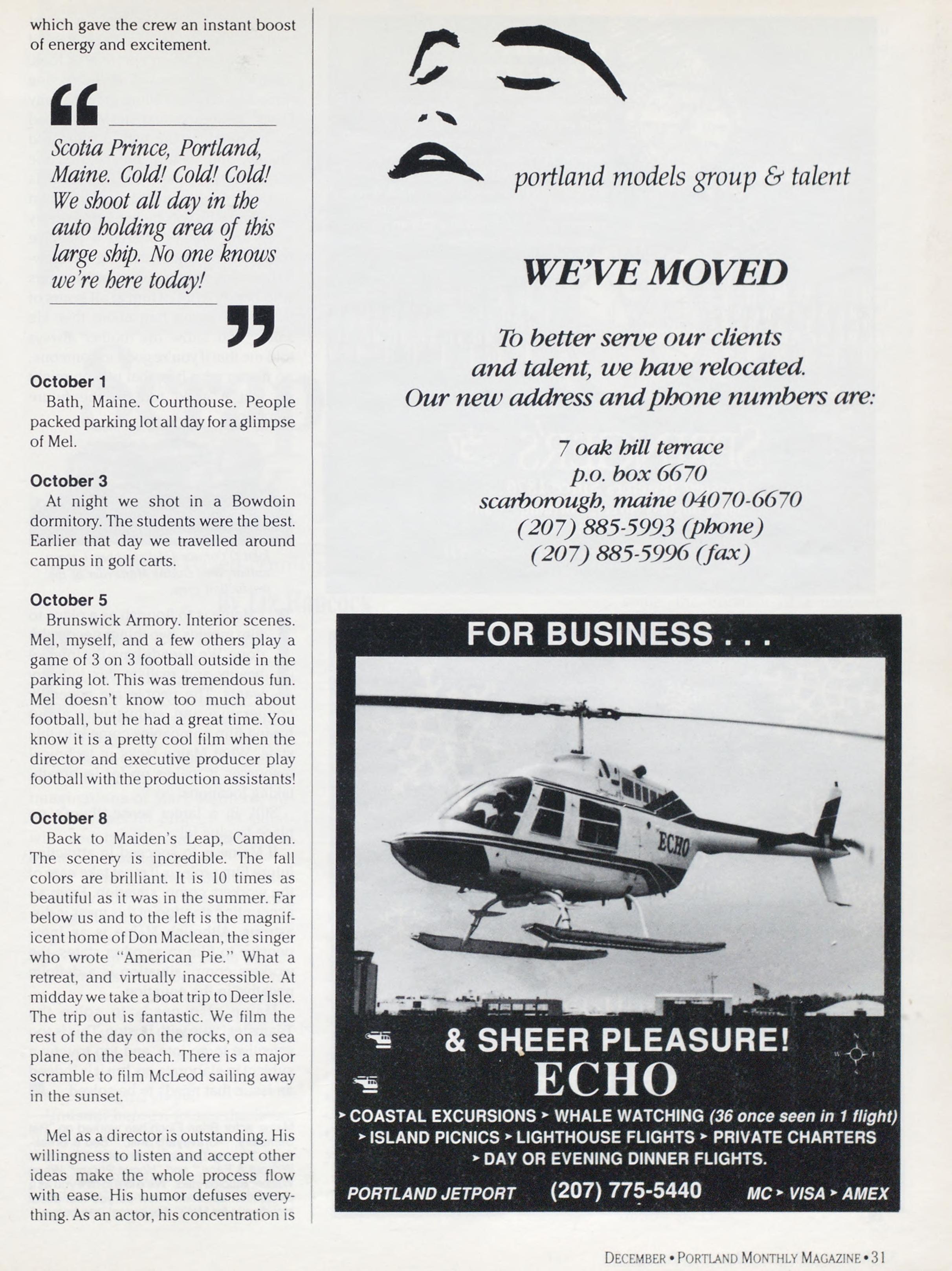 Thisphotojournal,writtenandshotbythesurprisedGorham,Maineactor chosentobeanon-screendoubleforMelGibson,willsatisfyeveryone's curiositywiththeinsidestoryonplaceswhereMelreallystayedandwhathedid whileshootinghisfilm."TheManWithoutAFace.”StoryandphotosbyHrianFinch