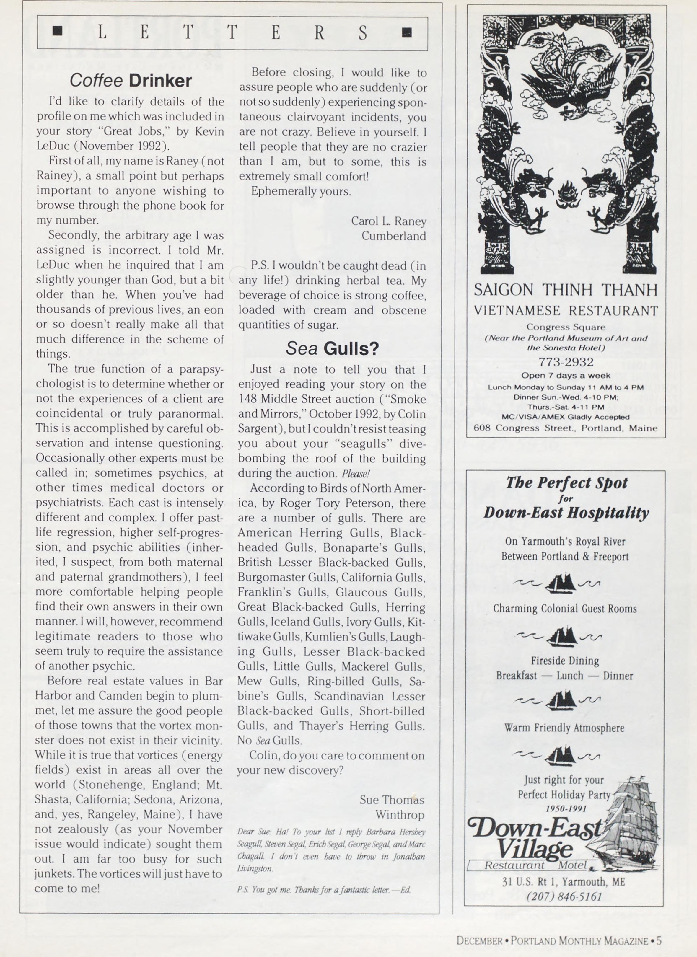 Justanotetotellyouthat1 enjoyedreadingyourstoryonthe 148MiddleStreetauction("Smoke andMirrors,”October1992,byColin Sargent),butIcouldn’tresistteasing youaboutyour“seagulls”dive¬ bombingtheroofofthebuilding duringtheauction.Please!