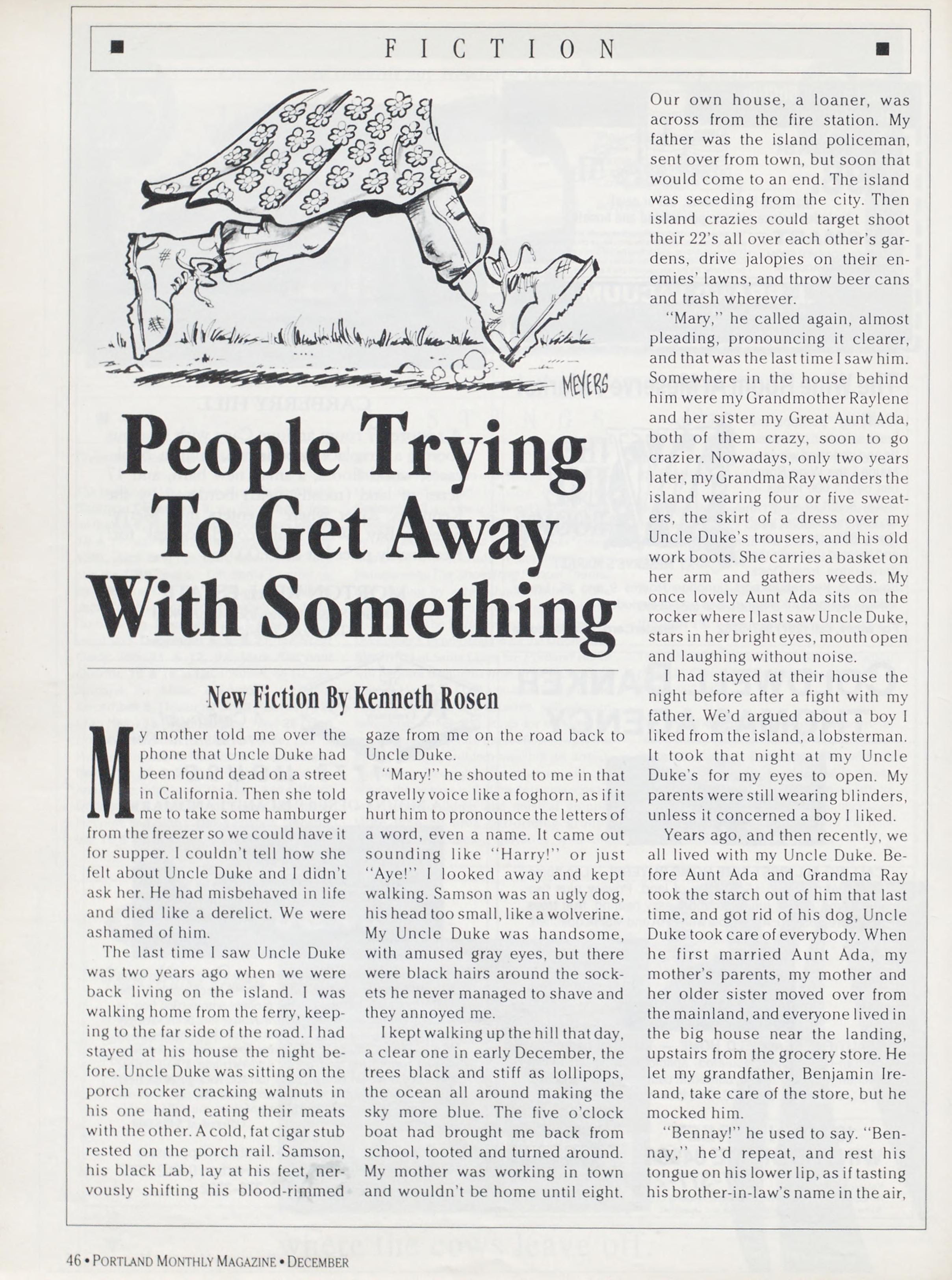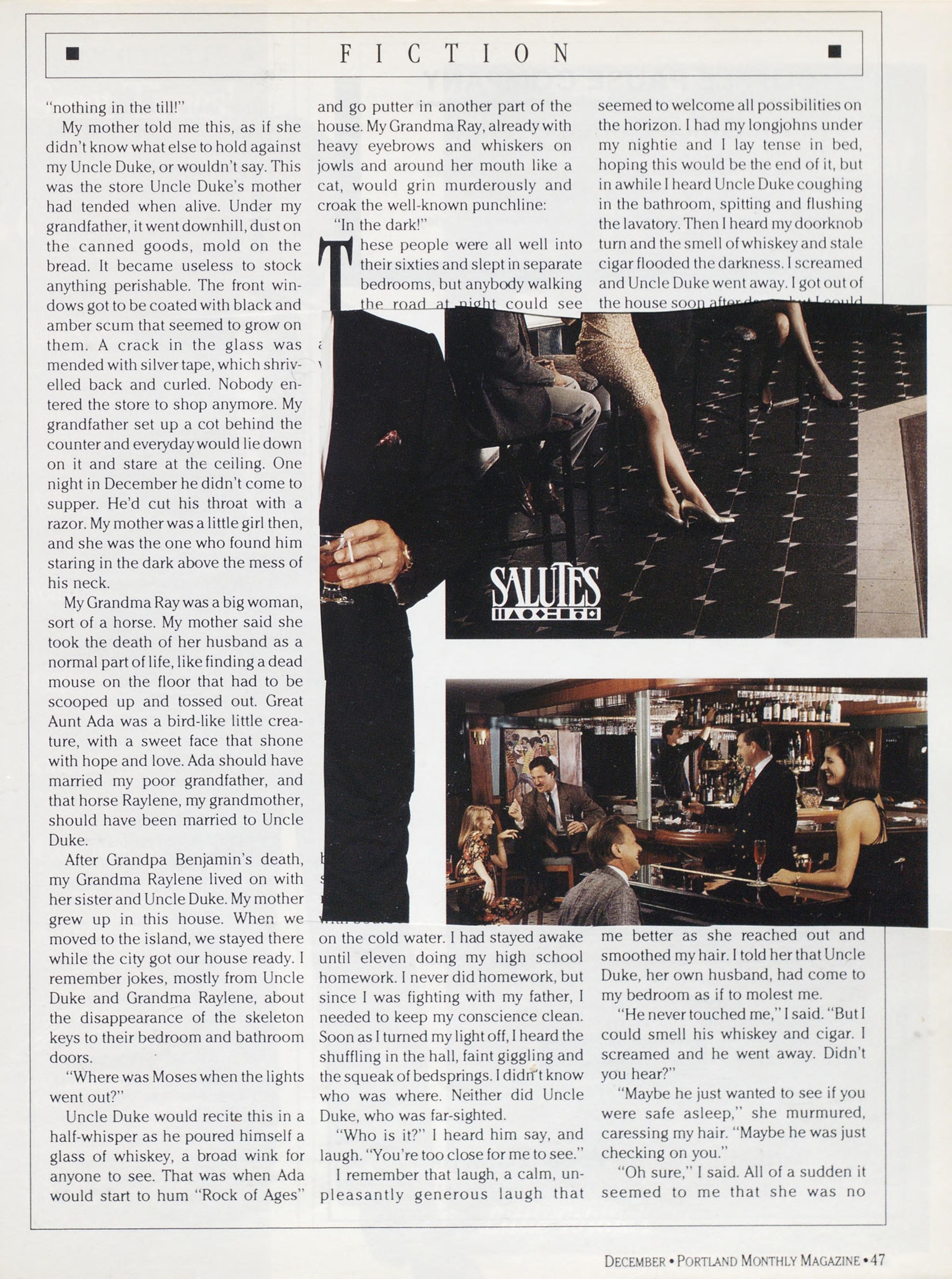Thelasttime1sawUncleDuke was two years ago when we were backlivingontheisland.1was walkinghomefromtheferry,keep¬ ingtothefarsideoftheroad.Ihad stayedathishousethenightbe¬ fore.UncleDukewassittingonthe porchrockercrackingwalnutsin hisonehand,eatingtheirmeats withtheother.Acold,fatcigarstub restedontheporchrail.Samson, hisblackLab,layathisfeet,ner¬ vouslyshiftinghisblood-rimmed