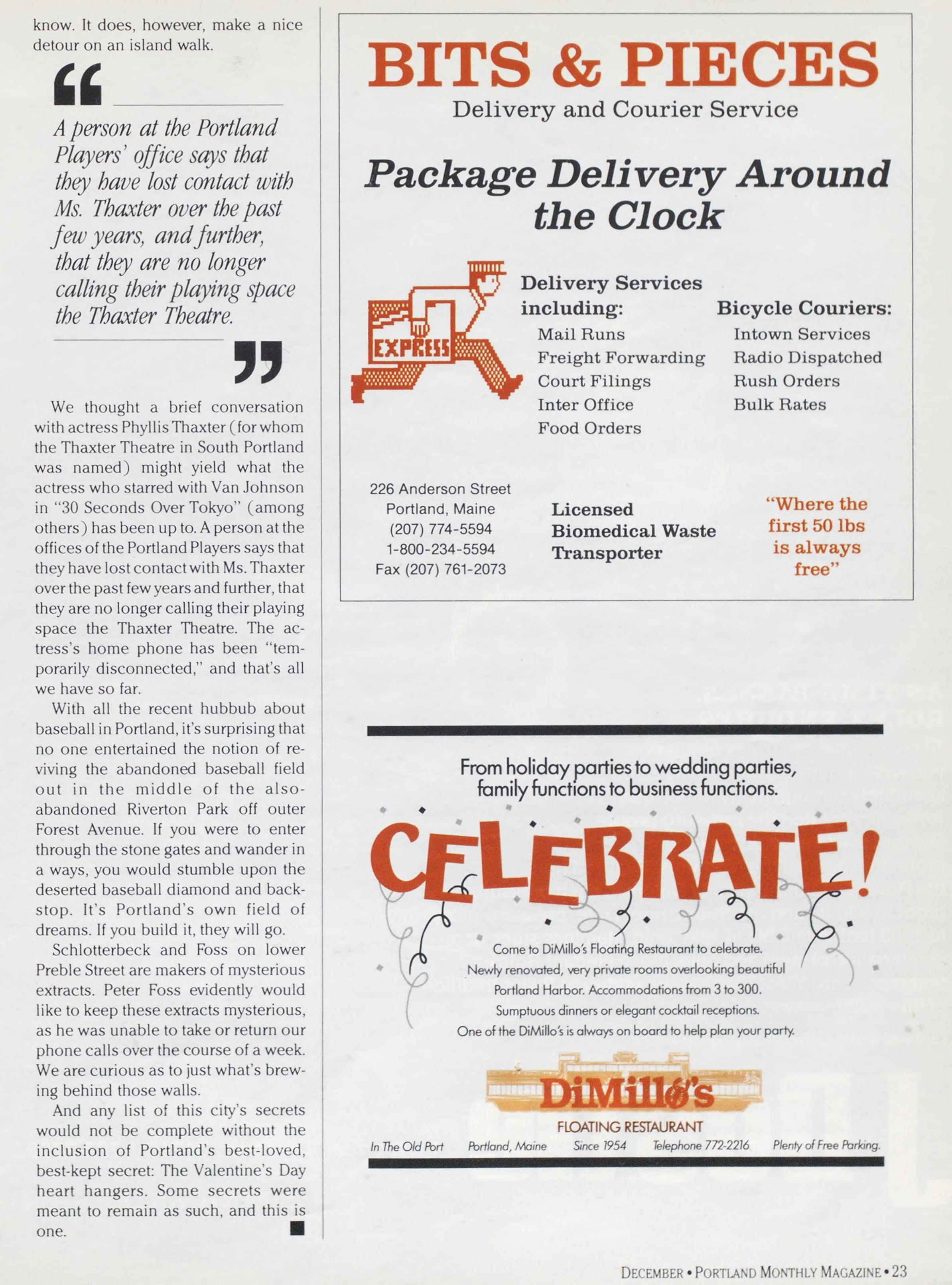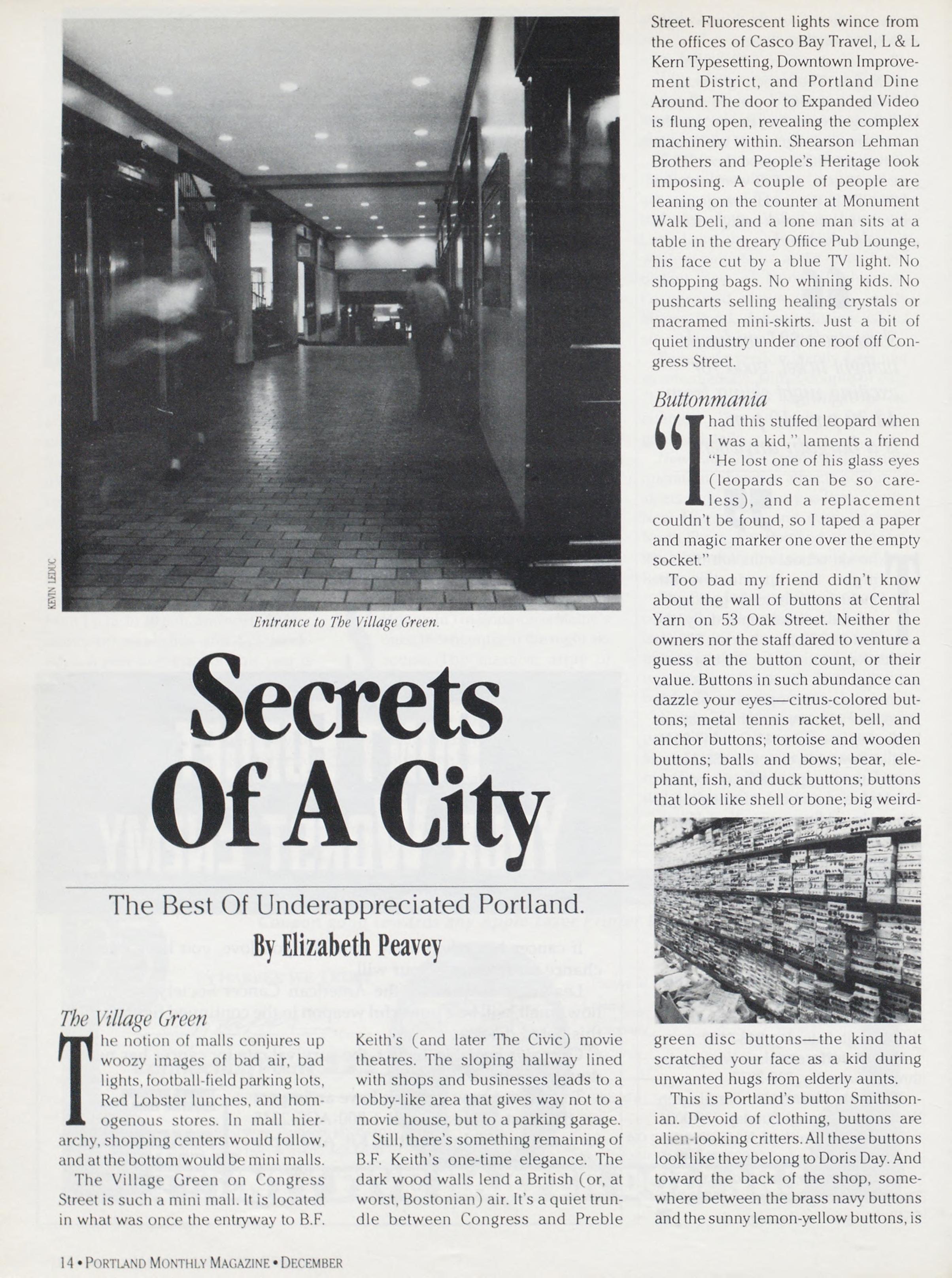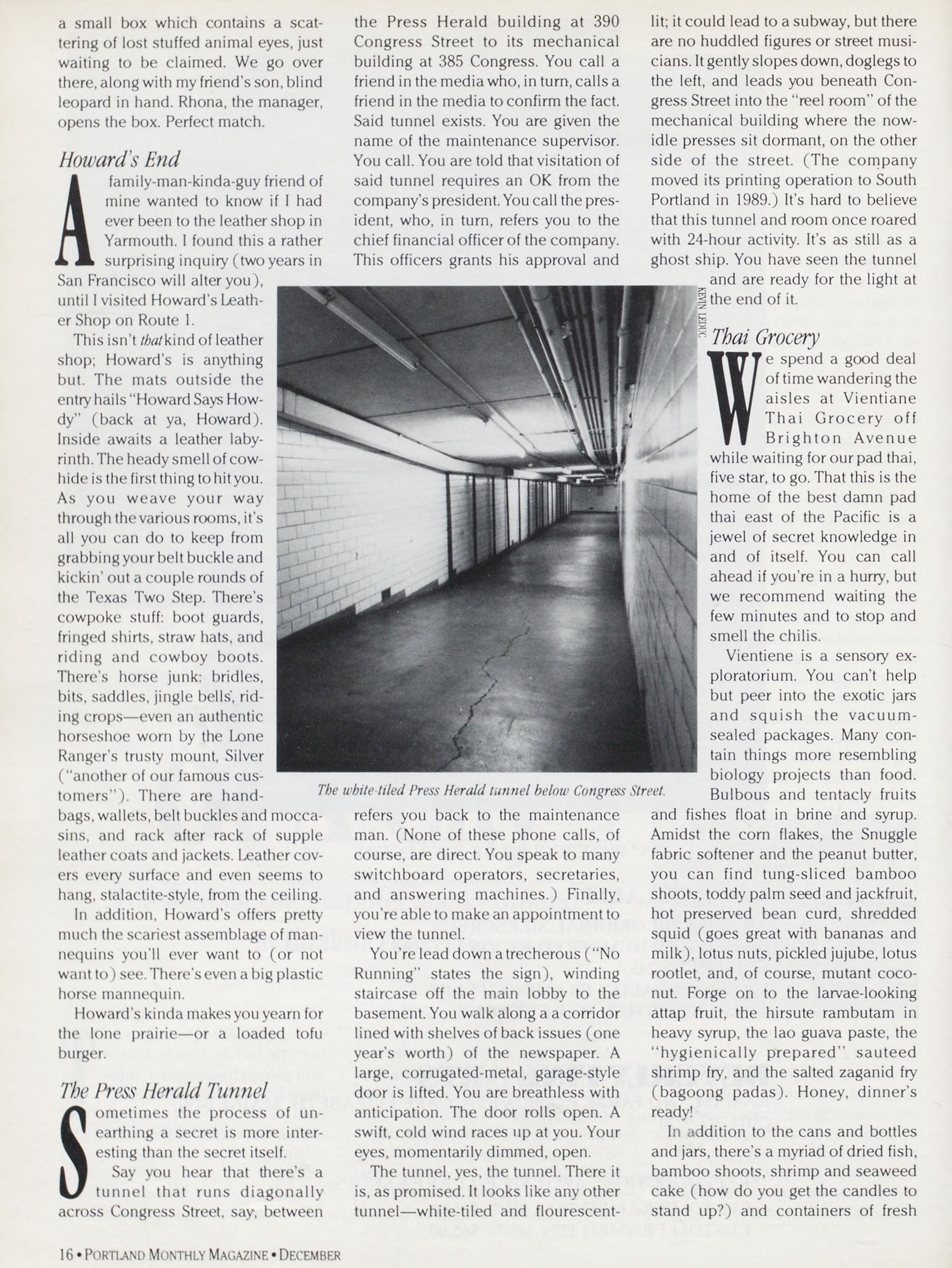 Didyouknowthatthere'satunnelthatdivesbelowCongressStreetandcomes upontheotherside,connectingthePortlandPressHeraldandanother building?Doyouknowwherethelocalrendezvousspotsareforlovers—inthe noviceandexpertcategories?OurstafftreatsyoutoatourofTheBestof UnderappreciatedPortland,ahostofattractions,eateries,businesses,and hideoutsthatarefarmorethanmeettheeye.StorybyEltahethPeavey,photographsby SeiinLeDuc.