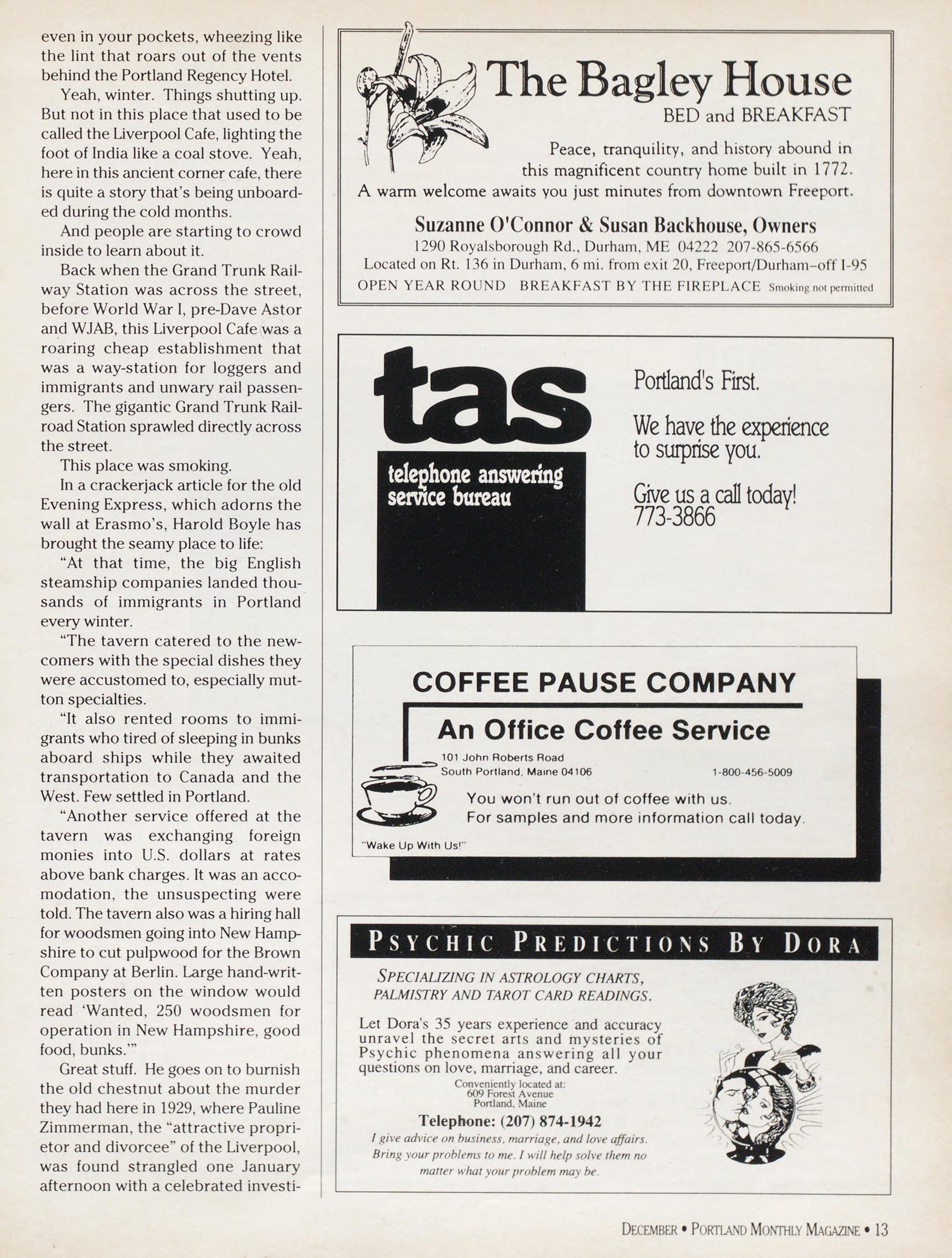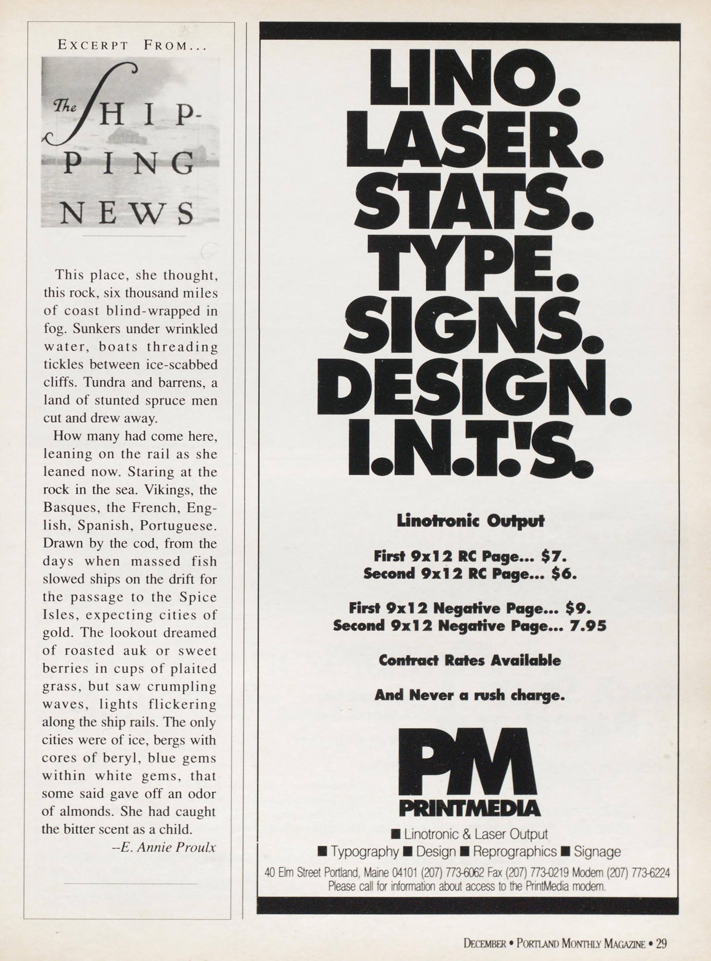 Newsstand Cover Date: December 1 993, published November 1 993, Vol. 8 No. 9. copyright 1993. PORTLAND Monthly Magazine is mailed at third-class mail rates in Portland. ME 04101 (ISSN: 0887-5340). Opinions expressed in articles are those of authors and do not represent editorial portions of PORTLAND Monthly Magazine. Responsible only for that portion of any advertisement which is printed incorrectly, and as compensation we will run a correction in the following issue. Nothing in this issue may be reprinted in whole or in part without written permission from the publishers. Submissions welcome, but we take no responsibility for unsolicited materials.