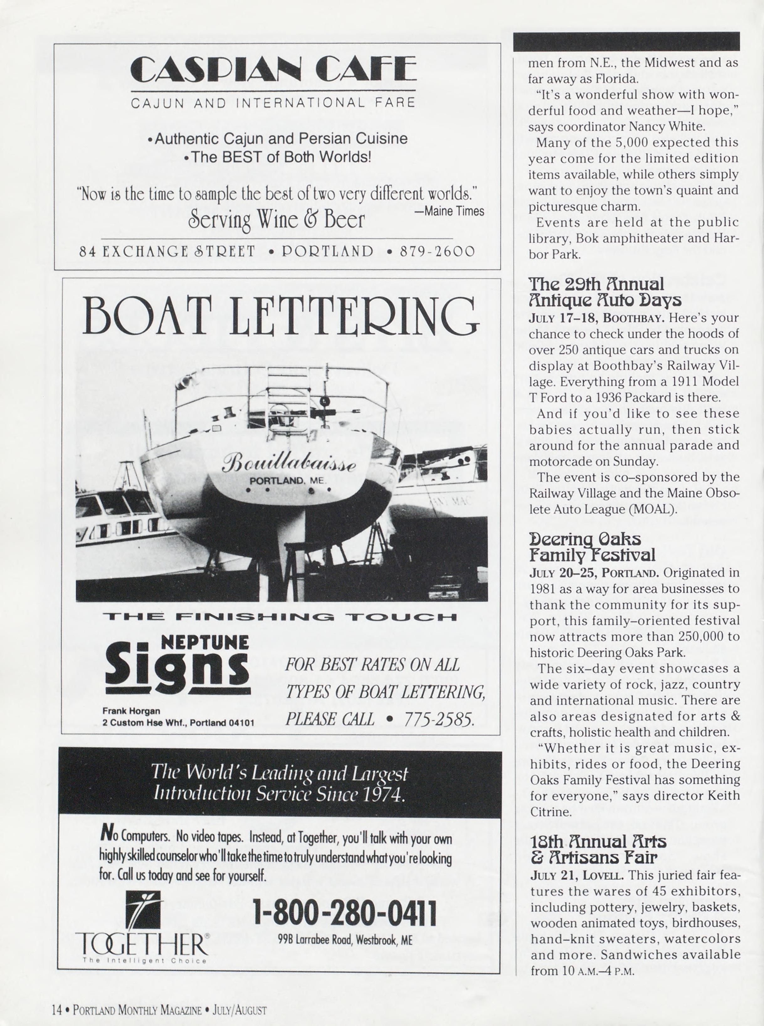 Newsstandcoverdate:July/Augusl1993,publ. July1993,Vol.8,No.5,copyright1993.PORT¬ LAND Monthly Magazine is mailed at thirdclass mail rates in Portland, ME04101. (ISSN 0887-5340).Opinionsexpressedinarticlesare thoseofauthorsanddonotrepresenteditorial positions of PORTLAND Monthly Magazine. Responsibleonlyforthatportionofanyadver¬ tisement which is printed incorrectly, and as compensation we will run a correction in the following issue. Nothing in this issue may be reprinted in whole or in part without written permission from the publishers. Submissions welcome, but we take no responsibility for unsolicitedmaterials.