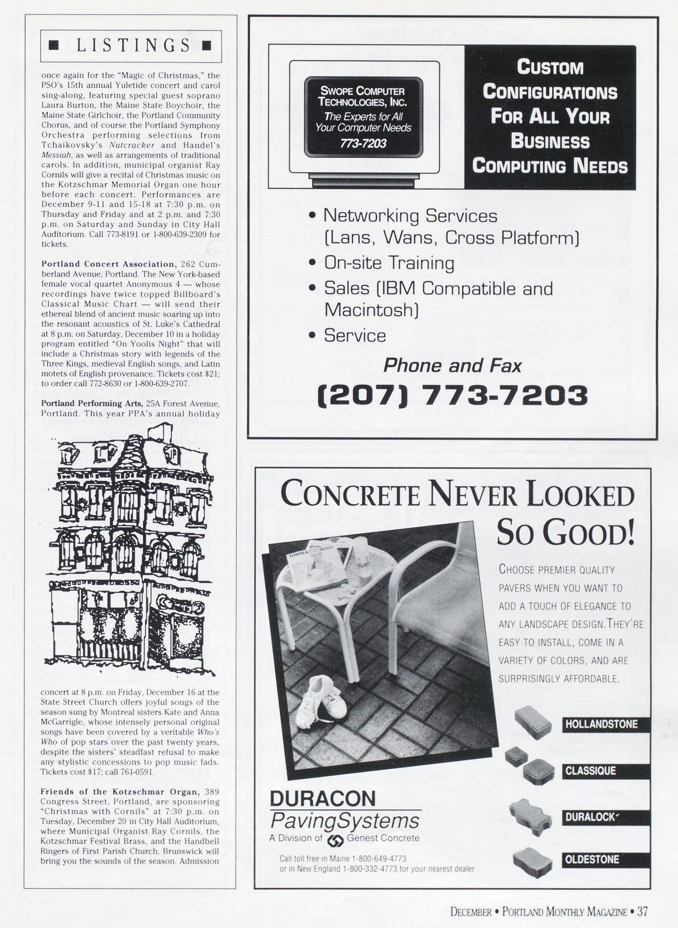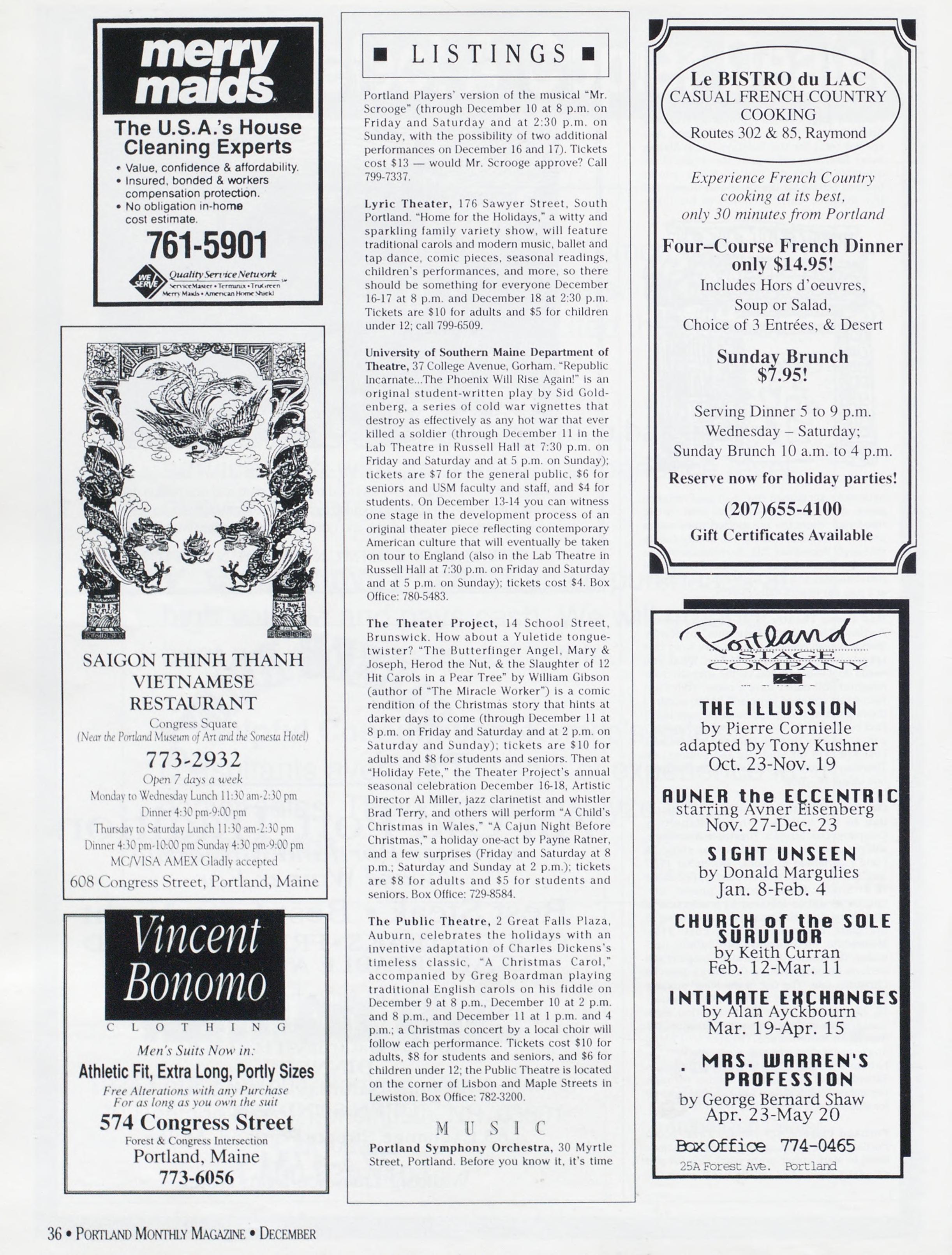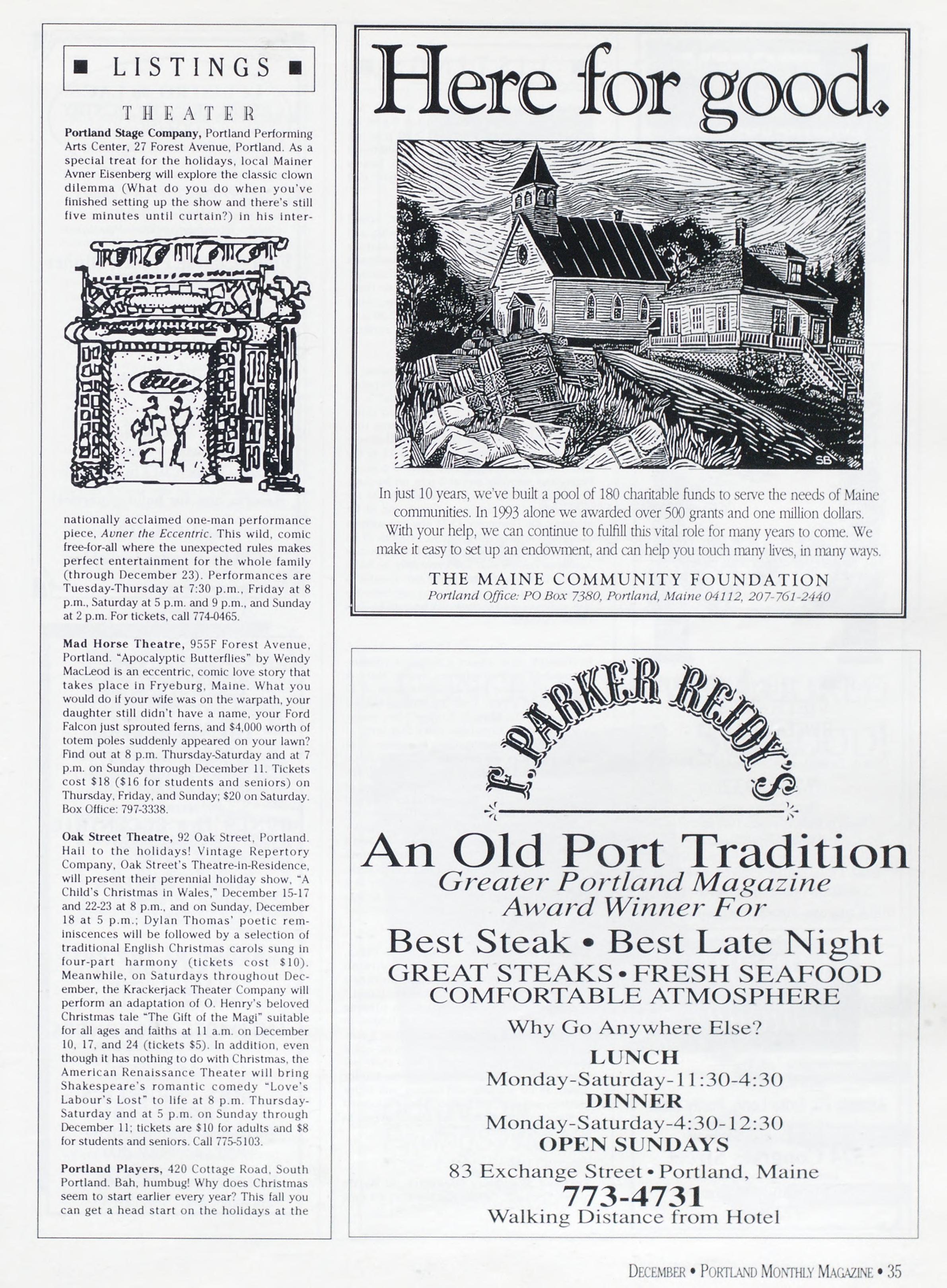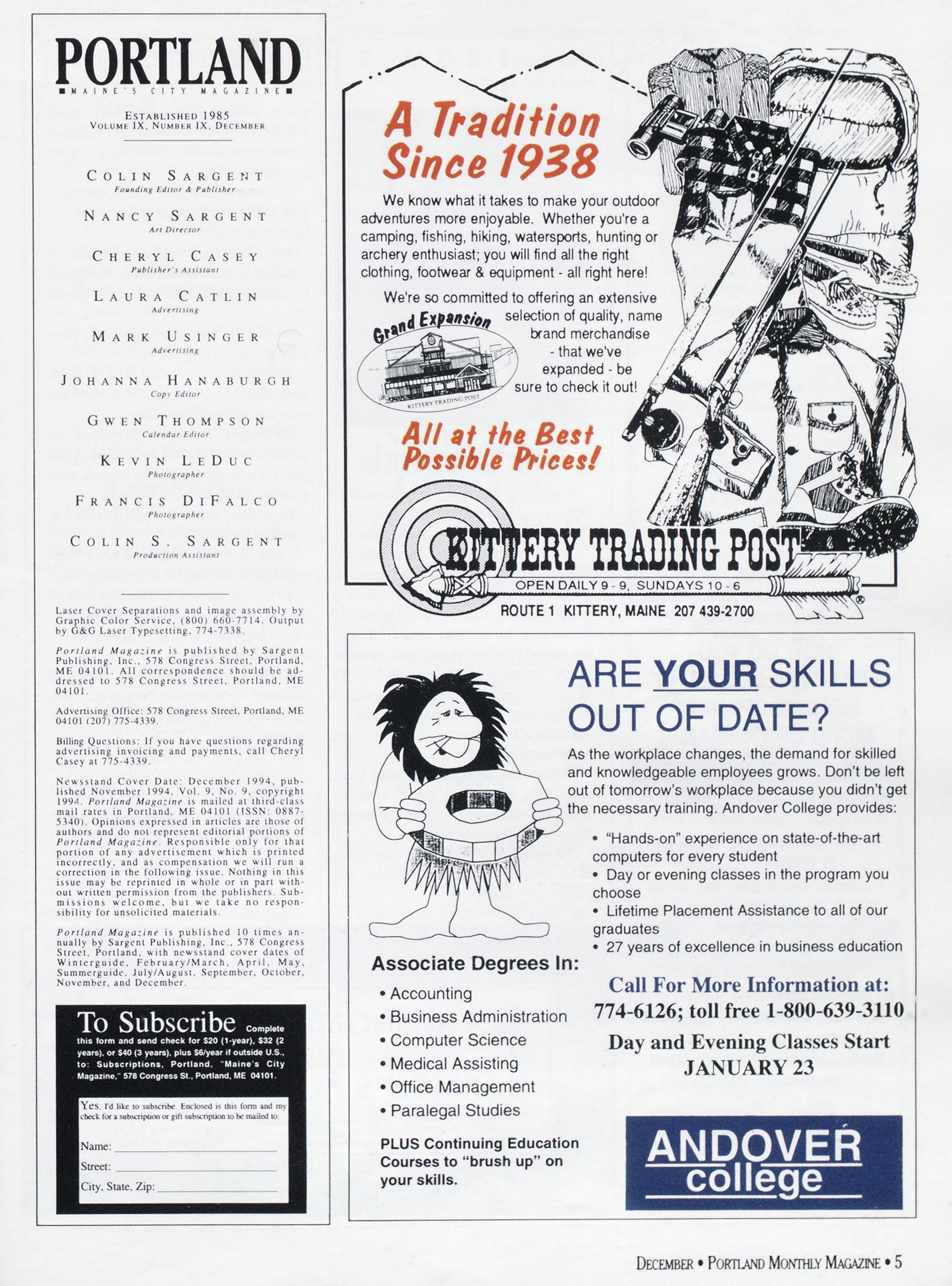 Newsstand Cover Date: December 1994, pub¬ lished November 1994. Vol. 9. No. 9. copyright 1994. Portland Magazine is mailed at third-class mail rates in Portland. ME 04101 (ISSN: 08875340). Opinions expressed in articles are those of authors and do not represent editorial portions of Portland Magazine. Responsible only for that portion of any advertisement which is printed incorrectly, and as compensation we will run a correction in the following issue. Nothing in this issue may be reprinted in whole or in part with¬ out written permission from the publishers. Sub¬ missions welcome, but we take no respon¬ sibility for unsolicited materials.