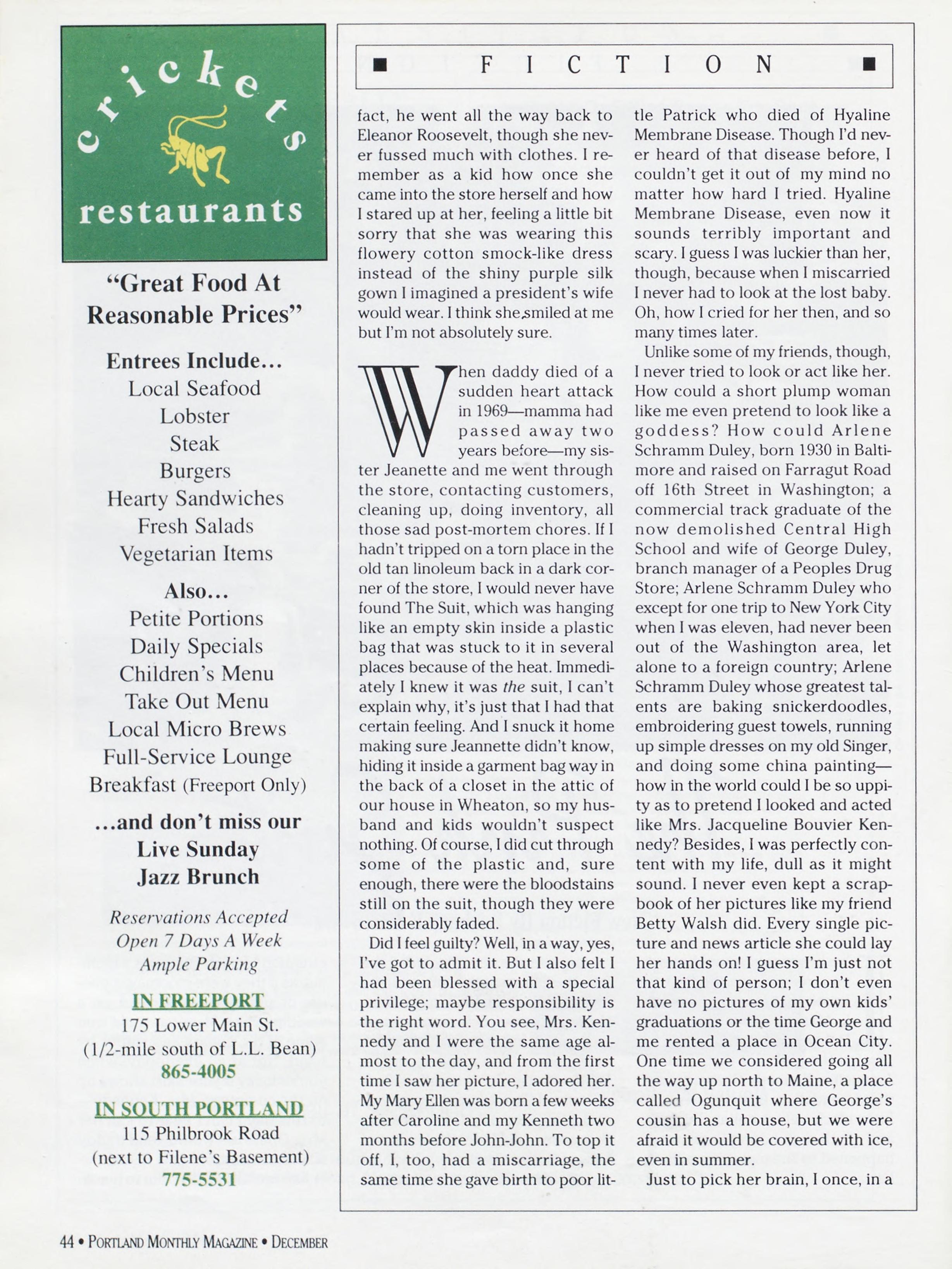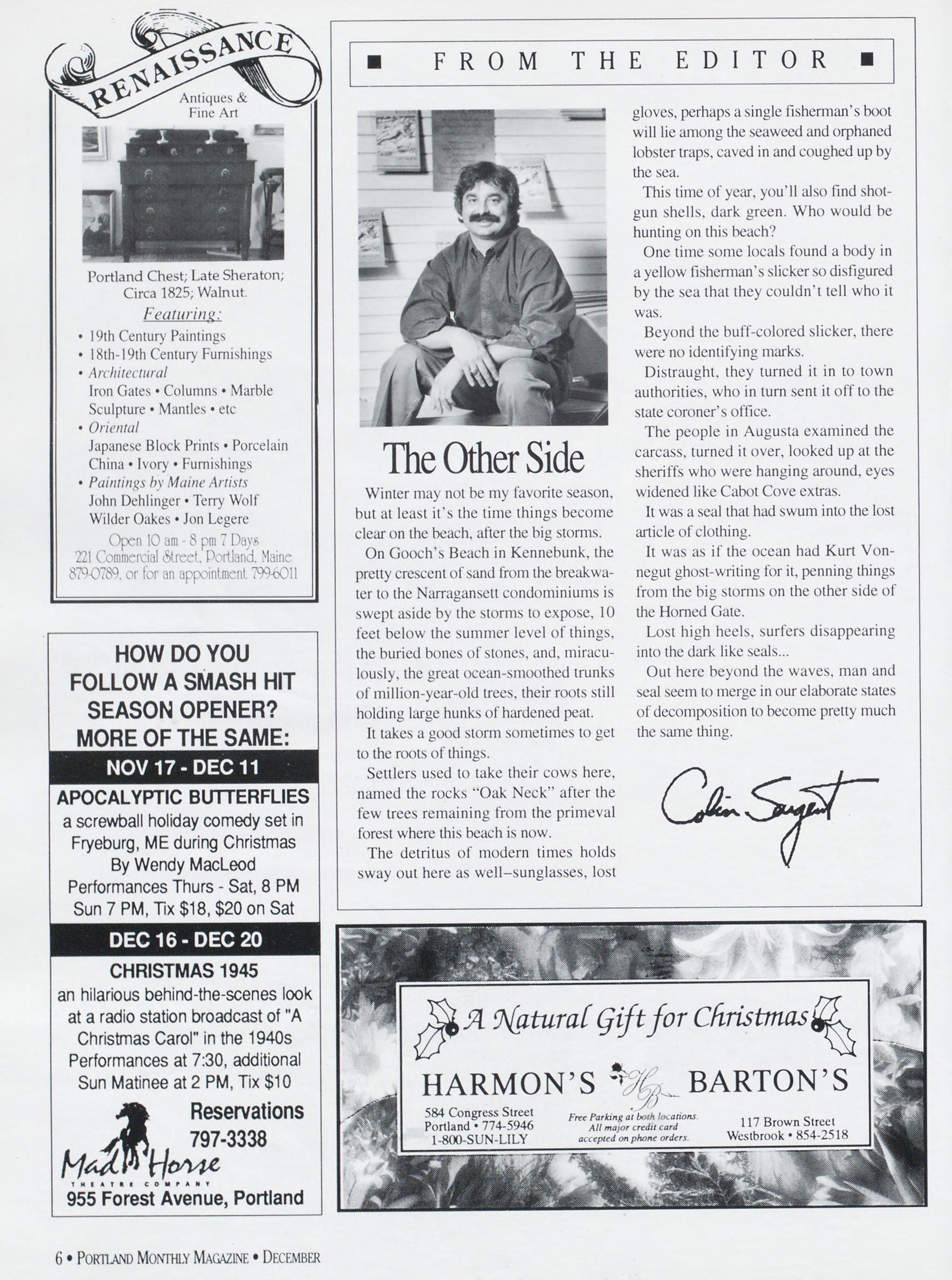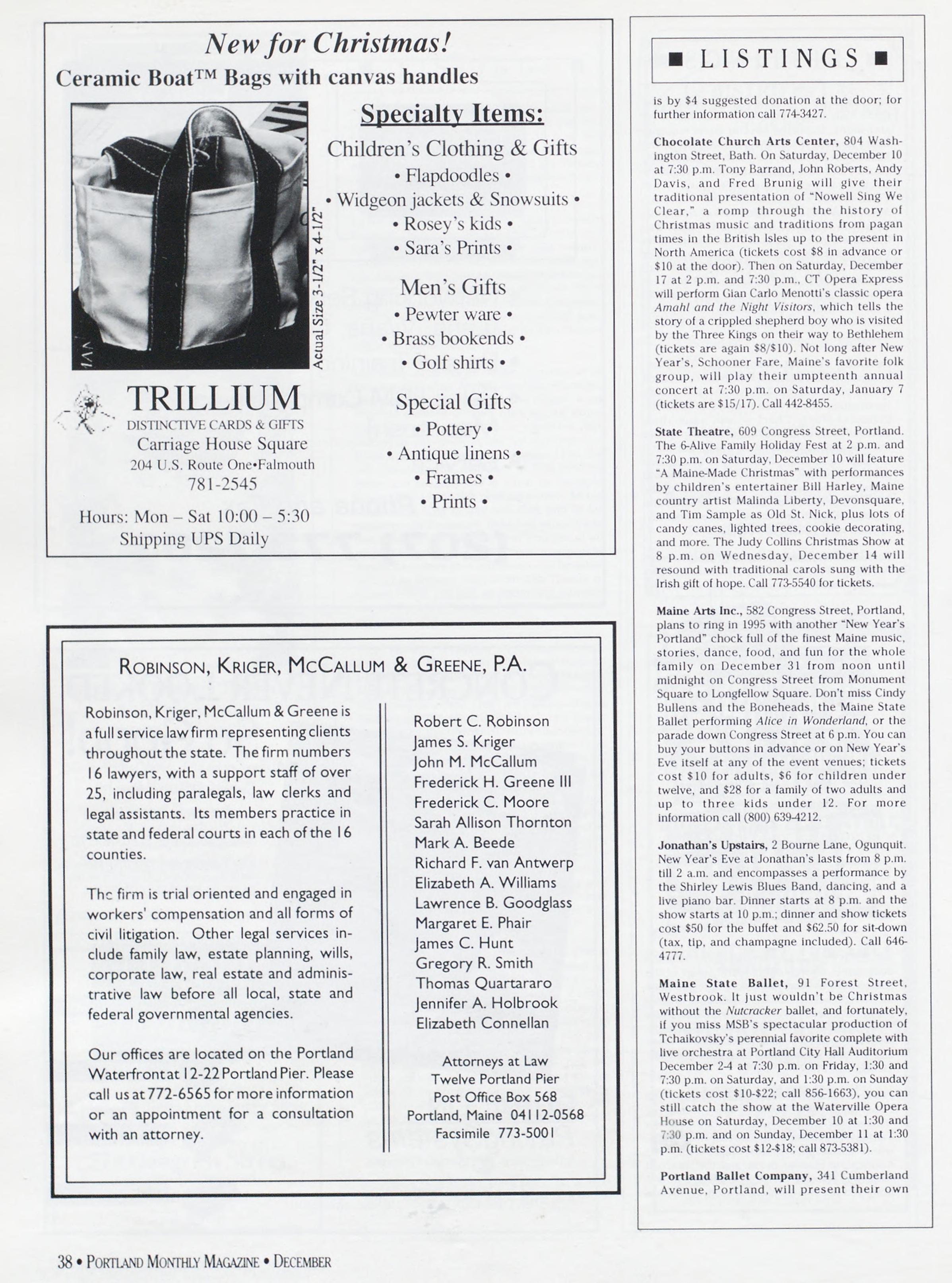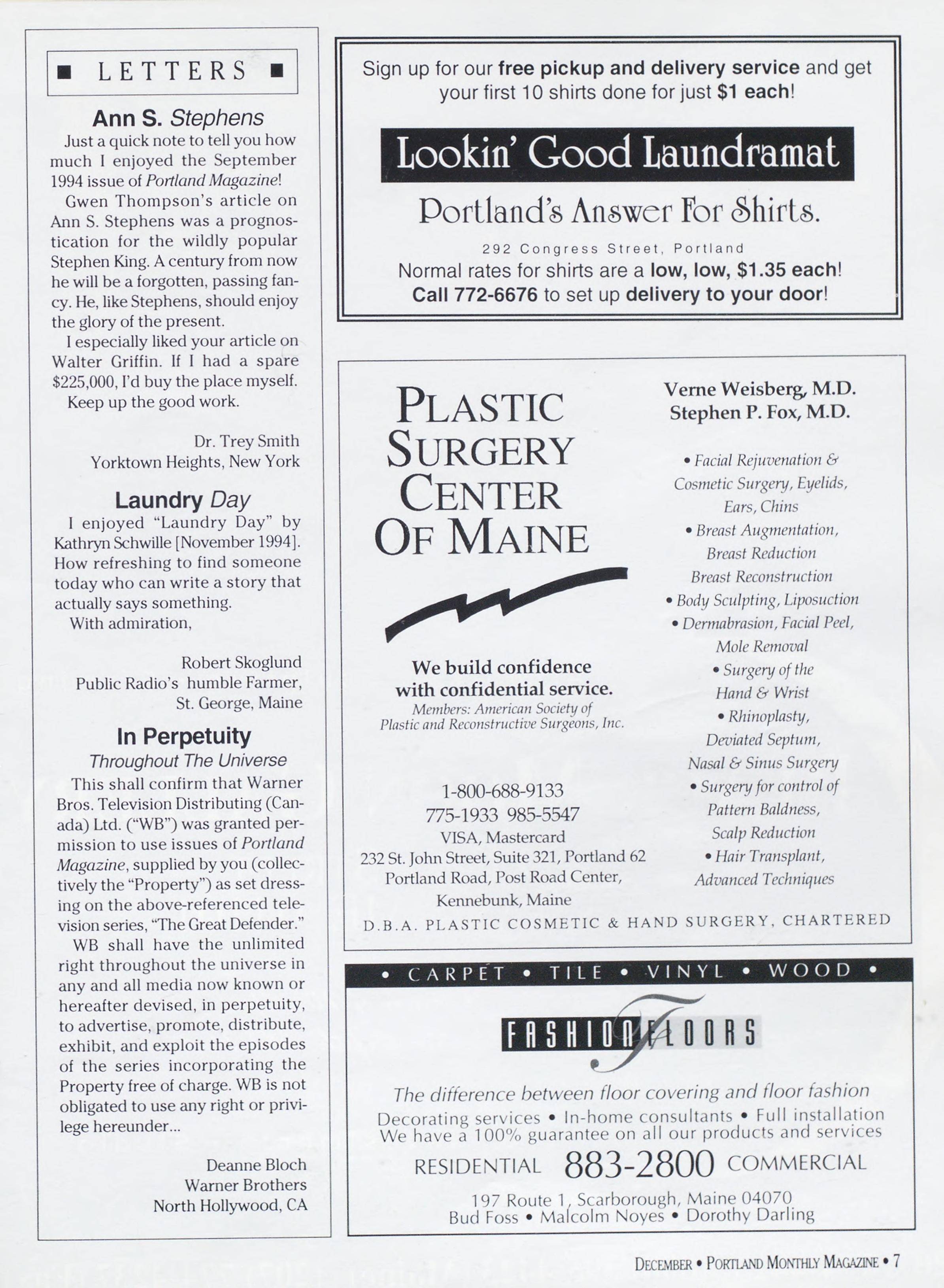 Newsstand Cover Date: December 1994, pub¬ lished November 1994. Vol. 9. No. 9. copyright 1994. Portland Magazine is mailed at third-class mail rates in Portland. ME 04101 (ISSN: 08875340). Opinions expressed in articles are those of authors and do not represent editorial portions of Portland Magazine. Responsible only for that portion of any advertisement which is printed incorrectly, and as compensation we will run a correction in the following issue. Nothing in this issue may be reprinted in whole or in part with¬ out written permission from the publishers. Sub¬ missions welcome, but we take no respon¬ sibility for unsolicited materials.