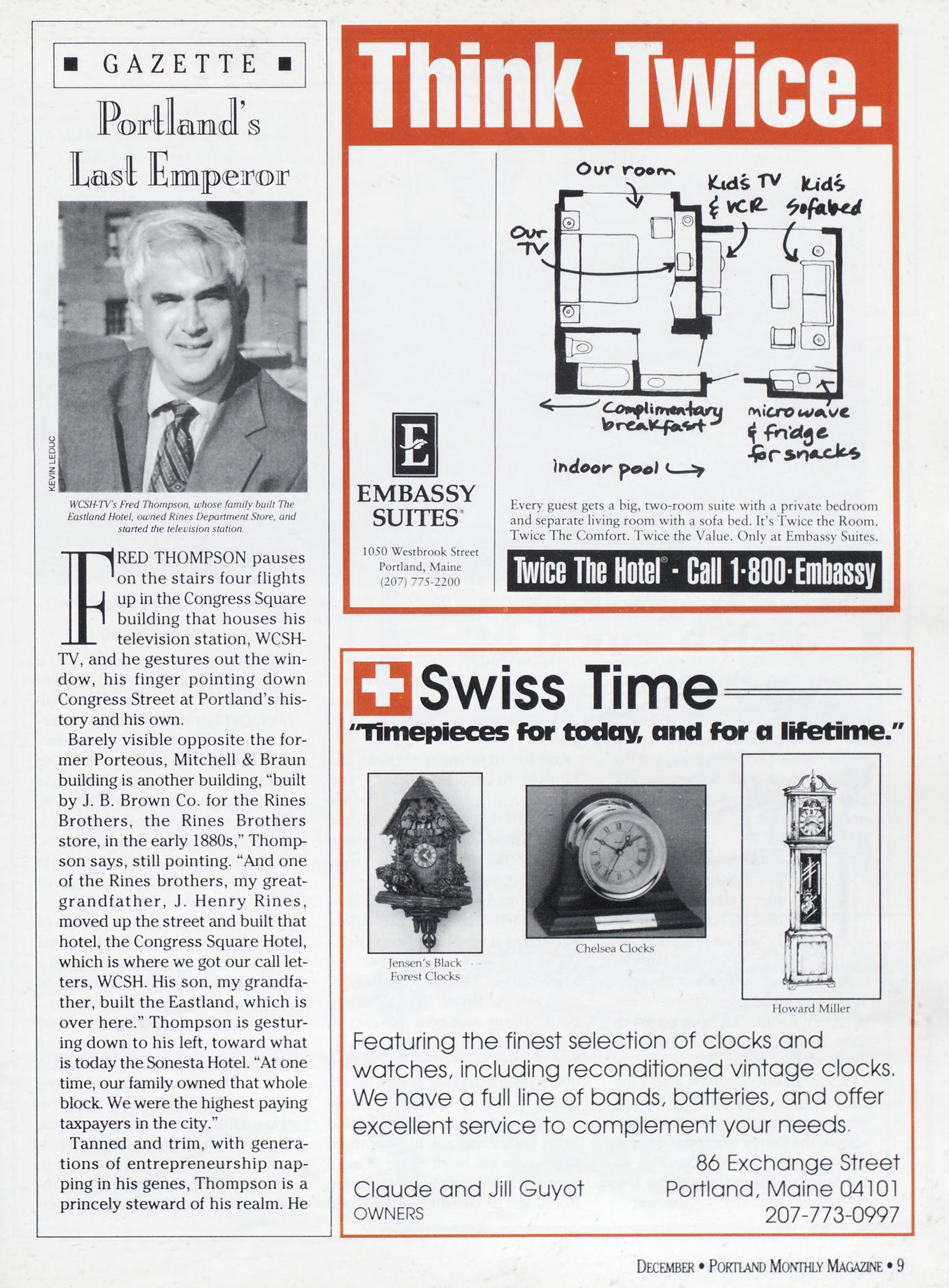 J.Henryoftenthoughtabout thosefancyhotelsofEur¬ ope,andeventuallydecided toexpandthefamilybusi¬ nessbybuildingafirst-class hotelrightinPortland.In1894he boughtastandinghotel,toreit down,anderectedtheCongress SquareHotelinitsplace.Happen¬ stanceledthefamily’snextgener¬ ationintobroadcasting.J.Henry’s son,HenryP.,grownupandpres¬ identoftheCongressSquareHot¬ el Co., met a young engineer namedBillFosswhohadtheidea ofbuildingaradiostation.Accord¬ ingtofamilystories,Fosshad knocked on the door of nearly everybusinessonCongressStreet beforereachingHenryP.’soffice. “Ithinkradio’sreallygoingtobe
