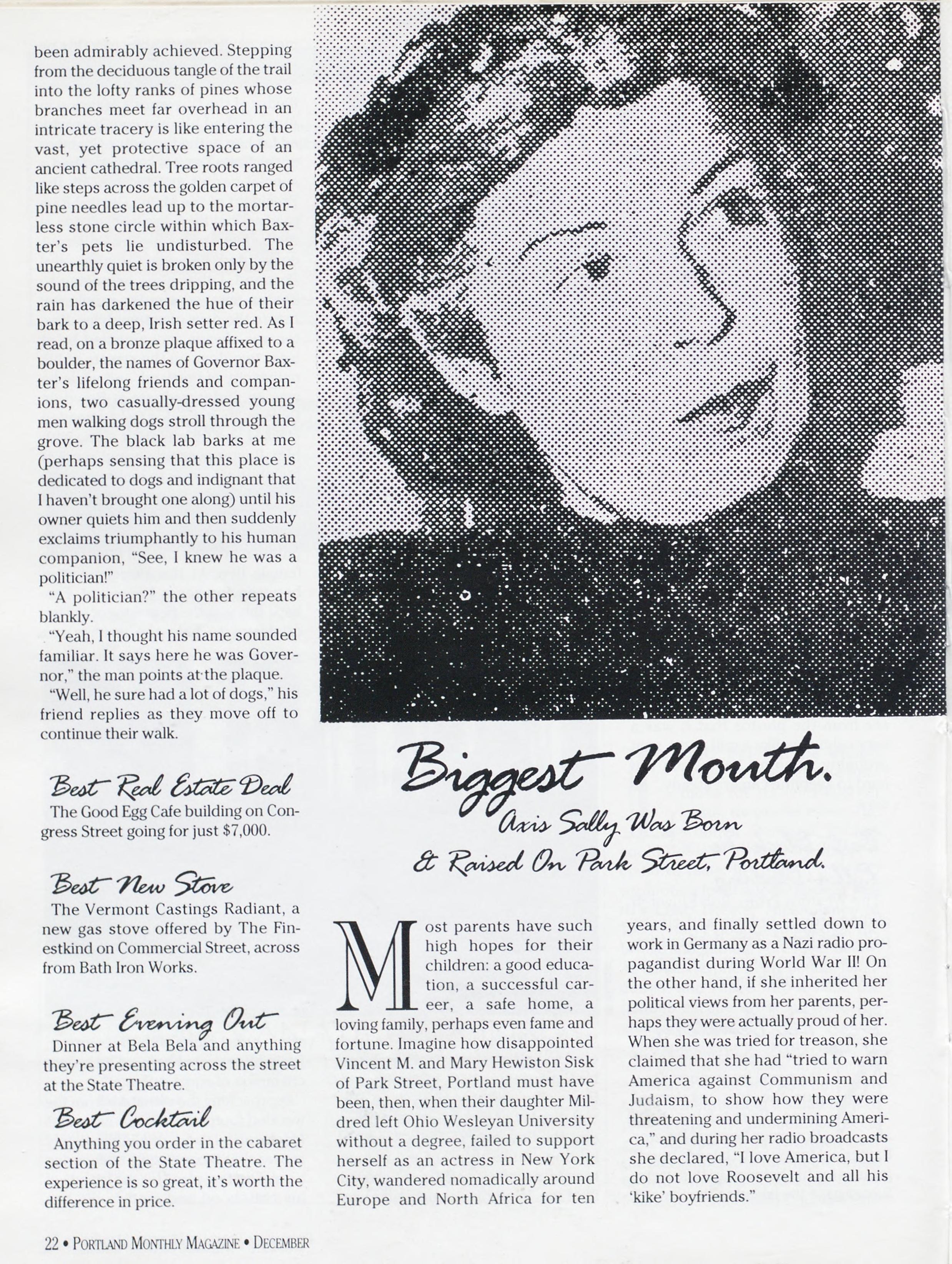 Knownontheairas“Midgeatthe Mike”anddubbed“AxisSally”bythe Americansoldierswholistenedto herbroadcasts,MildredGillars(after herparentsdivorcedin1907andher motherremarried,sheadoptedher stepfather’slastname)probablyhad amultitudeofreasonsforhertrea¬ son. For one thing, she had long soughtthespotlightwithlittlesuc¬ cess,andworkingforRadioBerlin finallyprovidedherwiththecaptive audience she desired. And after yearsofscrapingtomakeendsmeet, shewouldnothavebeenlikelyto turnuphernoseatthehighest-paid Nazibroadcastingposition.More¬ over, the Nazi radio propaganda directorwhogotherthejob—Max OttoKoischwitz—hadbeenherGer¬ manprofessoratHunterCollegein NewYork,whereGillarswasbutone of many female students to have crushesonhim.Butwhethersheact¬ ed out of love for Koischwitz or whetherhecoercedherwiththreats oftheGestapo,ashertriallawyerlat¬ ersuggested,hisdeathin1944left Gillarspatronlessandunprotected. TwoyearslaterAlliedcounter-intel¬ ligenceofficersarrestedherina bombed-outBerlincellarandsubse¬ quentlybroughtherbacktotheUnit¬ edStatesforalengthytrialduring whichshewasfoundguiltyofonly oneofthetencountsoftreason— crimespunishablebydeath—with whichshehadbeenchargedbythe U.S.government.Incredibly,after servingtwelveyearsinafederal women’spenitentiaryinWestVir¬ ginia, Gillars worked as a music teacherinaRomanCatholicconvent whileatlonglastcompletingher degreeinspeechatOhioWesleyan fifty-fiveyearsaftershefirstenrolled. AlthoughherearliercareerasaNazi discjockeyseemshorrifyinginret¬ rospect, the American G.l.s who heard her broadcasts apparently found them more amusing than demoralizingandenjoyedalltheTin PanAlleytunessheplayedonher shows.AndsinceGillarshadalready movedawayfromMainetotheMid¬ westbythetimeshewasten,Port¬ landerscanalwaysconcludethatit must have been something she encounteredinOhiothatledtoher lifeofcrime.