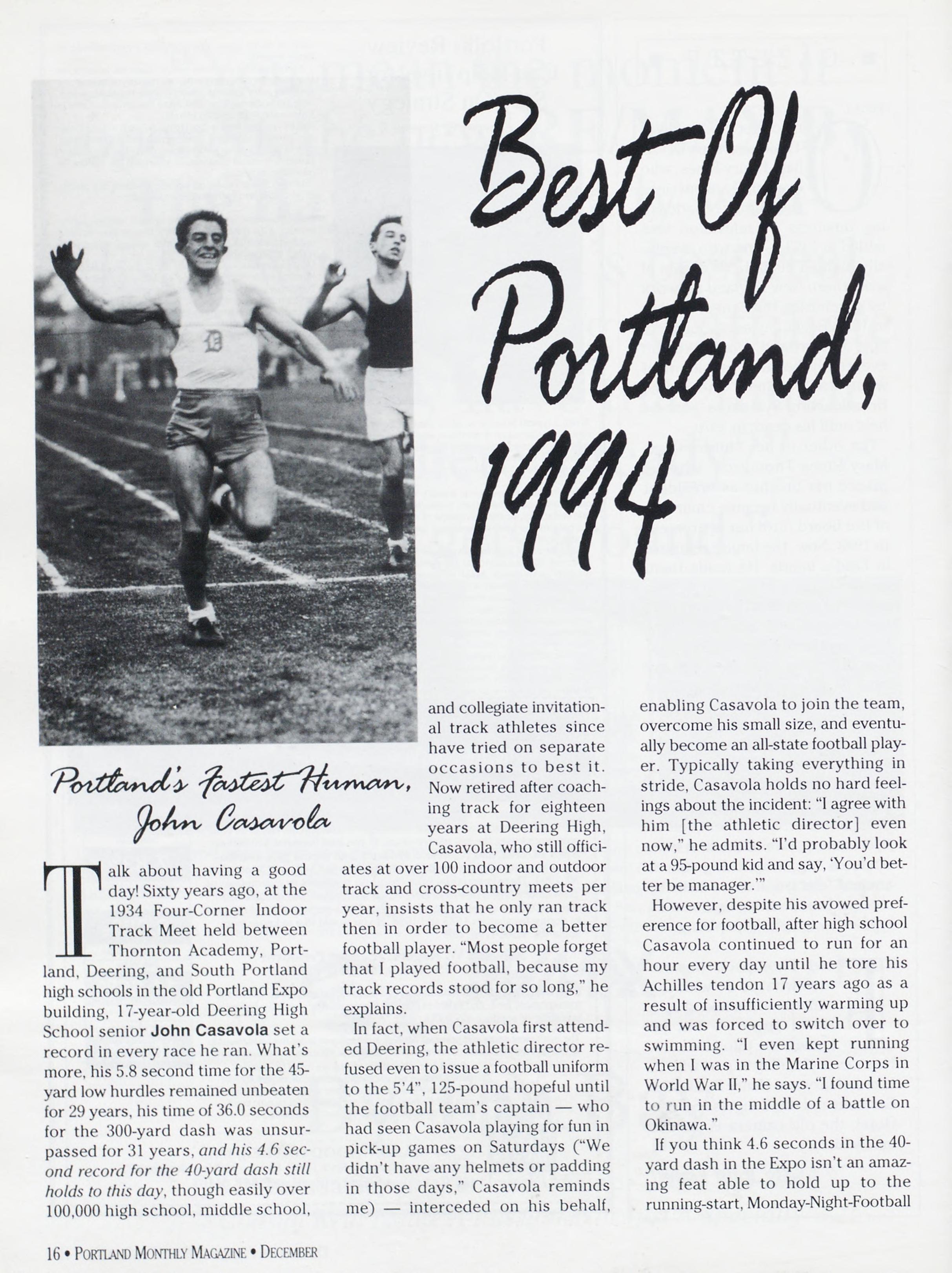 k I | i alk about having a good ' I day! Sixty years ago, at the I 1934 Four-Corner Indoor I Track Meet held between IThornton Academy, Port¬ land,Deering,andSouthPortland highschoolsintheoldPortlandExpo building,17-year-oldDeeringHigh Schoolsenior John Casavola seta recordineveryraceheran.What’s more,his5.8secondtimeforthe45yardlowhurdlesremainedunbeaten for29years,histimeof36.0seconds for the 300-yard dash was unsur¬ passedfor31years, andhis4.6sec¬ ondrecordforthe40-yarddashstill holdstothisday, thougheasilyover 100,000highschool,middleschool,