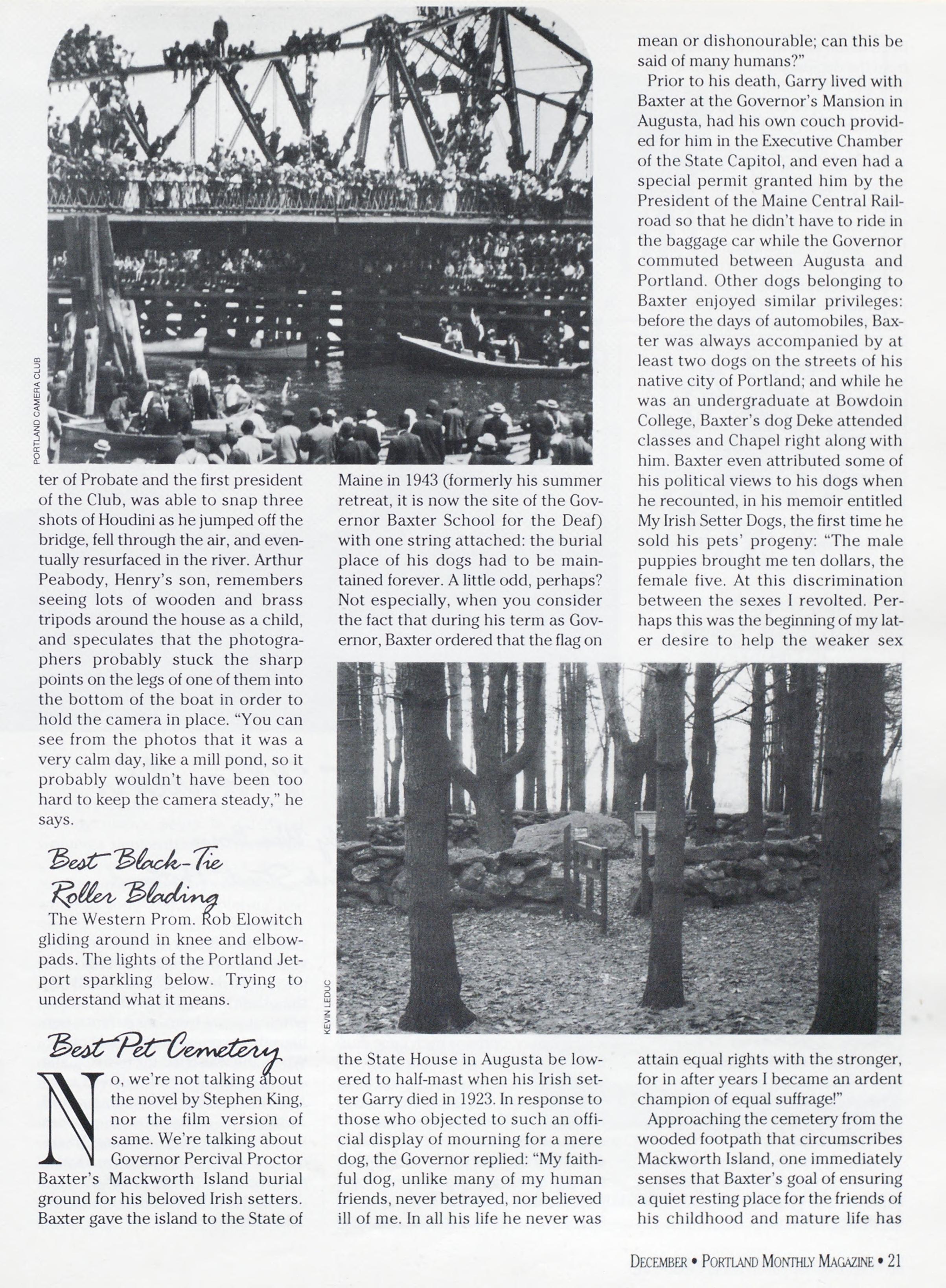 Priortohisdeath,Garrylivedwith BaxterattheGovernor’sMansionin Augusta,hadhisowncouchprovid¬ edforhimintheExecutiveChamber oftheStateCapitol,andevenhada specialpermitgrantedhimbythe PresidentoftheMaineCentralRail¬ roadsothathedidn’thavetoridein thebaggagecarwhiletheGovernor commuted between Augusta and Portland.Otherdogsbelongingto Baxterenjoyedsimilarprivileges: beforethedaysofautomobiles,Bax¬ ter was always accompanied by at leasttwodogsonthestreetsofhis nativecityofPortland;andwhilehe was an undergraduate at Bowdoin College,Baxter’sdogDekeattended classesandChapelrightalongwith him.Baxterevenattributedsomeof terofProbateandthefirstpresident oftheClub,wasabletosnapthree shotsofHoudiniashejumpedoffthe bridge,fellthroughtheair,andeven¬ tuallyresurfacedintheriver.Arthur Peabody, Henry’s son, remembers seeing lots of wooden and brass tripodsaroundthehouseasachild, andspeculatesthatthephotogra¬ phers probably stuck the sharp pointsonthelegsofoneoftheminto thebottomoftheboatinorderto holdthecamerainplace.“Youcan seefromthephotosthatitwasa verycalmday,likeamillpond,soit probably wouldn’t have been too hardtokeepthecamerasteady,”he says.