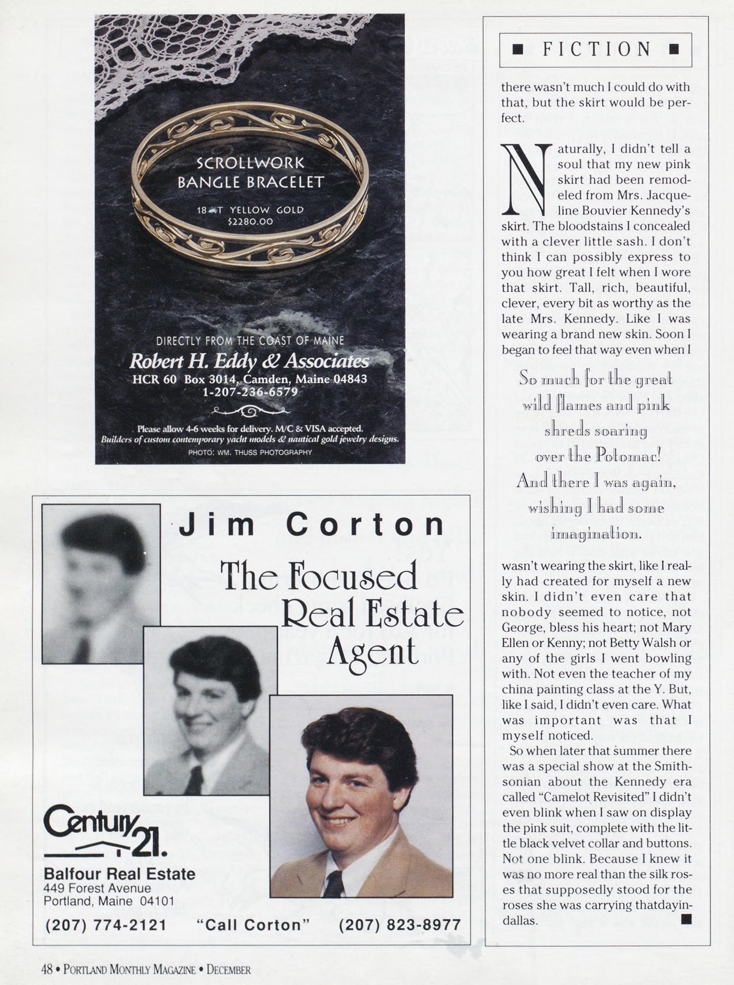 Unlikesomeofmyfriends,though, Inevertriedtolookoractlikeher. How could a short plump woman likemeevenpretendtolooklikea goddess? How could Arlene SchrammDuley,born1930inBalti¬ moreandraisedonFarragutRoad off16thStreetinWashington;a commercialtrackgraduateofthe now demolished Central High SchoolandwifeofGeorgeDuley, branchmanagerofaPeoplesDrug Store; Arlene Schramm Duley who exceptforonetriptoNewYorkCity whenIwaseleven,hadneverbeen out of the Washington area, let alonetoaforeigncountry;Arlene SchrammDuleywhosegreatesttal¬ ents are baking snickerdoodles, embroideringguesttowels,running upsimpledressesonmyoldSinger, and doing some china painting— howintheworldcouldIbesouppi¬ tyastopretendIlookedandacted likeMrs.JacquelineBouvierKen¬ nedy?Besides,Iwasperfectlycon¬ tentwithmylife,dullasitmight sound.Ineverevenkeptascrap¬ bookofherpictureslikemyfriend BettyWalshdid.Everysinglepic¬ tureandnewsarticleshecouldlay herhandson!IguessI’mjustnot thatkindofperson;Idon’teven havenopicturesofmyownkids’ graduationsorthetimeGeorgeand merentedaplaceinOceanCity. Onetimeweconsideredgoingall thewayupnorthtoMaine,aplace called Ogunquit where George’s cousin has a house, but we were afraiditwouldbecoveredwithice, eveninsummer.