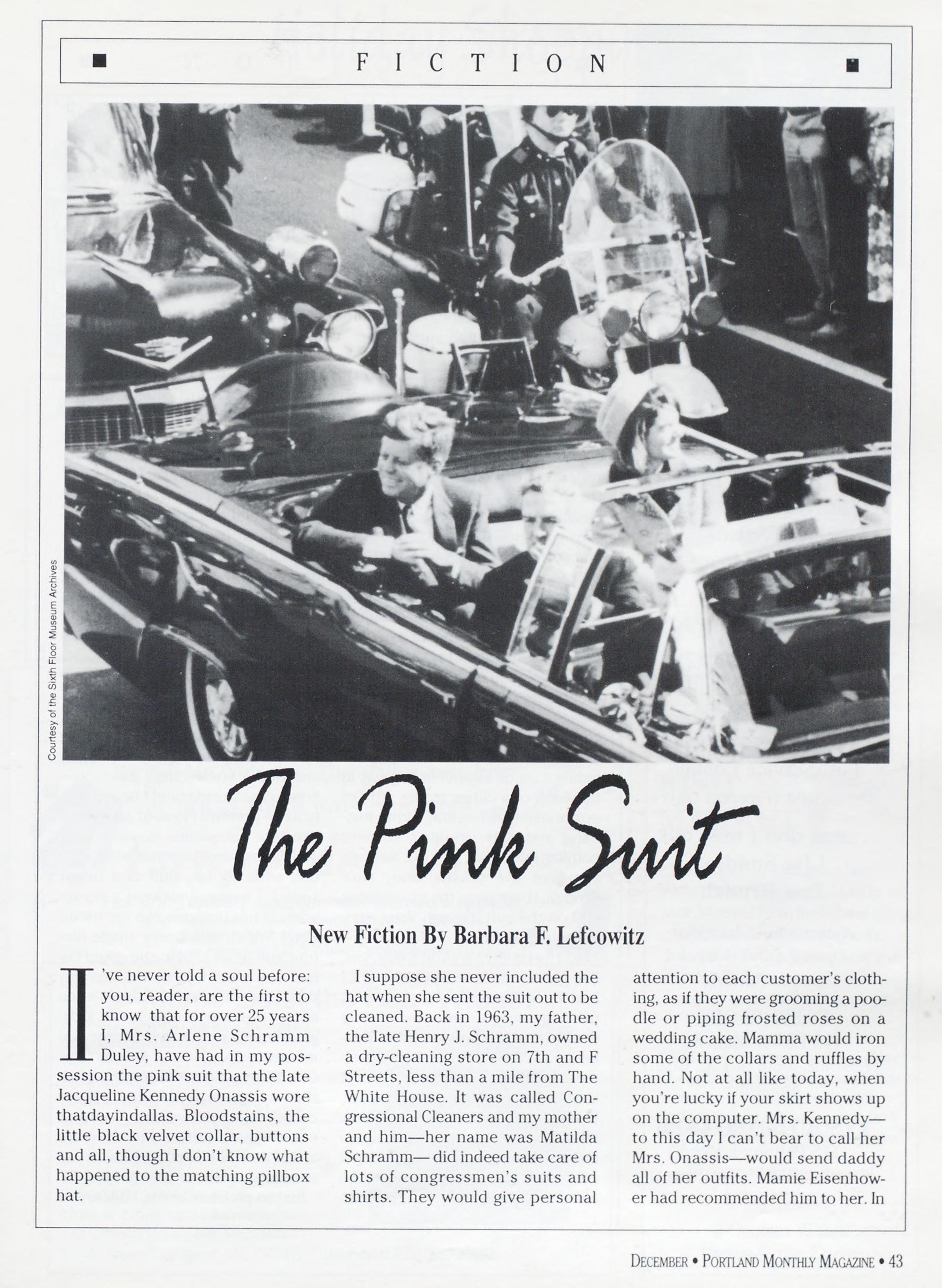 realcageyway,askedmydaughter MaryEllen(shewastakingcours¬ esatthecommunitycollege)what shewoulddoif she hadsecretpos¬ sessionofthepinksuit.Atfirst— wouldyoubelieveit—shesaidshe didn’tevenknowwhatIwastalking about.When1explained,shejust laughed.“Oh that pinksuit.With thelittleblackvelvetcollar?It’s nothing but a cliche.” When I pressedherfurther,shesaiditwas trite,outofdate,andshecouldn’t imagineforthelifeofherwhyI askedaboutsuchadumbthing. StillIwonderedwhattodowith it and back around 1978 ap¬ proached The Smithsonian about donatingthesuittothem,butI guesstheythoughtIwas justanotheroneofthose crackpots,likeallthose weirdoes writing books about assassination con¬ spiracies.Theynevergave meananswerevenafterI wentthereinperson,suitin hand,allnicelywrappedin afreshplasticbagandtied withpinkribbons.Soback itwentintotheatticcloset nobody ever opened. I myselfactuallyforgotabout itafterawhile.