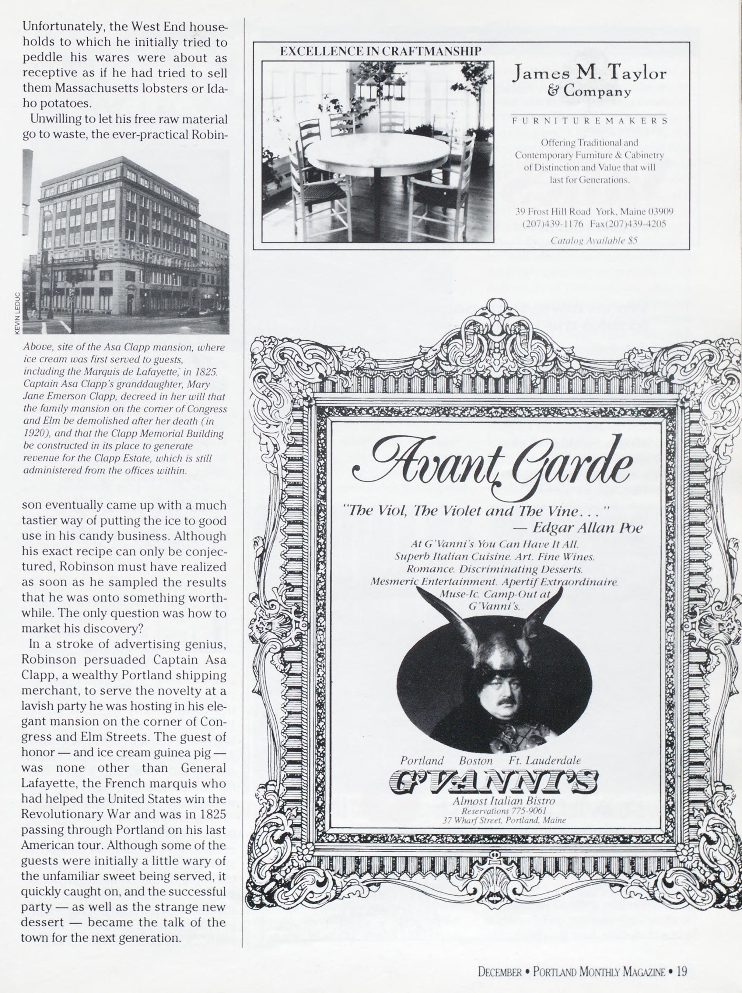 Inastrokeofadvertisinggenius, Robinson persuaded Captain Asa Clapp,awealthyPortlandshipping merchant,toservethenoveltyata lavishpartyhewashostinginhisele¬ gantmansiononthecornerofCon¬ gressandElmStreets.Theguestof honor—andicecreamguineapig— was none other than General Lafayette,theFrenchmarquiswho hadhelpedtheUnitedStateswinthe RevolutionaryWarandwasin1825 passingthroughPortlandonhislast Americantour.Althoughsomeofthe guestswereinitiallyalittlewaryof theunfamiliarsweetbeingserved,it quicklycaughton,andthesuccessful party—aswellasthestrangenew dessert — became the talk of the townforthenextgeneration.