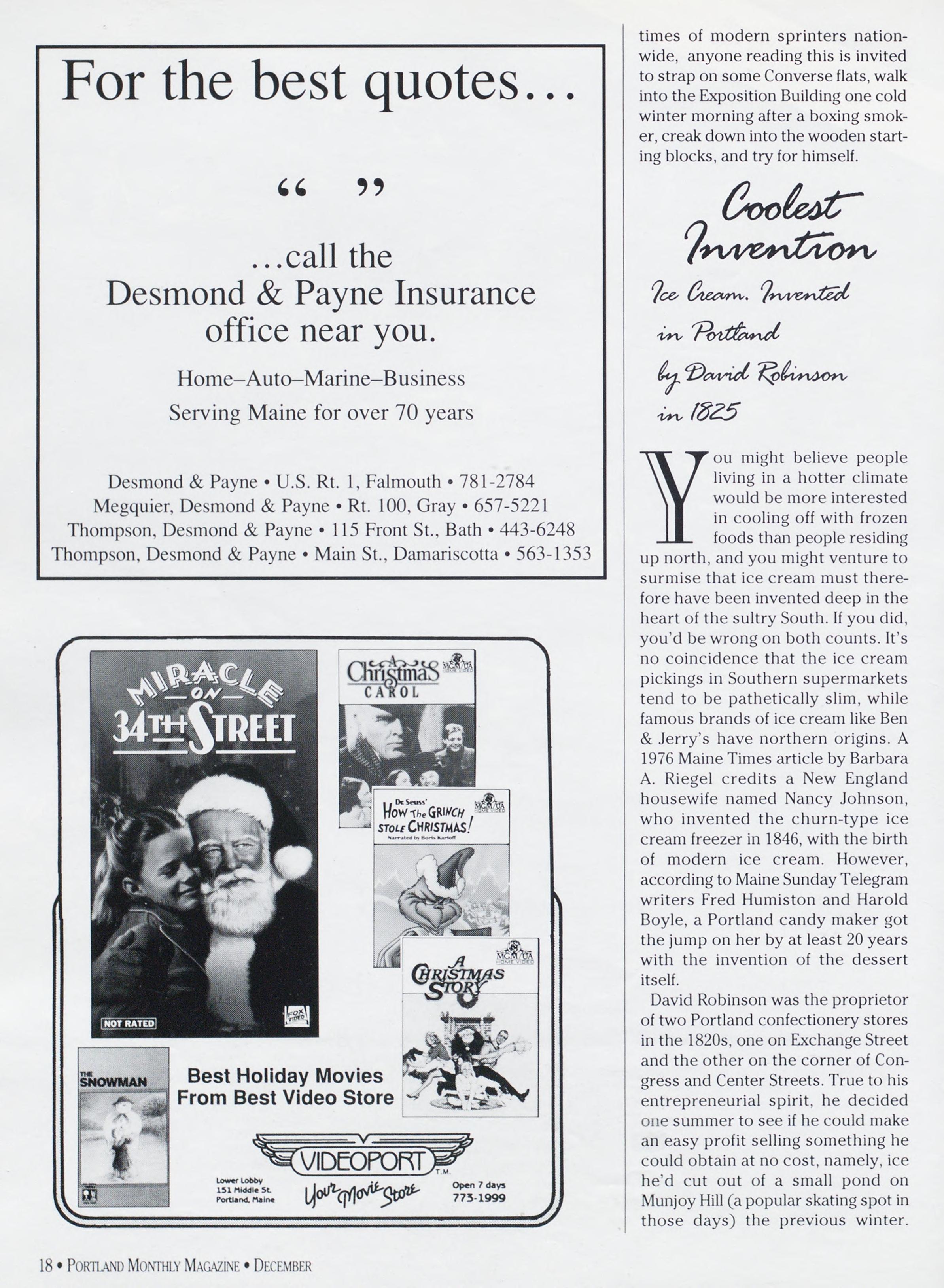 DavidRobinsonwastheproprietor oftwoPortlandconfectionerystores inthe1820s,oneonExchangeStreet andtheotheronthecornerofCon¬ gressandCenterStreets.Truetohis entrepreneurialspirit,hedecided onesummertoseeifhecouldmake aneasyprofitsellingsomethinghe couldobtainatnocost,namely,ice he’d cut out of a small pond on MunjoyHill(apopularskatingspotin those days) the previous winter.