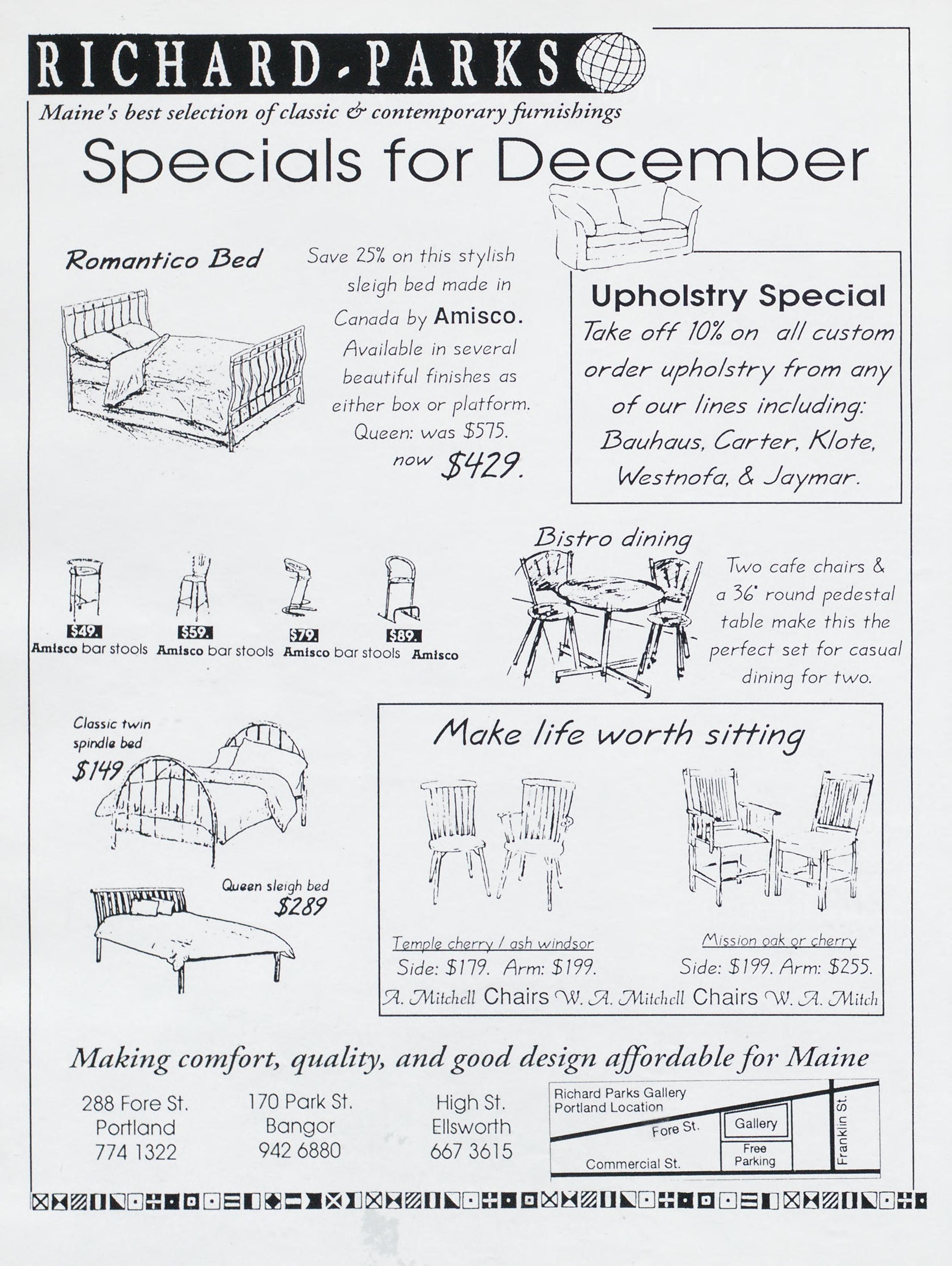Maine College of Art’s Baxter Gallery, 619 Congress Street. Portland. “Intimate Obser¬ vations" is a group show of contemporary paintersthatexploreshowtheartistsusescale and subject matter (through December 11); “Land Mines Project" by Bobby Neel Adams consistsofphotographsoflandminevictimsin Cambodia and Mozambique (in the Photo Gallery in the Baxter Building through December16).Admissionisfree;call775-5152 for gallery hours and information or 775-5154 for special viewing appointments. Also, don’t miss MECA’s Holiday Sale, featuring art and holiday goodies by MECA alumni and friends: December 9-11 at 50 Monument Square, 2-7 p.m.onFriday,9<a.m.-4p.m.onSaturday,and 10a.m.-2p.m.onSunday.Formoreinformation call773-1546.