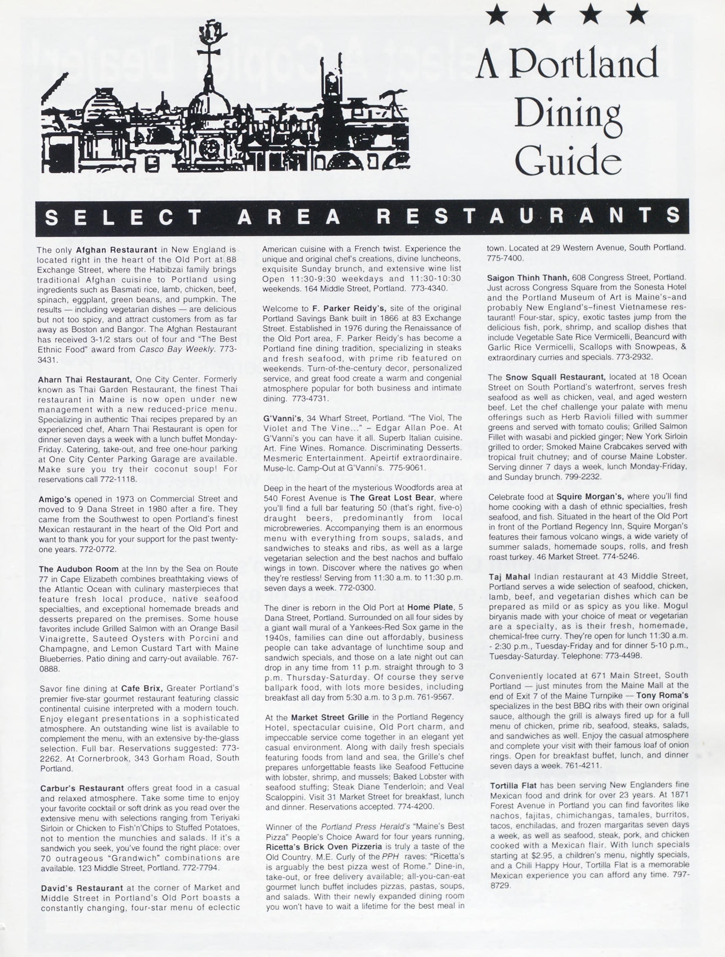 The Snow Squall Restaurant, located at 18 Ocean StreetonSouthPortland’swaterfront,servesfresh seafoodaswellaschicken,veal,andagedwestern beef.Letthechefchallengeyourpalatewithmenu offerings such as Herb Ravioli filled with summer greensandservedwithtomatocoulis;GrilledSalmon Filletwithwasabiandpickledginger;NewYorkSirloin grilledtoorder;SmokedMaineCrabcakesservedwith tropicalfruitchutney;andofcourseMaineLobster. Servingdinner7daysaweek,lunchMonday-Friday, and Sunday brunch. 799-2232.