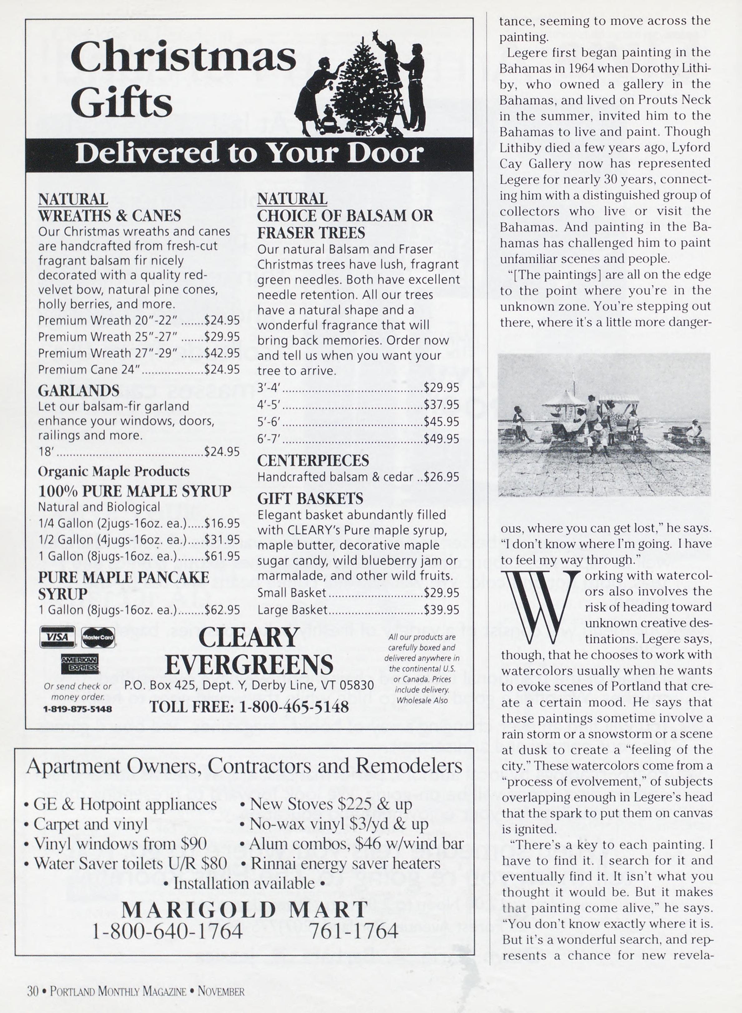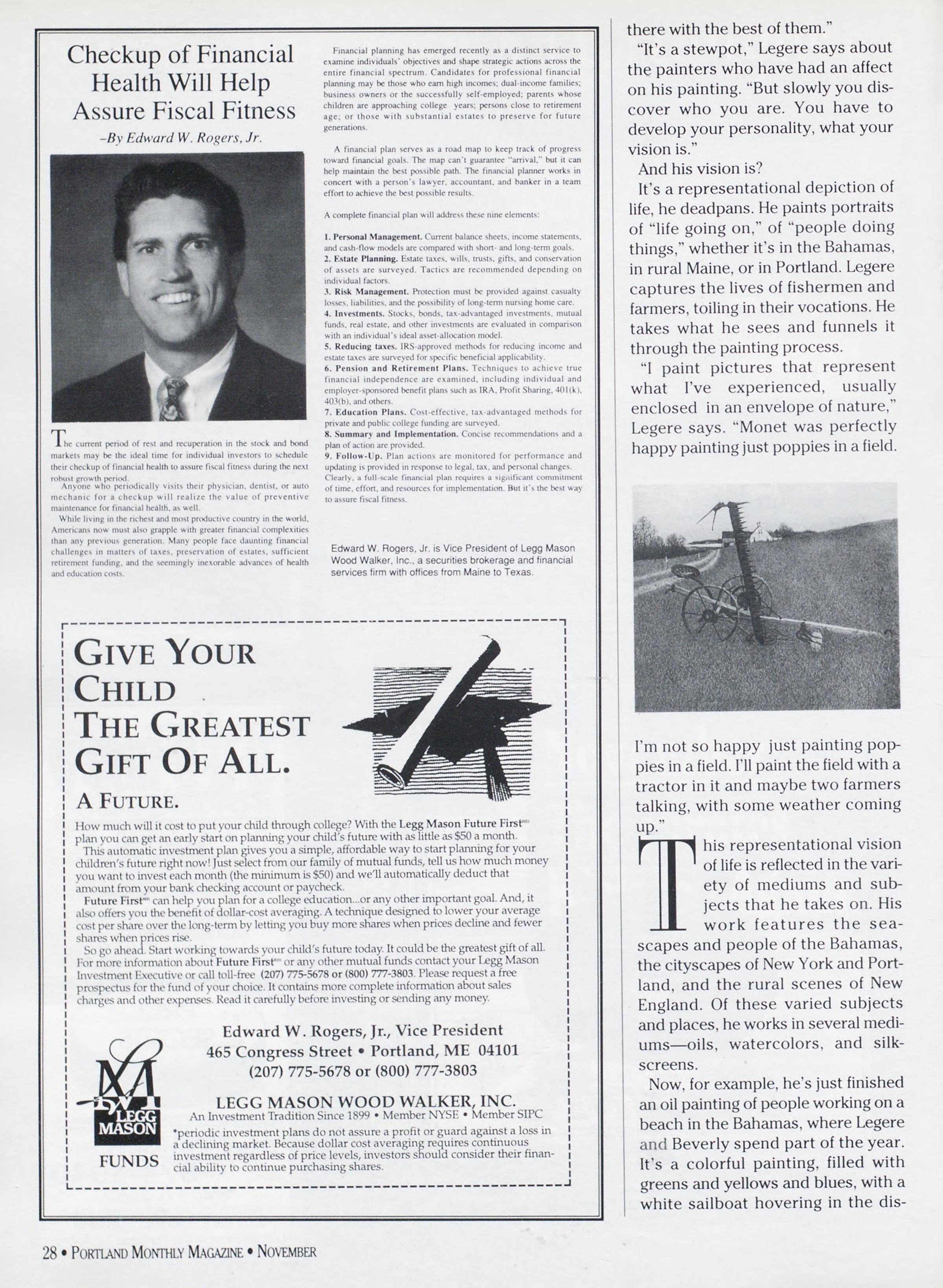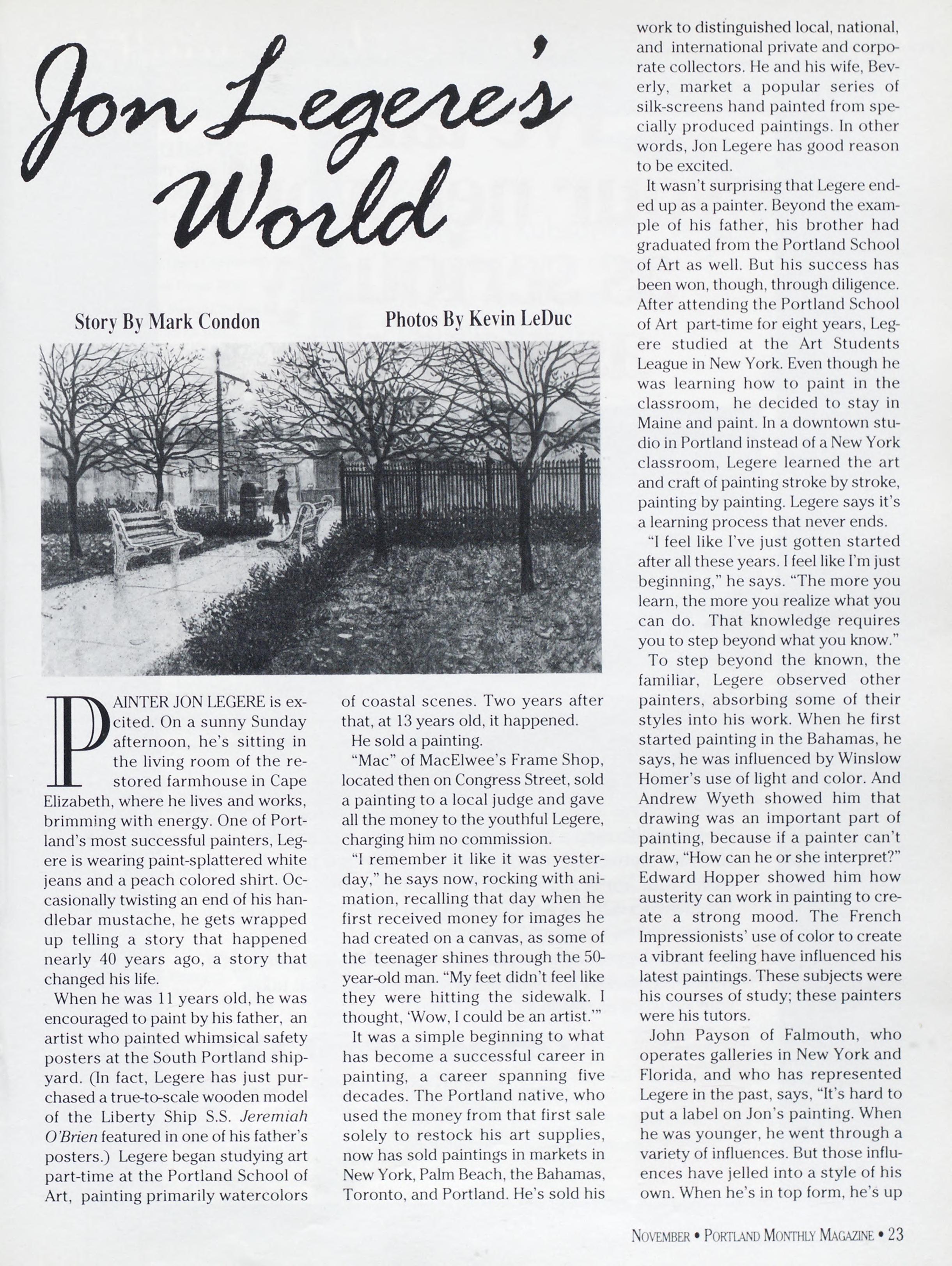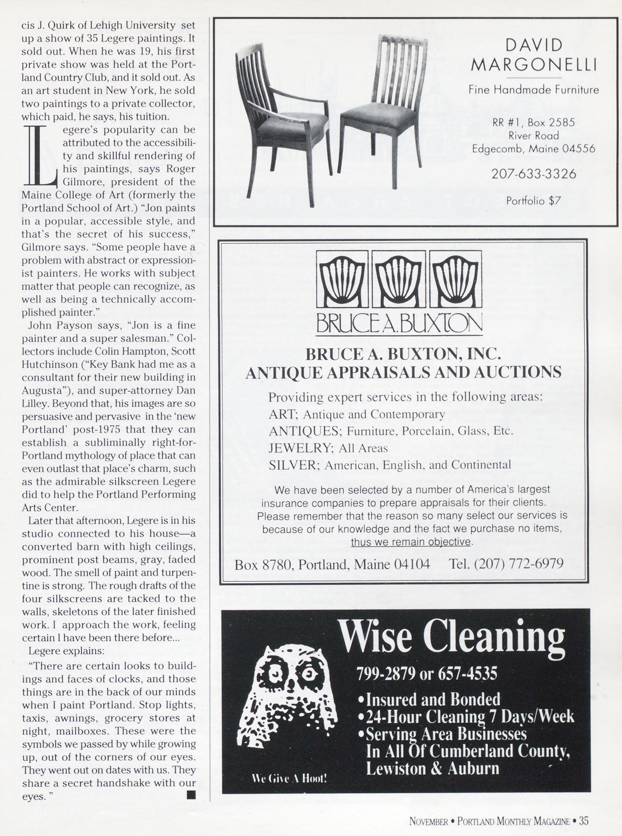 ““I- egere’s popularity can be attributedtotheaccessibili¬ tyandskillfulrenderingof ।hispaintings,saysRoger __l_Gilmore, president of the MaineCollegeofArt(formerlythe PortlandSchoolofArt.)“Jonpaints inapopular,accessiblestyle,and that’sthesecretofhissuccess,” Gilmoresays.“Somepeoplehavea problemwithabstractorexpression¬ istpainters.Heworkswithsubject matterthatpeoplecanrecognize,as wellasbeingatechnicallyaccom¬ plishedpainter.”
