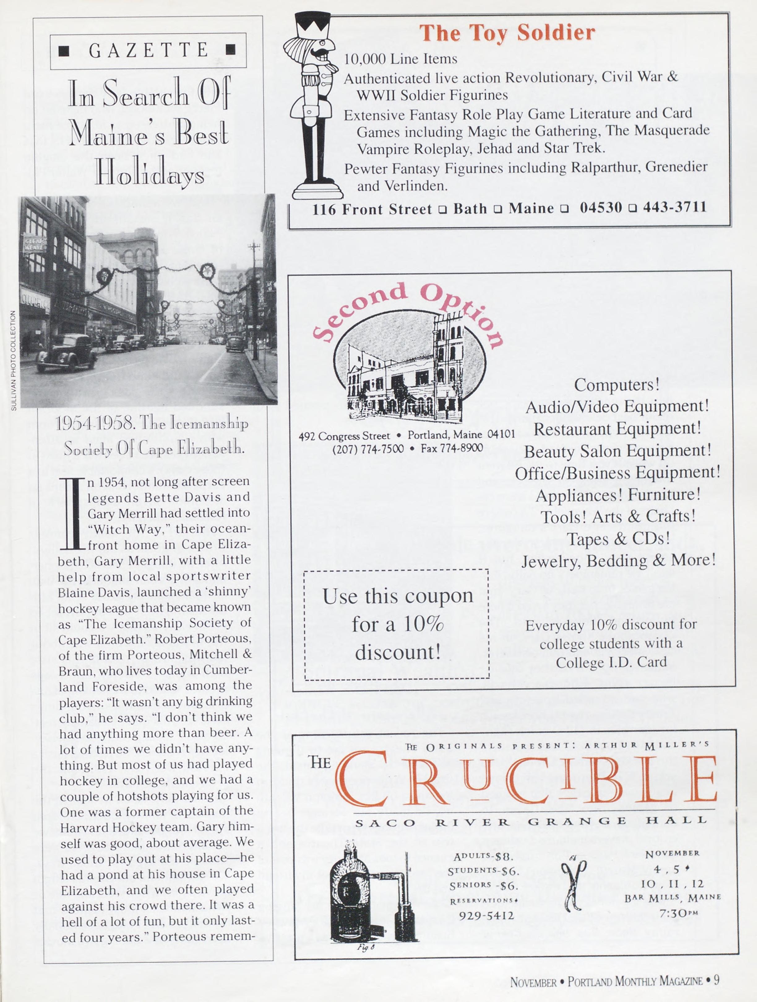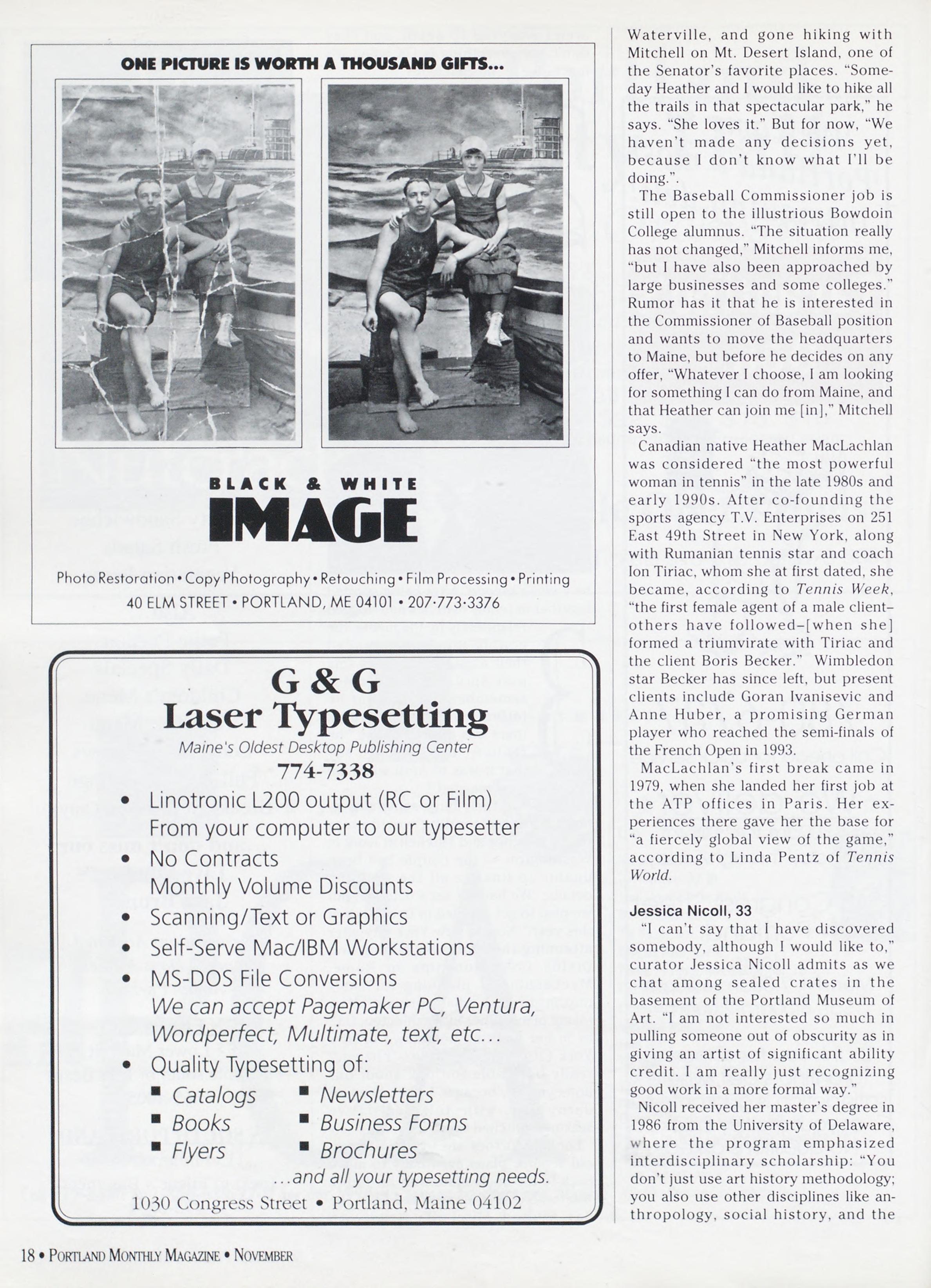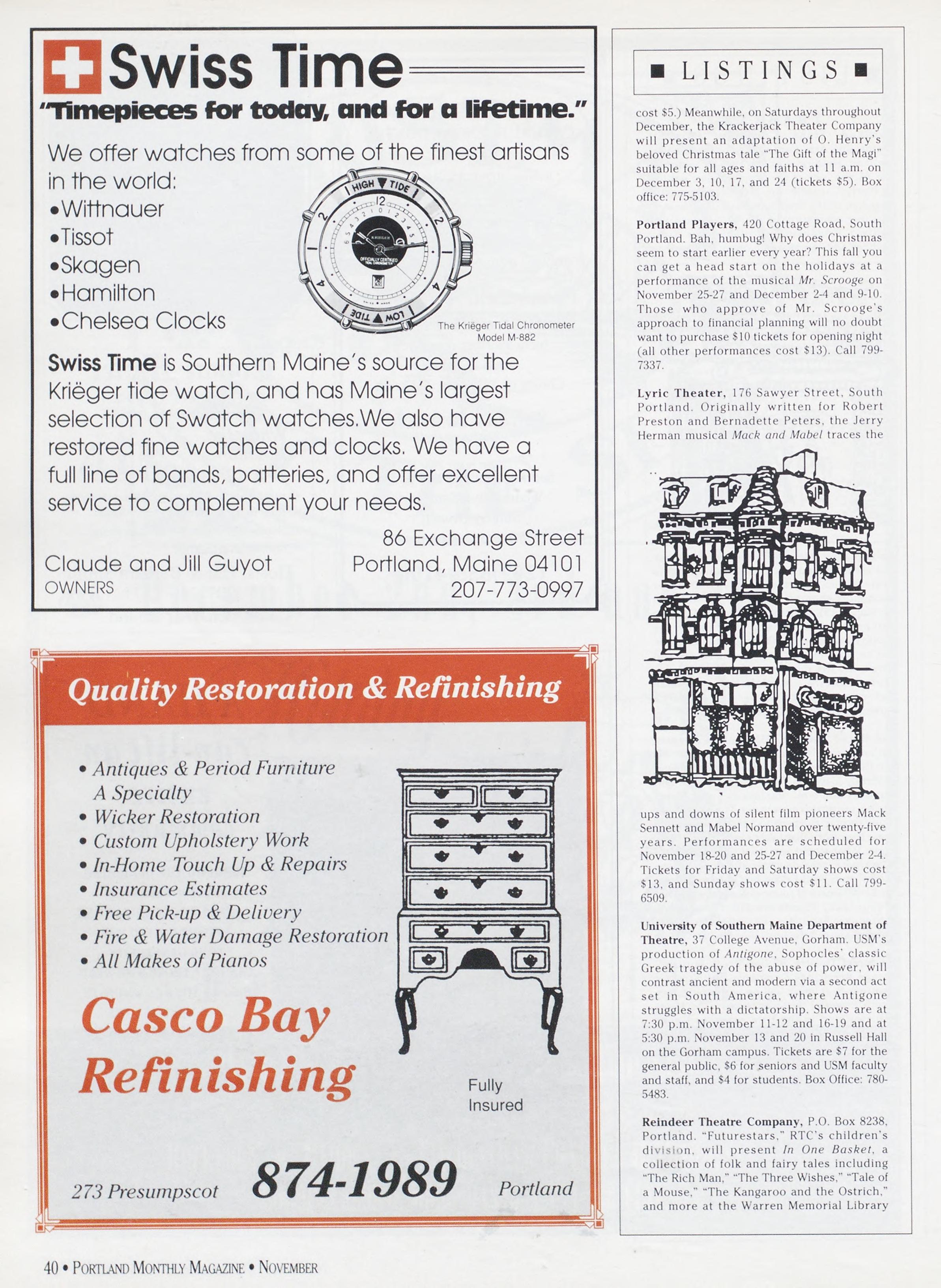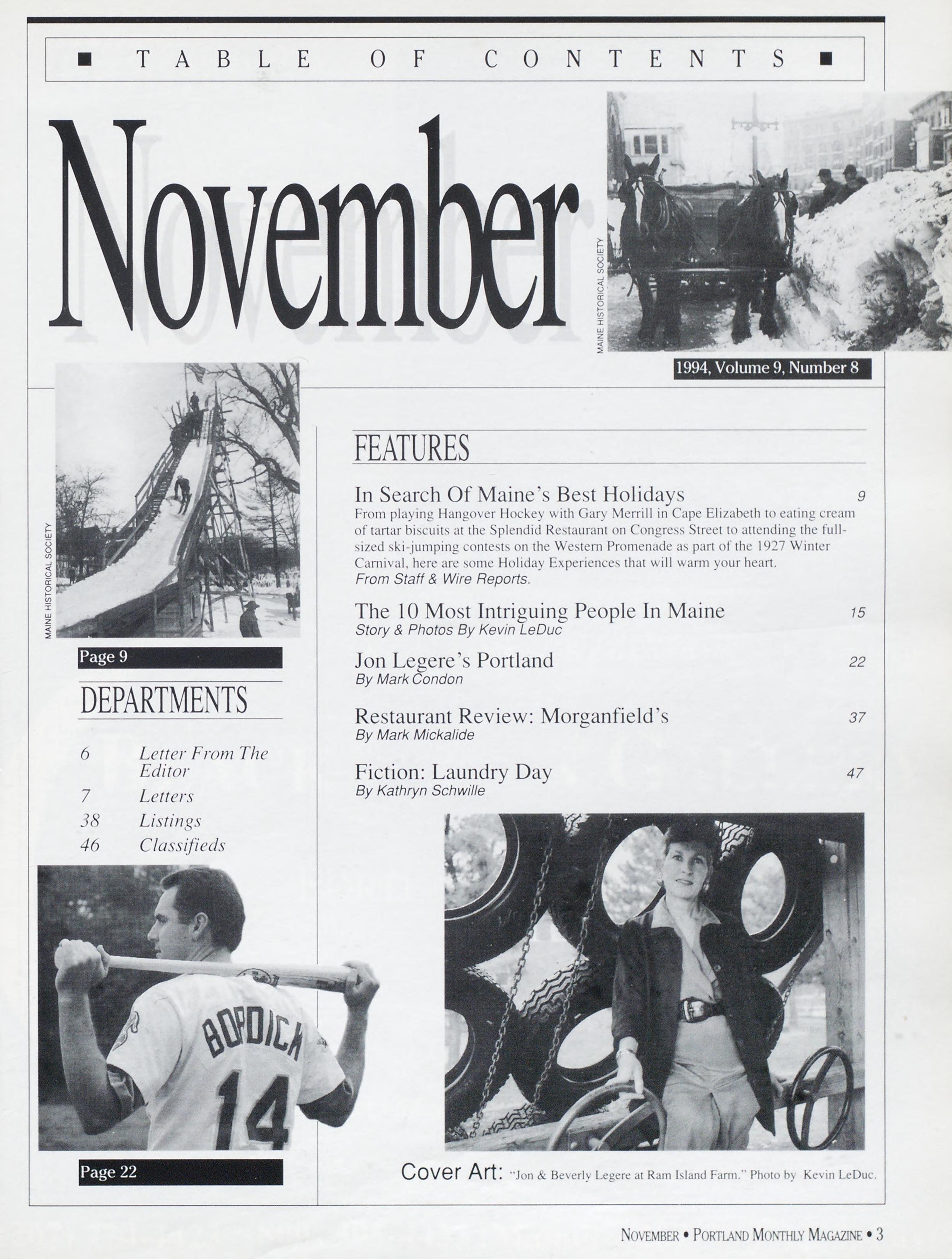 Newsstand Cover Date: November 1994. pub¬ lished September 1994. Vol. 9. No. 8. copyright 1994 Portland Magazine is mailed at third-class mail rates in Portland. ME 04101 (ISSN: 08875340). Opinions expressed in articles are those of authors and do not represent editorial portions of Portland Magazine. Responsible only for that portion of any advertisement which is printed incorrectly, and as compensation we will run a correction in the following issue. Nothing in this issue may be reprinted in whole or in pan with¬ out written permission from the publishers. Sub¬ missions welcome, but we take no rsponsibi111y for unsolicited materials.