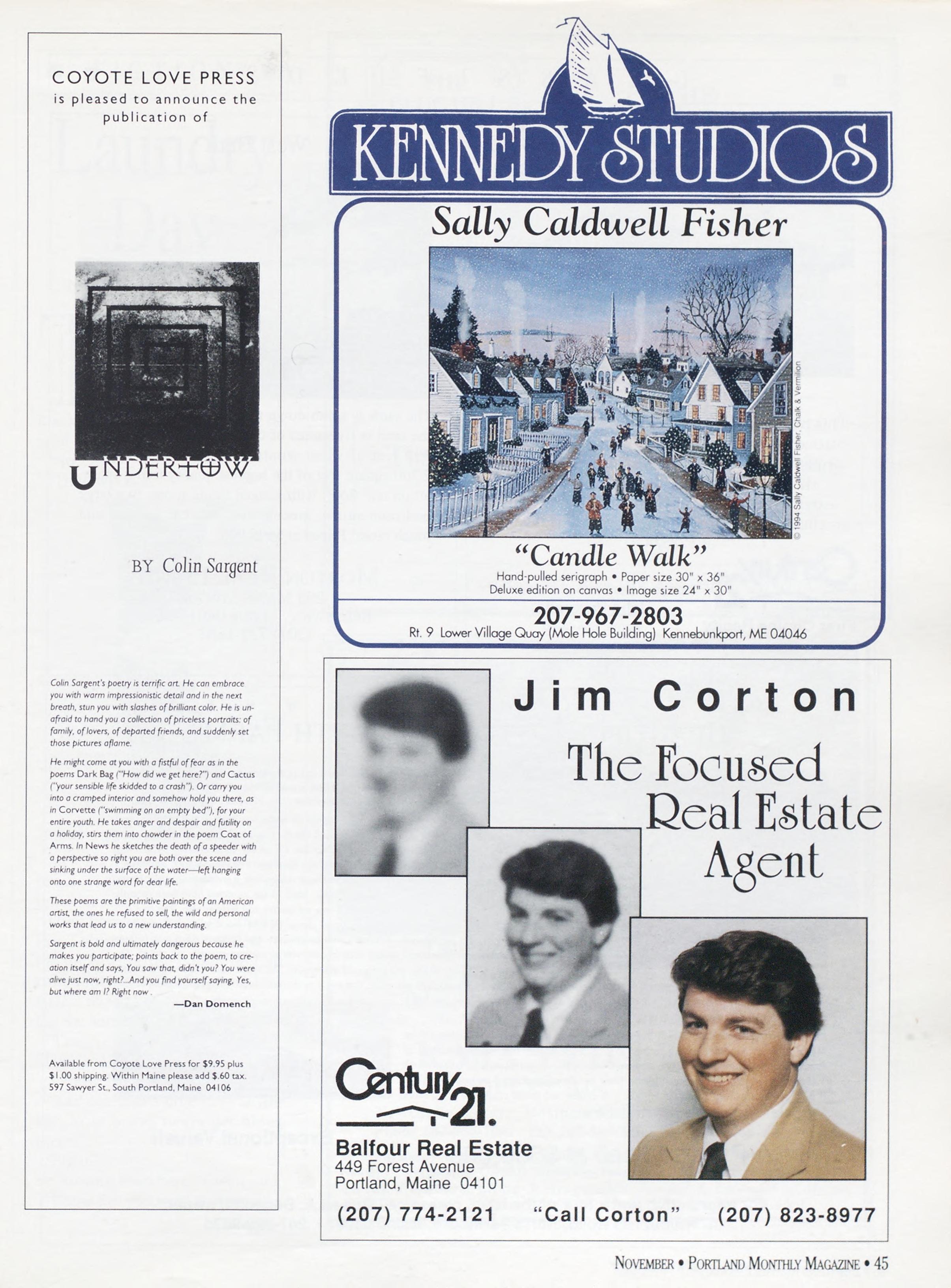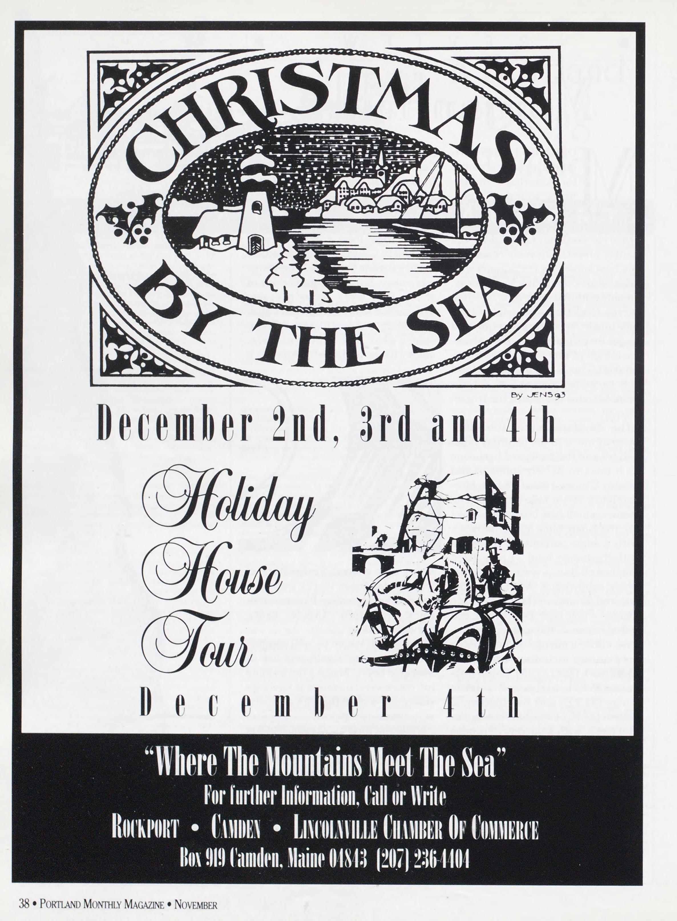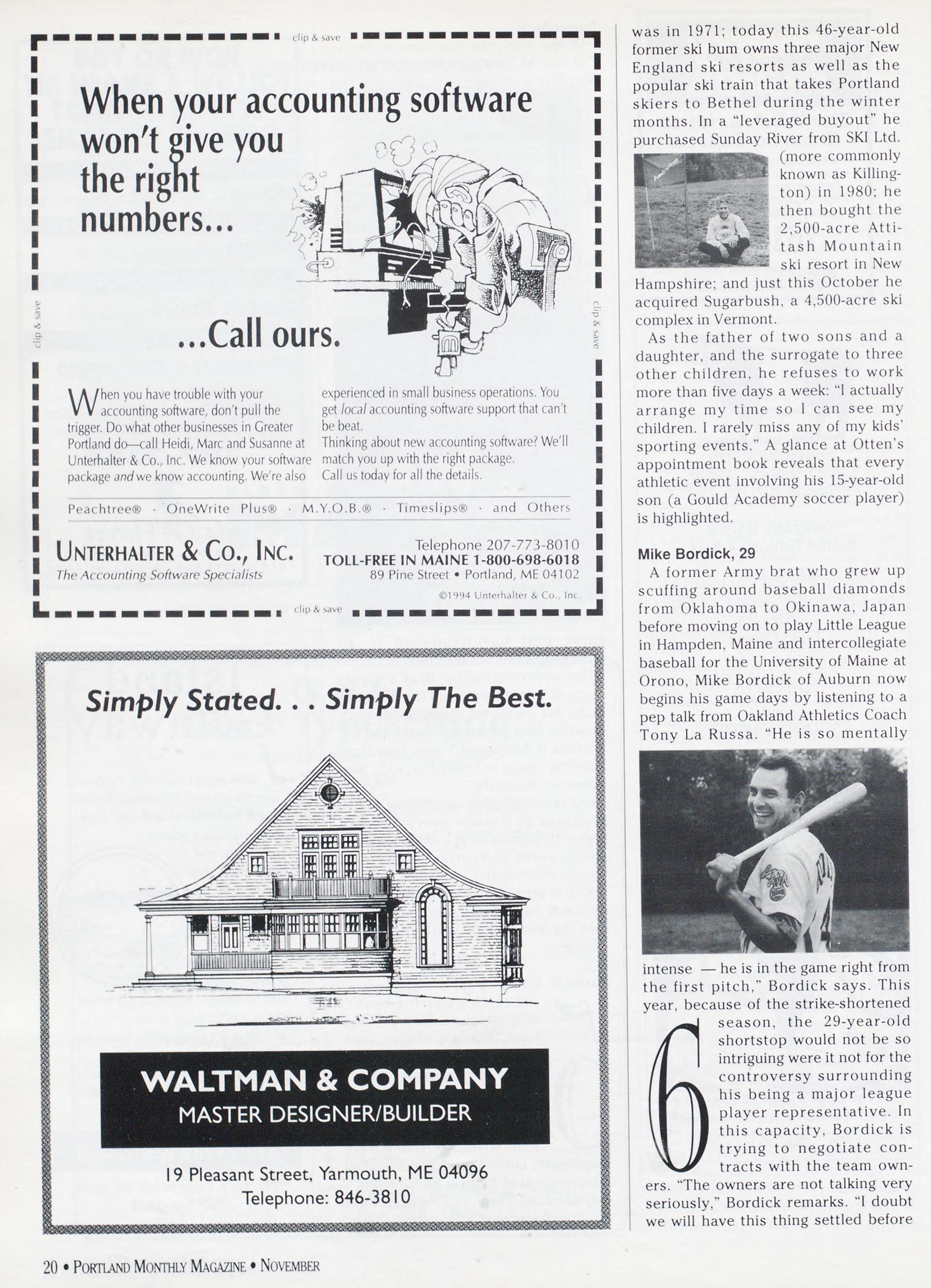 Newsstand Cover Date: November 1994. pub¬ lished September 1994. Vol. 9. No. 8. copyright 1994 Portland Magazine is mailed at third-class mail rates in Portland. ME 04101 (ISSN: 08875340). Opinions expressed in articles are those of authors and do not represent editorial portions of Portland Magazine. Responsible only for that portion of any advertisement which is printed incorrectly, and as compensation we will run a correction in the following issue. Nothing in this issue may be reprinted in whole or in pan with¬ out written permission from the publishers. Sub¬ missions welcome, but we take no rsponsibi111y for unsolicited materials.