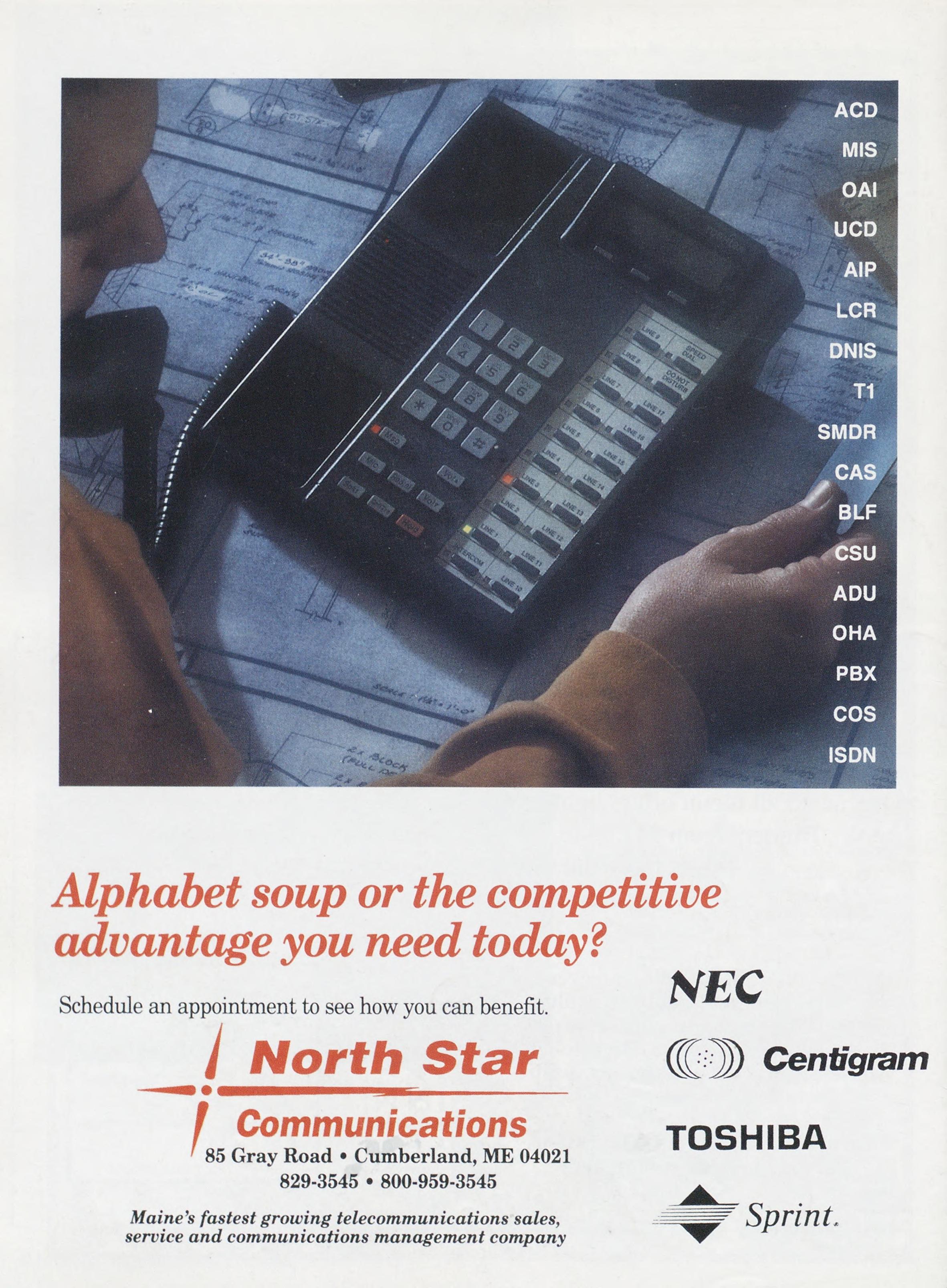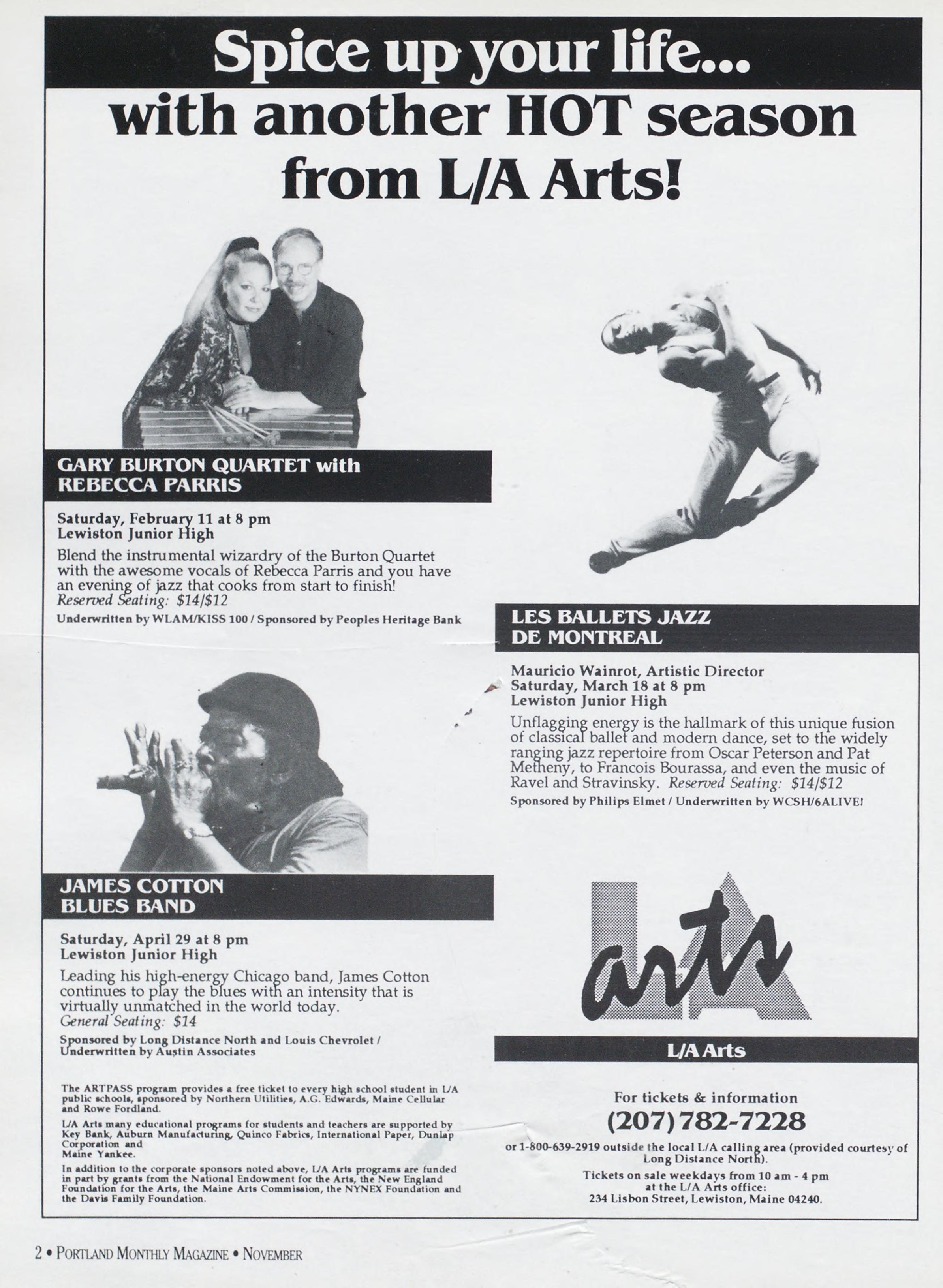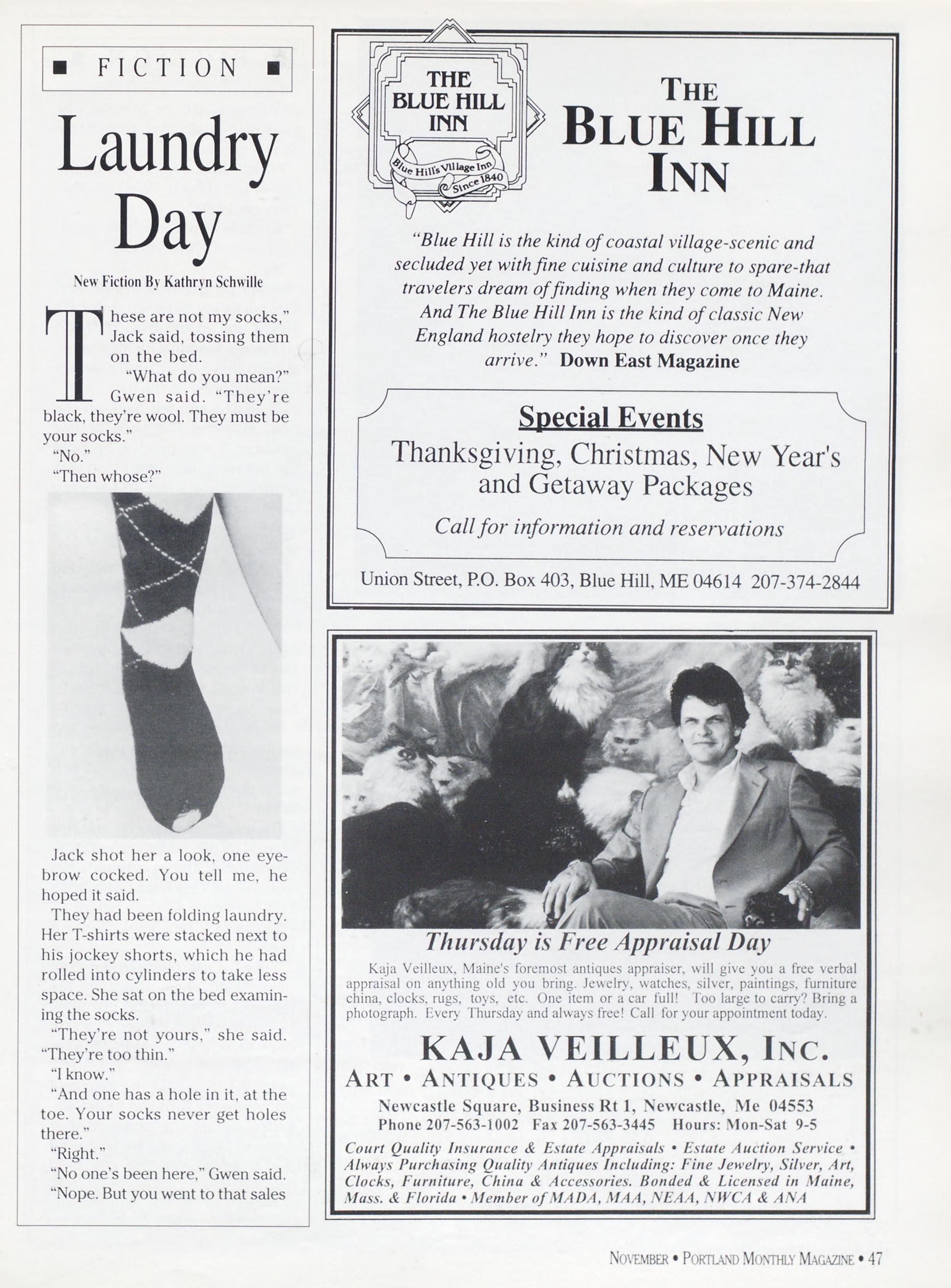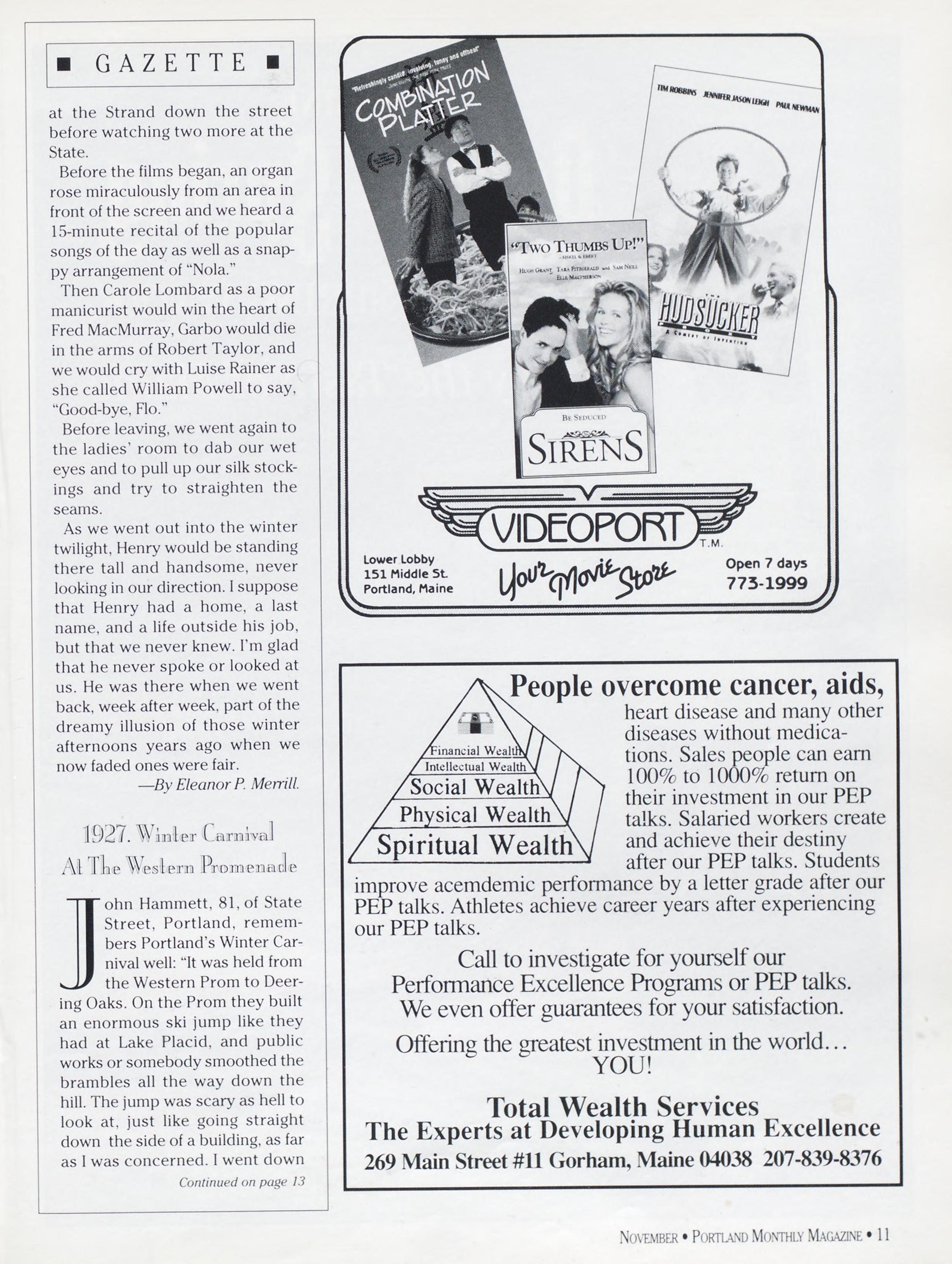 Newsstand Cover Date: November 1994. pub¬ lished September 1994. Vol. 9. No. 8. copyright 1994 Portland Magazine is mailed at third-class mail rates in Portland. ME 04101 (ISSN: 08875340). Opinions expressed in articles are those of authors and do not represent editorial portions of Portland Magazine. Responsible only for that portion of any advertisement which is printed incorrectly, and as compensation we will run a correction in the following issue. Nothing in this issue may be reprinted in whole or in pan with¬ out written permission from the publishers. Sub¬ missions welcome, but we take no rsponsibi111y for unsolicited materials.