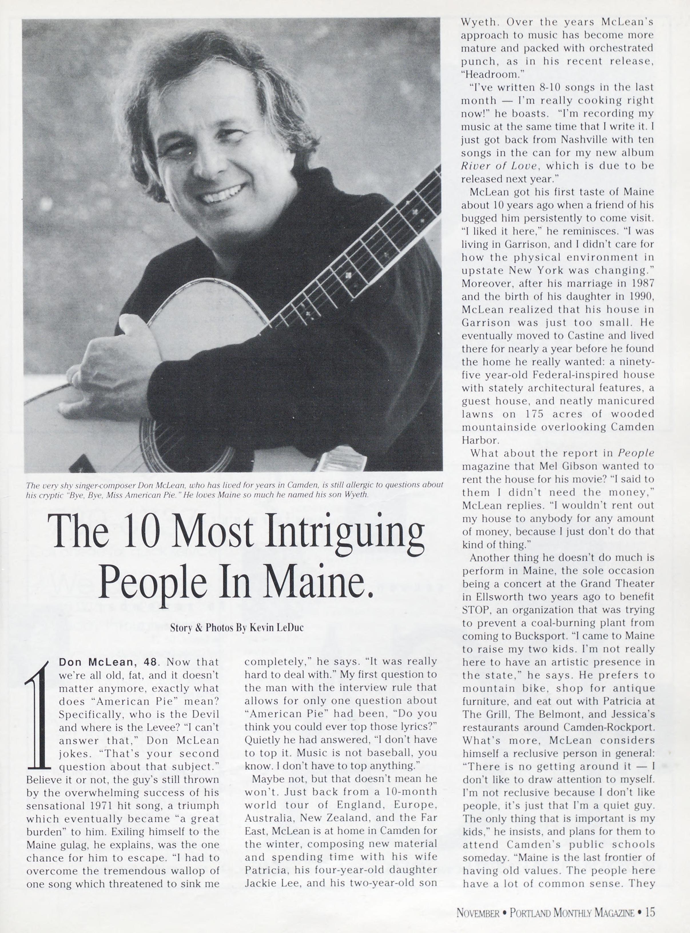 Anotherthinghedoesn’tdomuchis performinMaine,thesoleoccasion beingaconcertattheGrandTheater inEllsworthtwoyearsagotobenefit STOP,anorganizationthatwastrying topreventacoal-burningplantfrom comingtoBucksport.“IcametoMaine toraisemytwokids.I’mnotreally heretohaveanartisticpresencein thestate,”hesays.Heprefersto mountain bike, shop for antique furniture,andeatoutwithPatriciaat TheGrill,TheBelmont,andJessica’s restaurantsaroundCamden-Rockport. What’s more, McLean considers himselfareclusivepersoningeneral: “Thereisnogettingaroundit—I don'tliketodrawattentiontomyself. I'mnotreclusivebecauseIdon'tlike people,it’sjustthatI’maquietguy. Theonlythingthatisimportantismy kids,”heinsists,andplansforthemto attend Camden's public schools someday.“Maineisthelastfrontierof havingoldvalues.Thepeoplehere have a lot of common sense. They