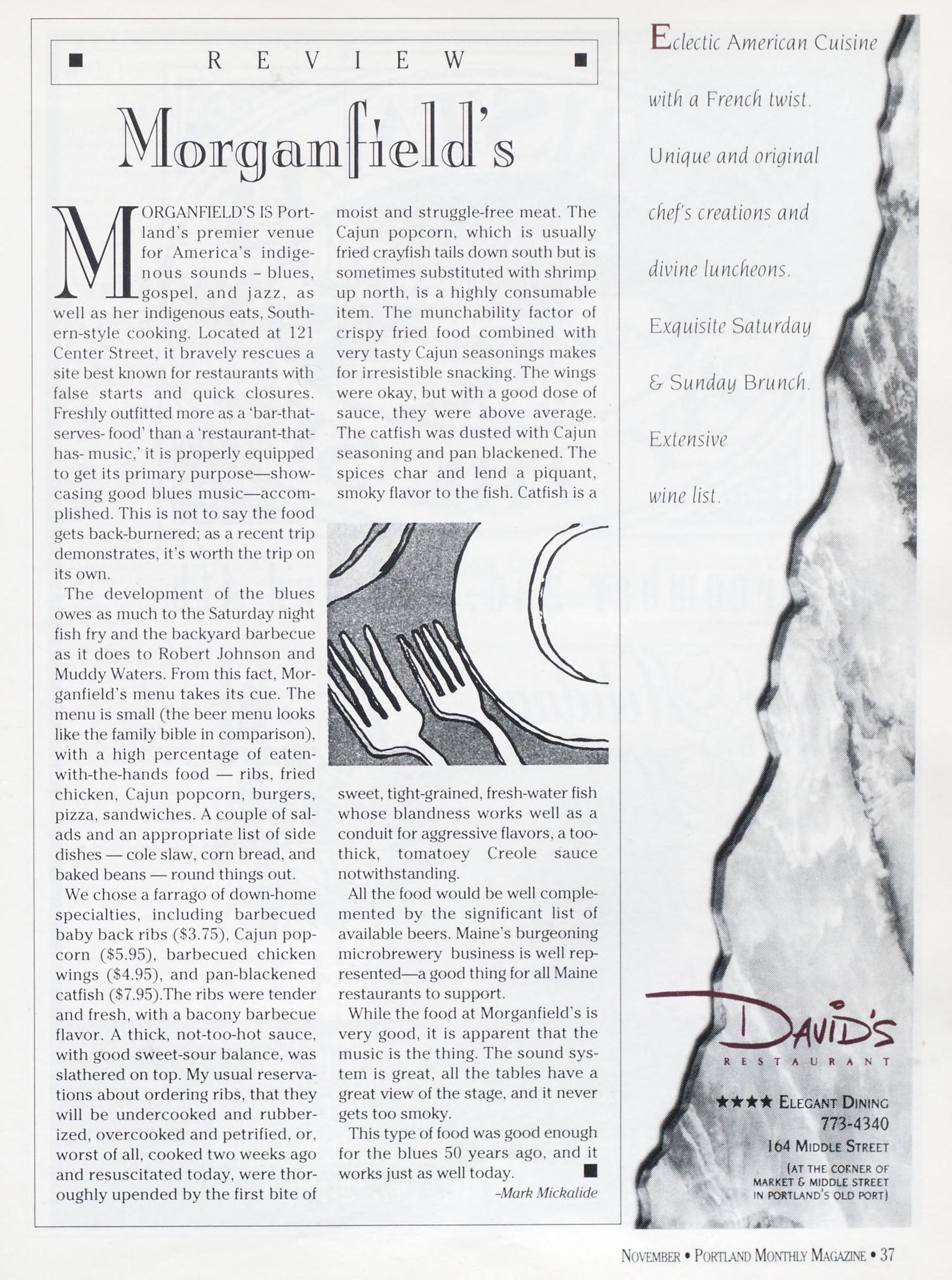 /f" ORGANFIELD’SISPort¬ land’s premier venue forAmerica’sindige¬ nous sounds - blues, __Lgospel, and jazz, as wellasherindigenouseats,South¬ ern-stylecooking.Locatedat121 CenterStreet,itbravelyrescuesa sitebestknownforrestaurantswith falsestartsandquickclosures. Freshlyoutfittedmoreasa‘bar-thatserves-food’thana‘restaurant-thathas-music,’itisproperlyequipped togetitsprimarypurpose—show¬ casing good blues music—accom¬ plished.Thisisnottosaythefood getsback-burnered;asarecenttrip demonstrates,it’sworththetripon itsown.