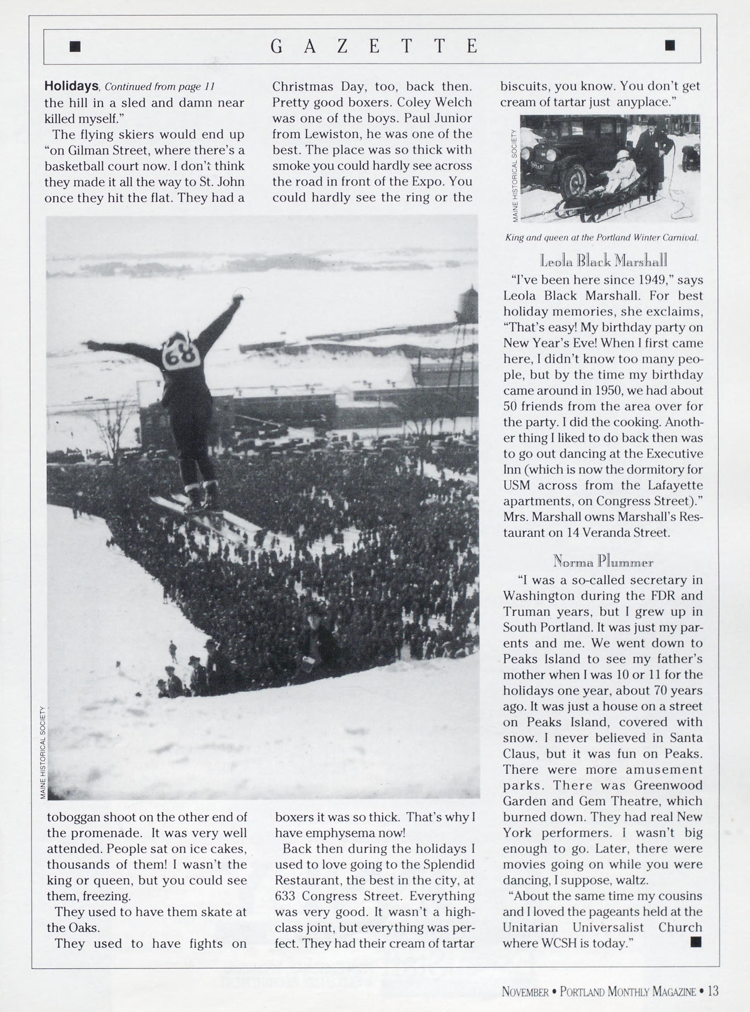 JohnHammett,81,ofState Street, Portland, remem¬ bersPortland’sWinterCar¬ nivalwell:“Itwasheldfrom theWesternPromtoDeer¬ ingOaks.OnthePromtheybuilt anenormousskijumplikethey hadatLakePlacid,andpublic worksorsomebodysmoothedthe brambles all the way down the hill.Thejumpwasscaryashellto lookat,justlikegoingstraight downthesideofabuilding,asfar as1wasconcerned.Iwentdown