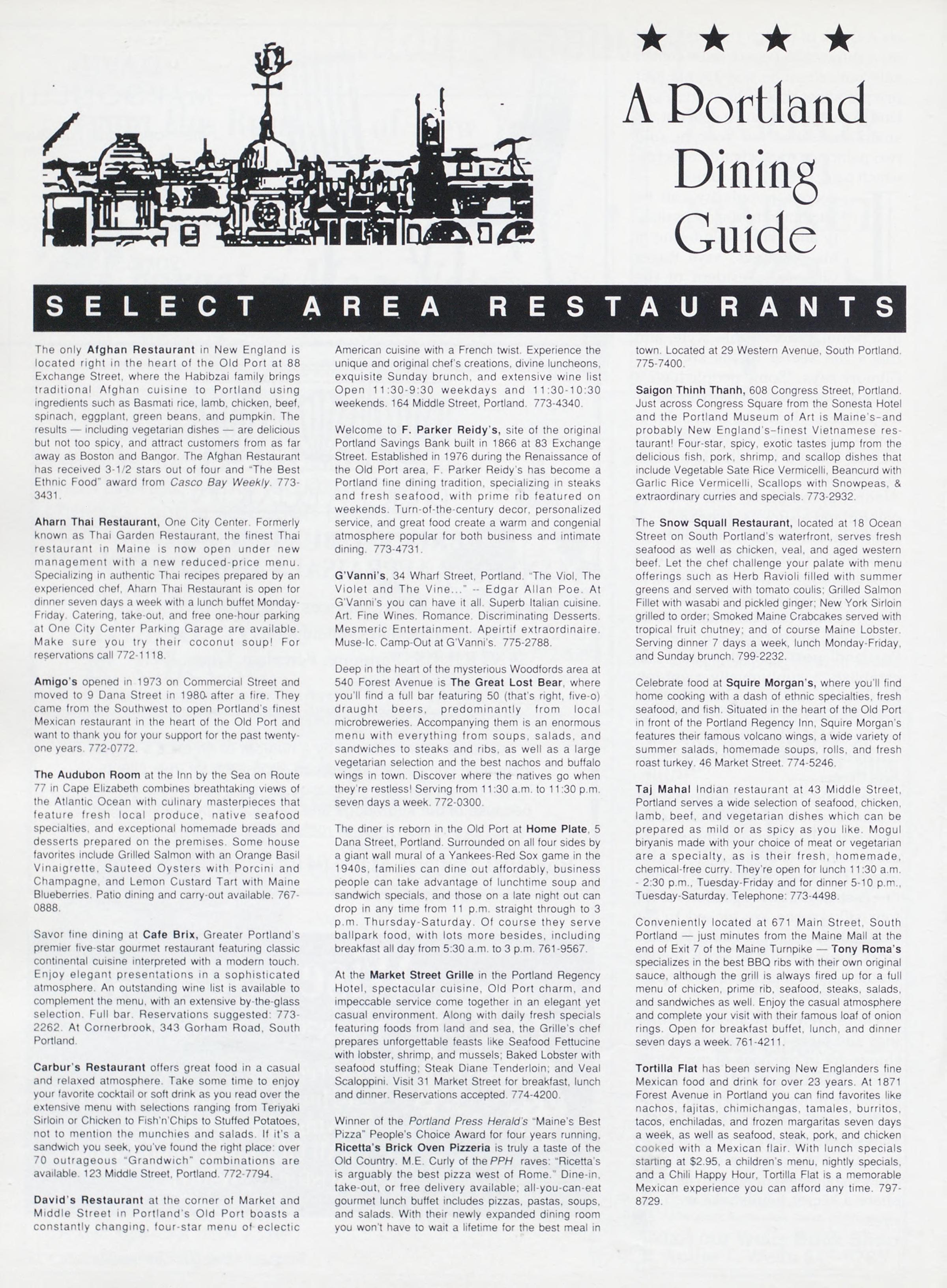 WelcometoF.ParkerReidy’s,siteoftheoriginal PortlandSavingsBankbuiltin1866at83Exchange Street.Establishedin1976duringtheRenaissanceof theOldPortarea.F.ParkerReidy’shasbecomea Portlandfinediningtradition,specializinginsteaks and fresh seafood, with prime rib featured on weekends.Turn-of-the-centurydecor,personalized service,andgreatfoodcreateawarmandcongenial atmospherepopularforbothbusinessandintimate dining.773-4731.